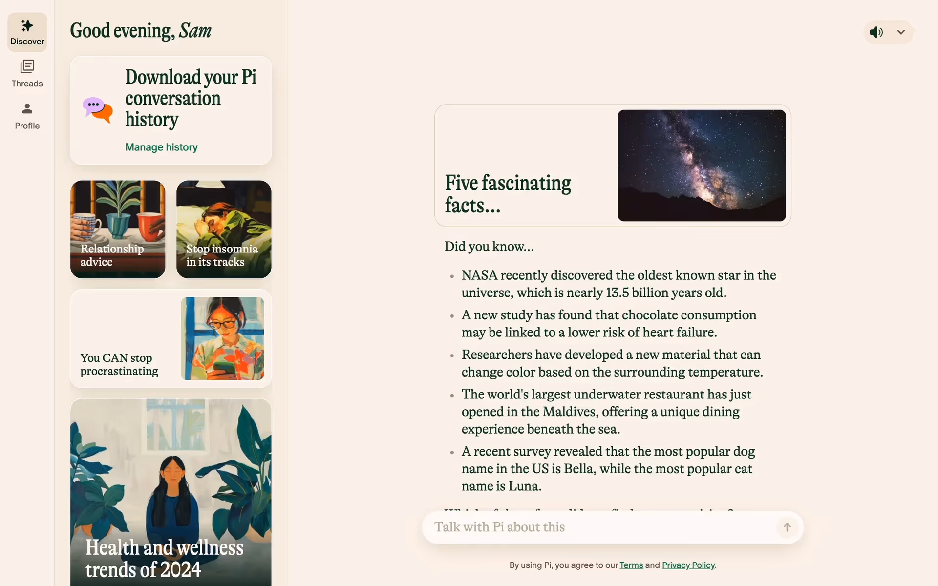 In our analysis, Pi's color palette is key to creating a focused and calming conversation. The signature Apple green encourages interaction and signals progress, while the high-contrast Mine Shaft text on a clean White background keeps your attention squarely on the dialogue.