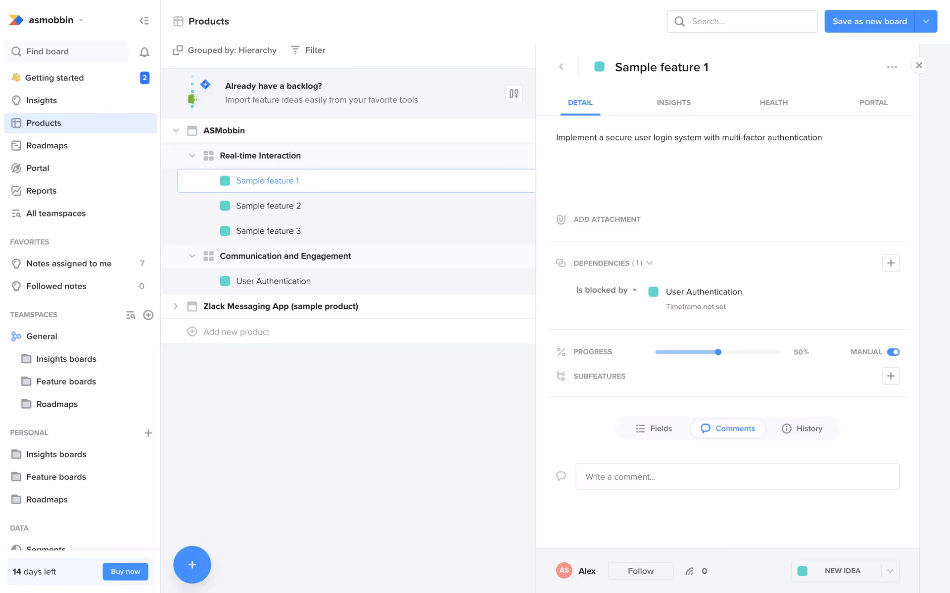 In our analysis, we see Productboard strategically uses Science Blue to guide your actions and highlight key decisions, making the user journey intuitive. The calm foundation of Pickled Bluewood and Athens Gray fosters a focused, professional workspace that minimizes distractions and promotes clarity.