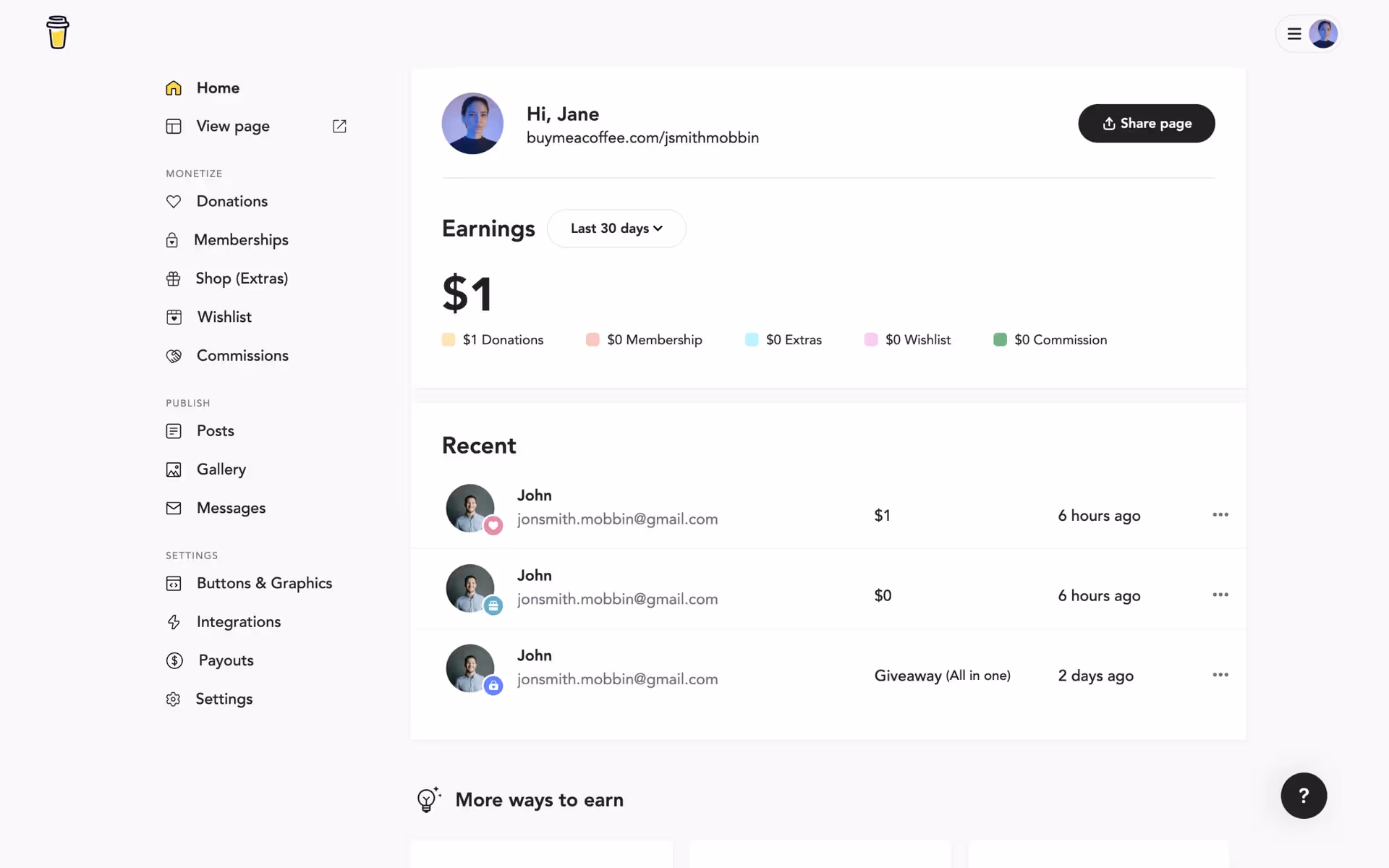 Buy Me a Coffee masterfully uses its vibrant "School bus Yellow" for key CTAs to grab your attention, while the high-contrast "Mine Shaft" and clean "White" create a focused and frictionless path for you to support creators.