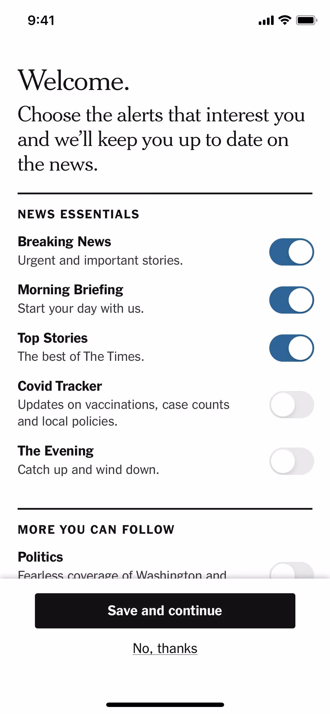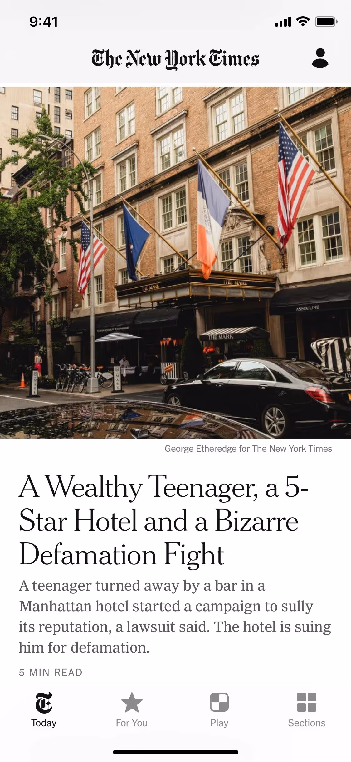 The New York Times masterfully uses its classic black and white to convey authority and enhance readability, while a sparing use of saffron guides your eye to key actions, creating an experience that feels both trustworthy and intuitive.