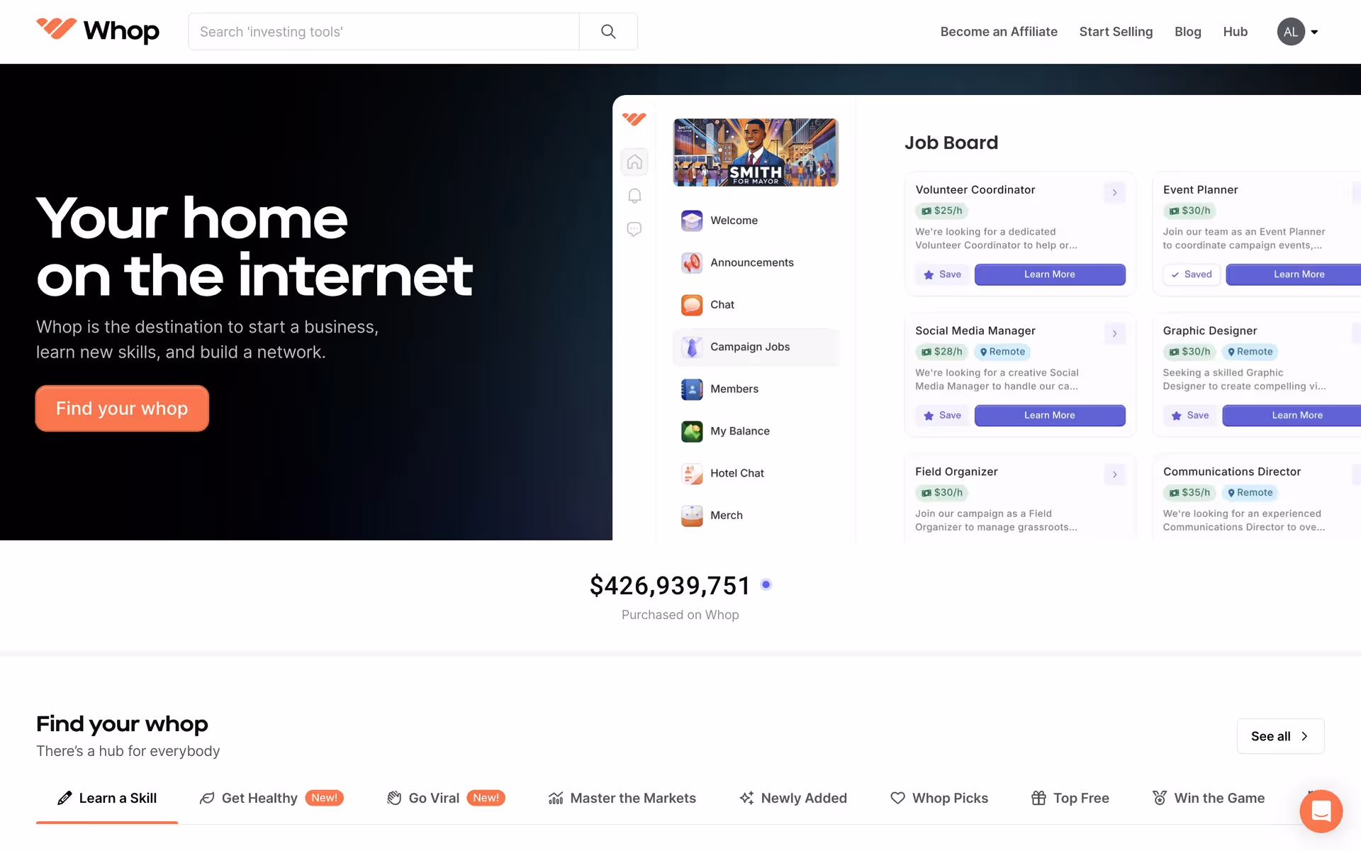 Whop masterfully uses its vibrant Pomegranate to guide your eye toward key actions, making the user journey intuitive and conversion-focused. The ample use of white space creates a clean, modern backdrop that lets the marketplace offerings truly shine.