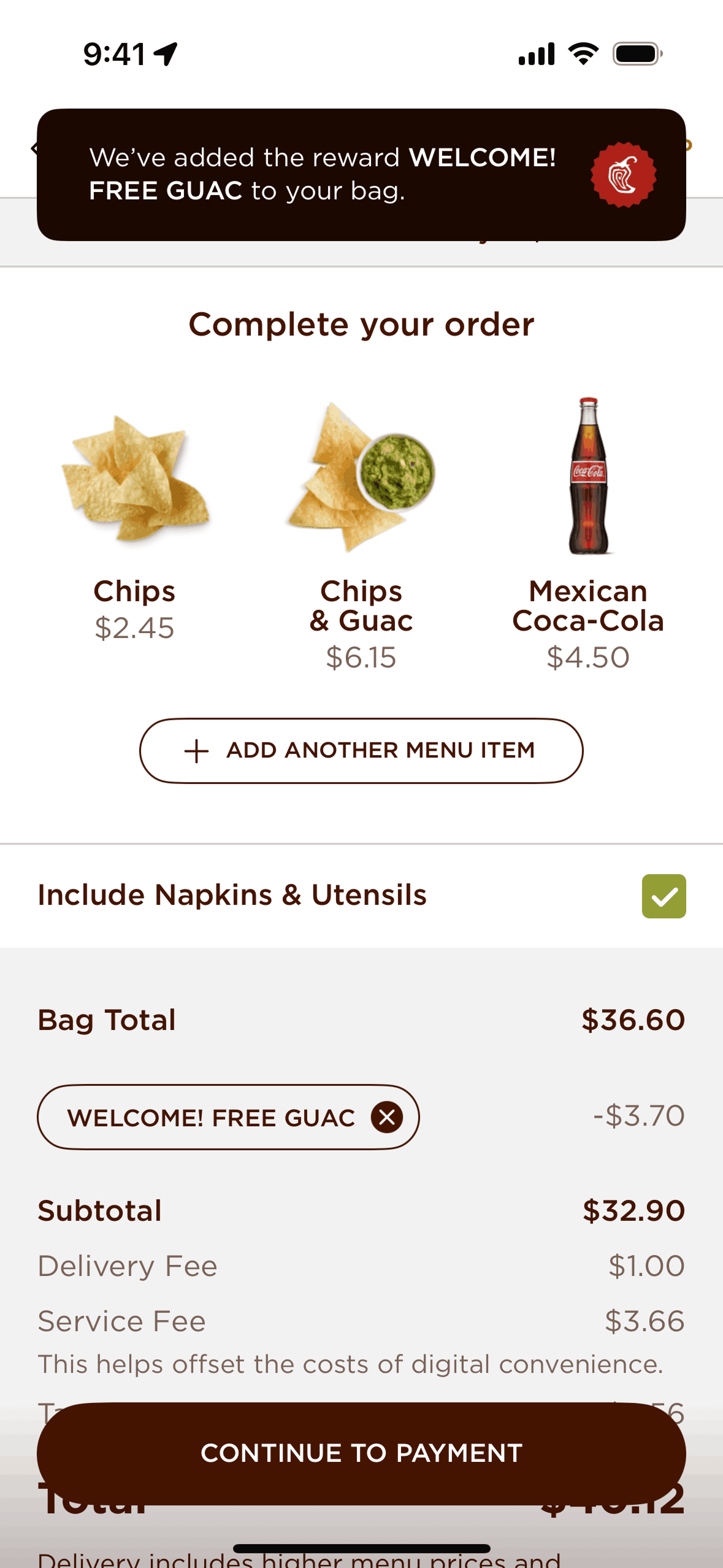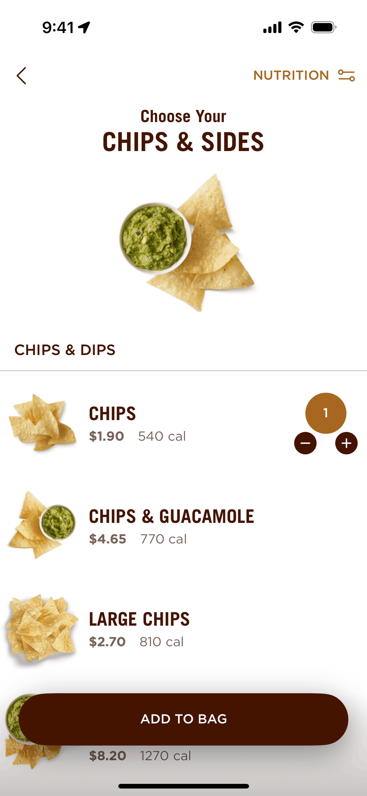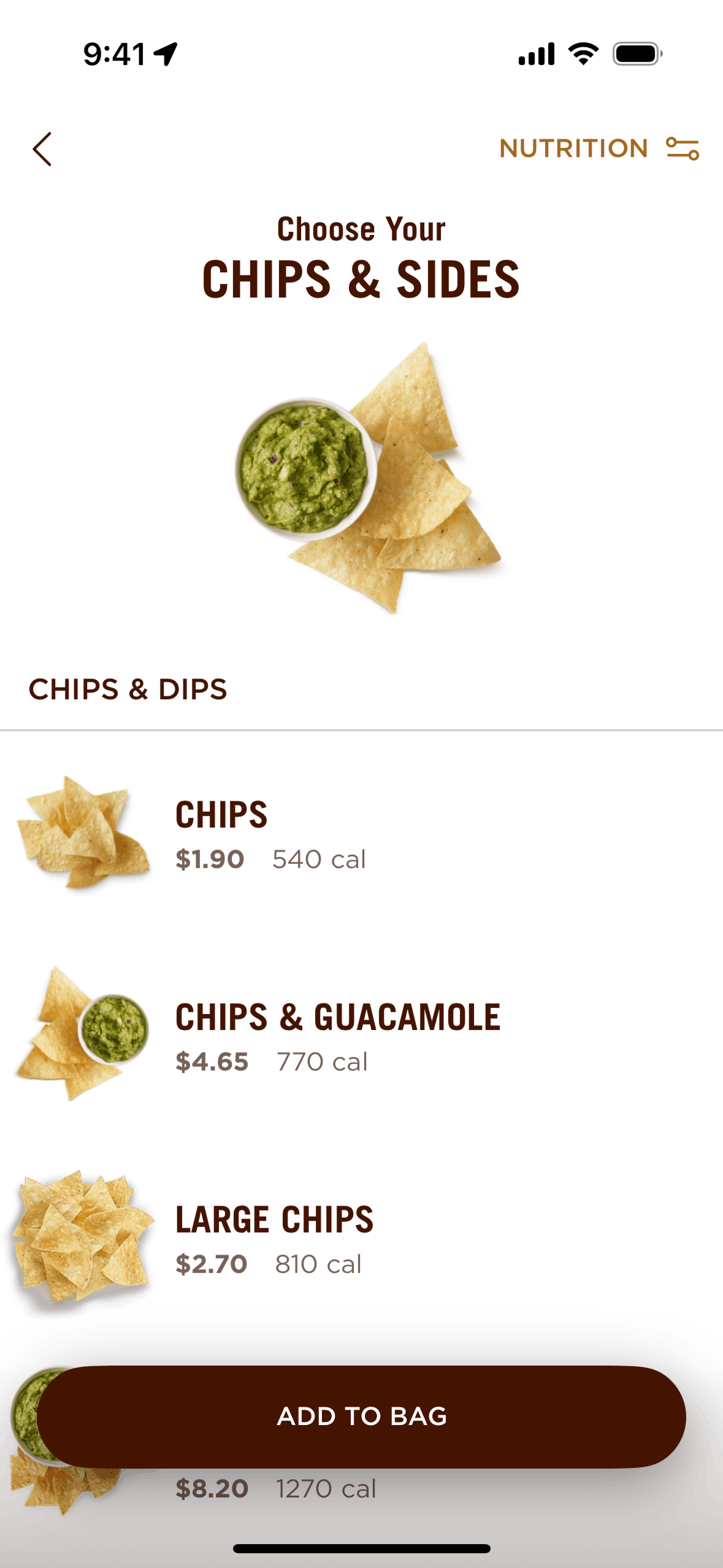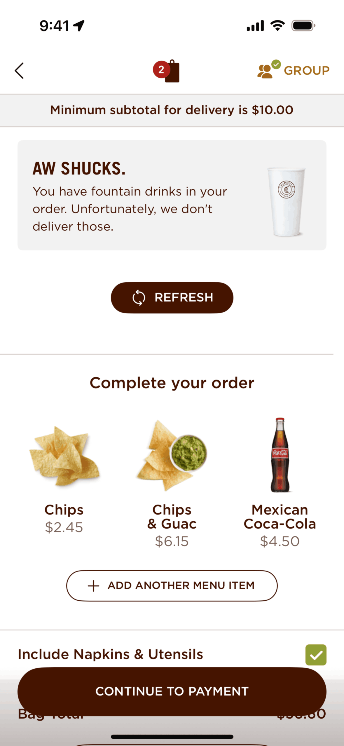 The user flow demonstrates adding a customized burrito and drinks to the bag. It ends with the order summary and option to proceed to payment.