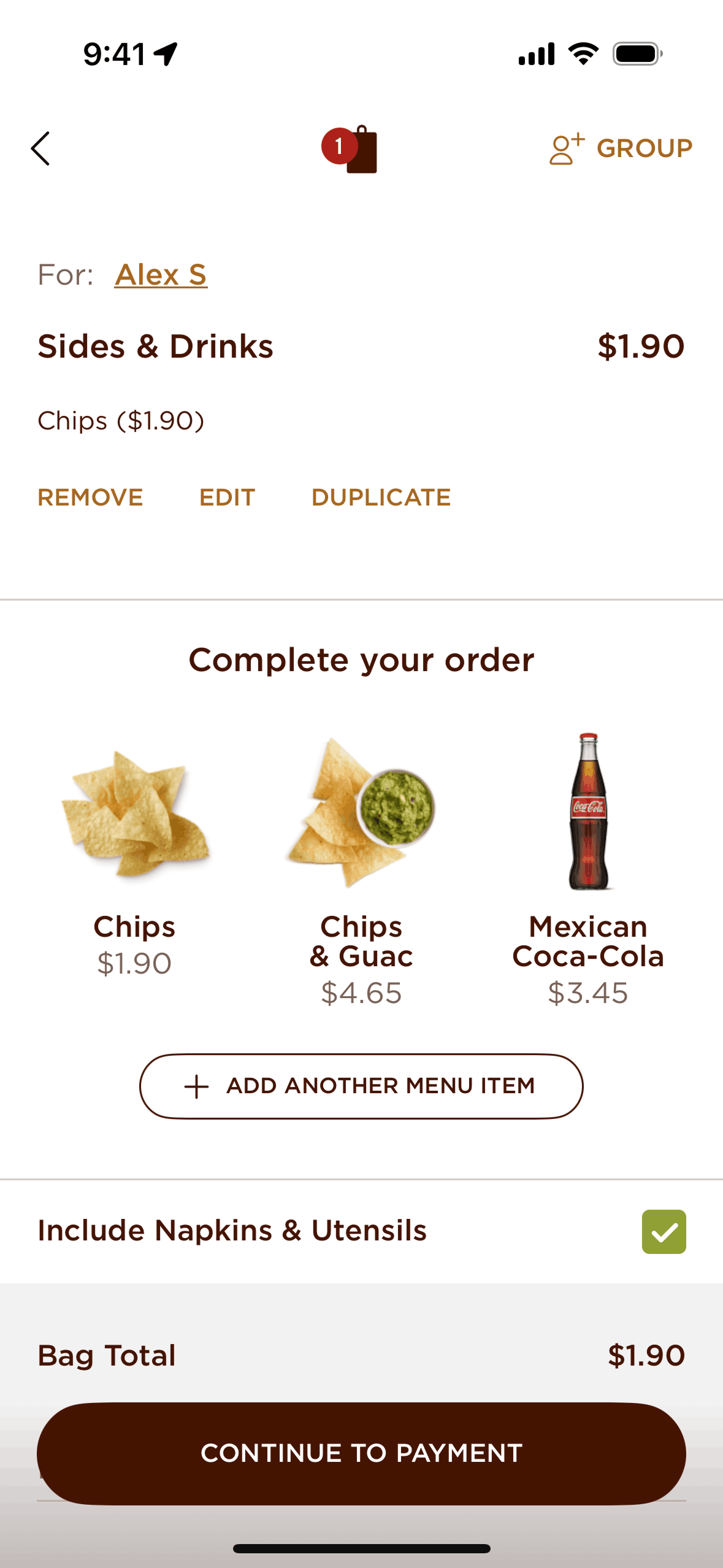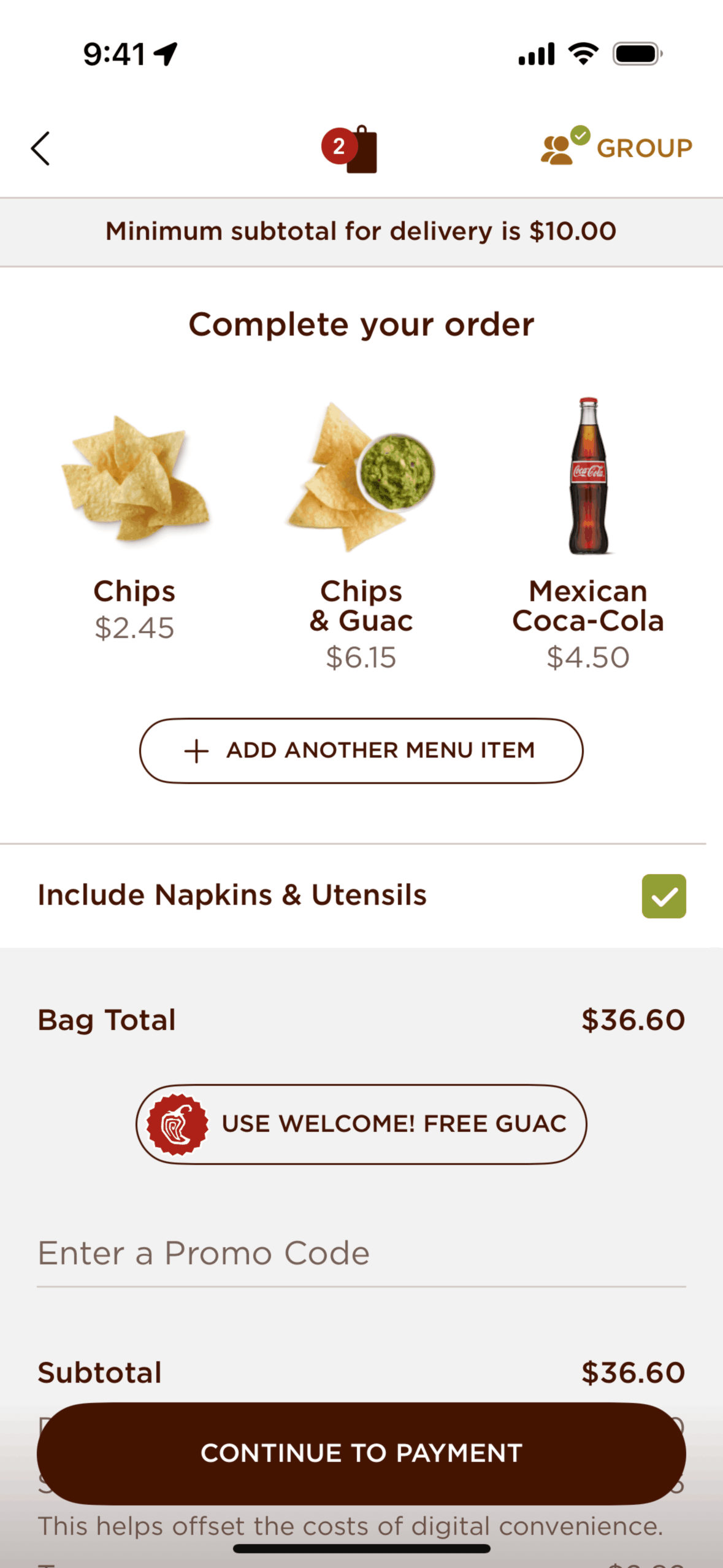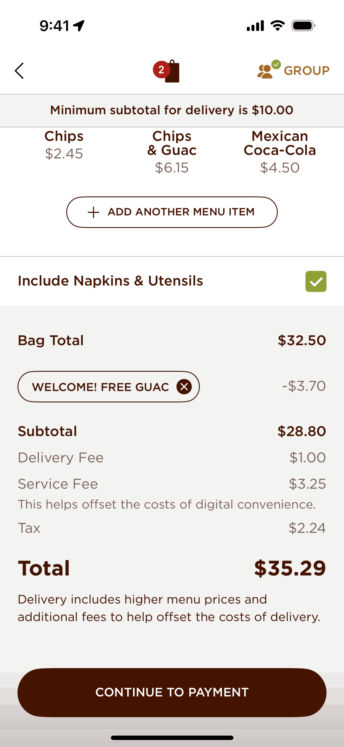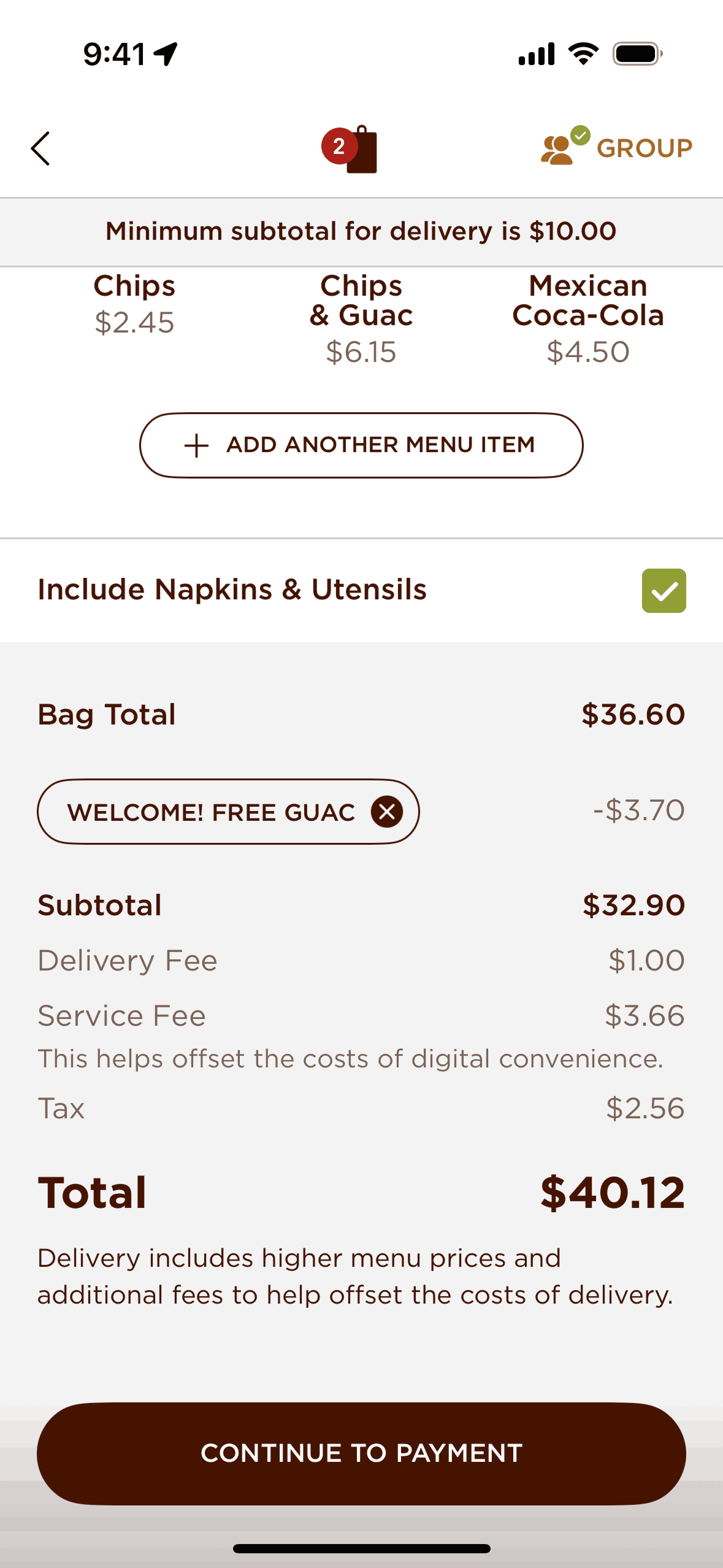 The user flow demonstrates adding a customized burrito and drinks to the bag. It ends with the order summary and option to proceed to payment.
