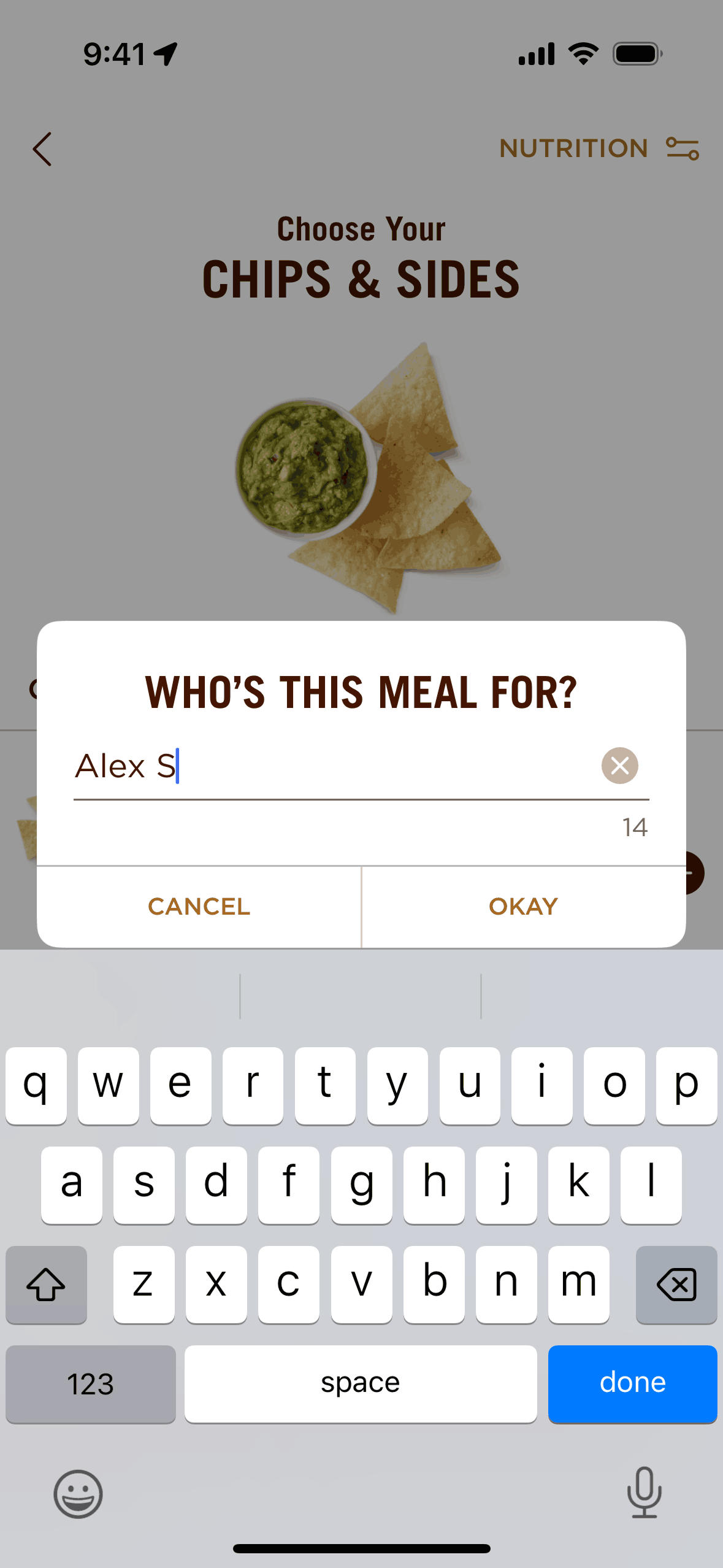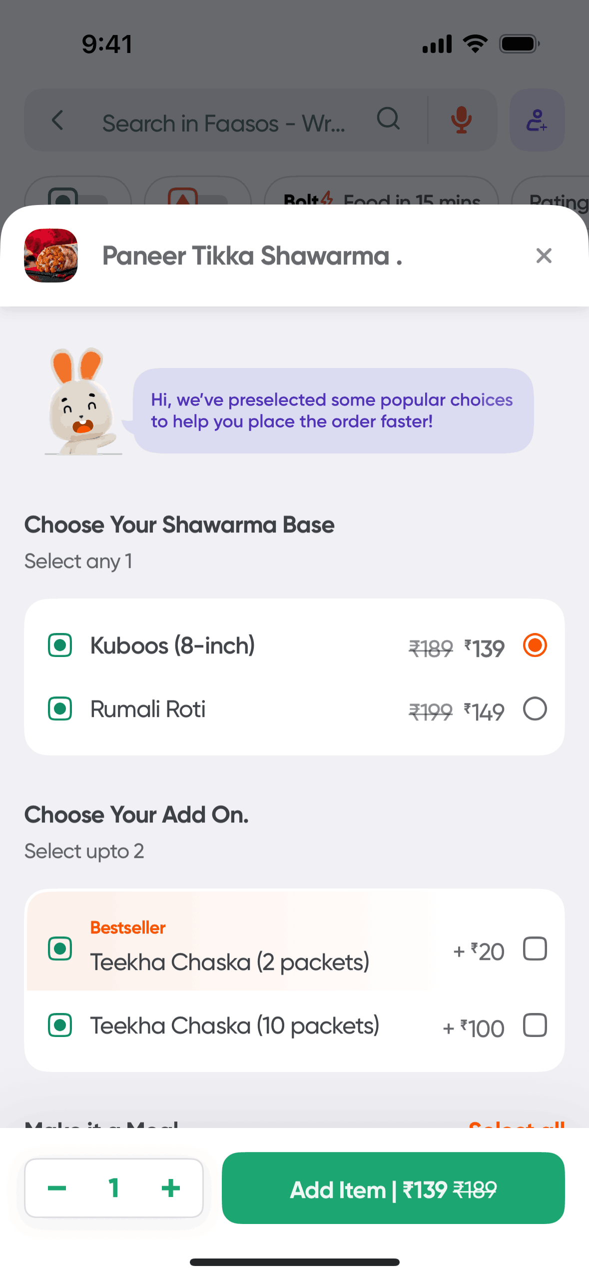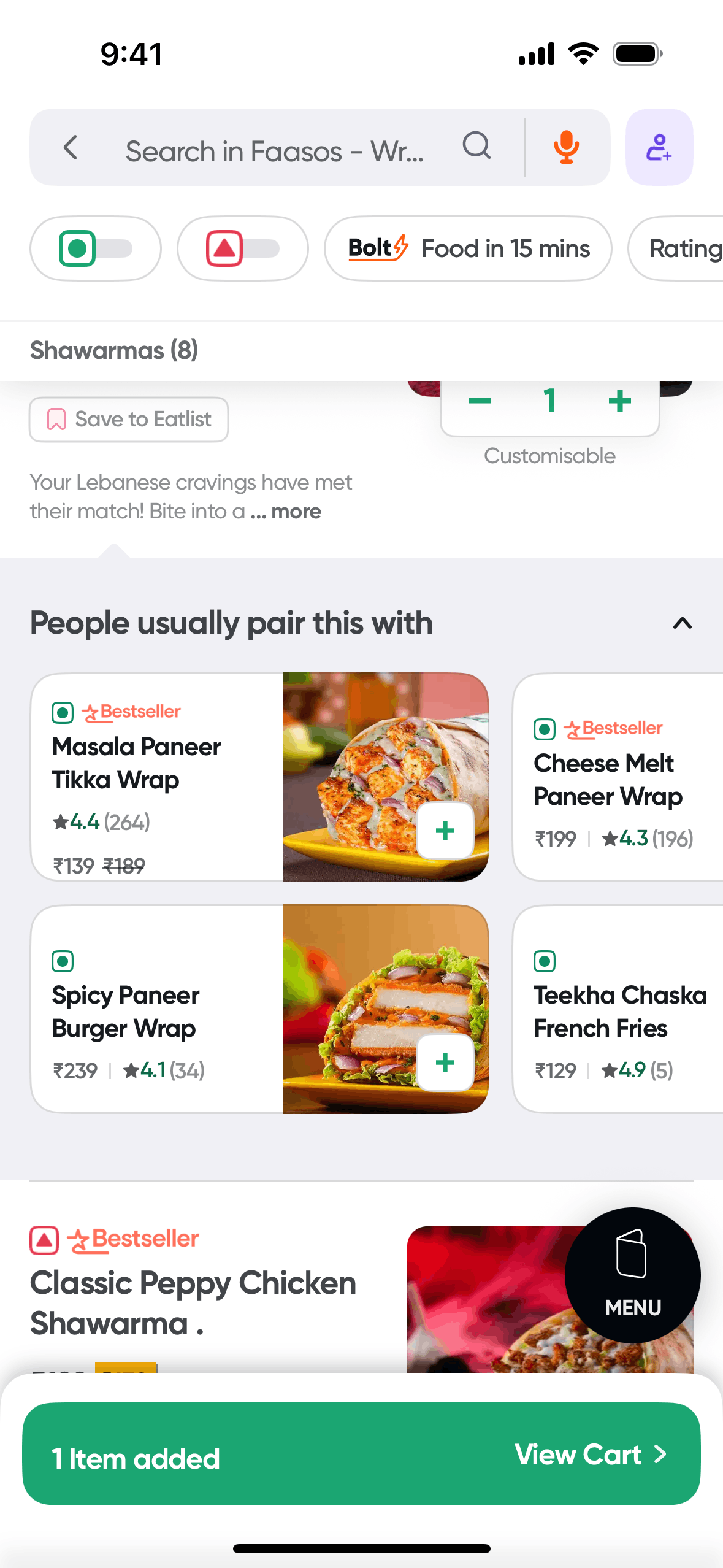 The user browses a menu, customizes a dish, and adds it to their cart. They are then given the option to view their cart.