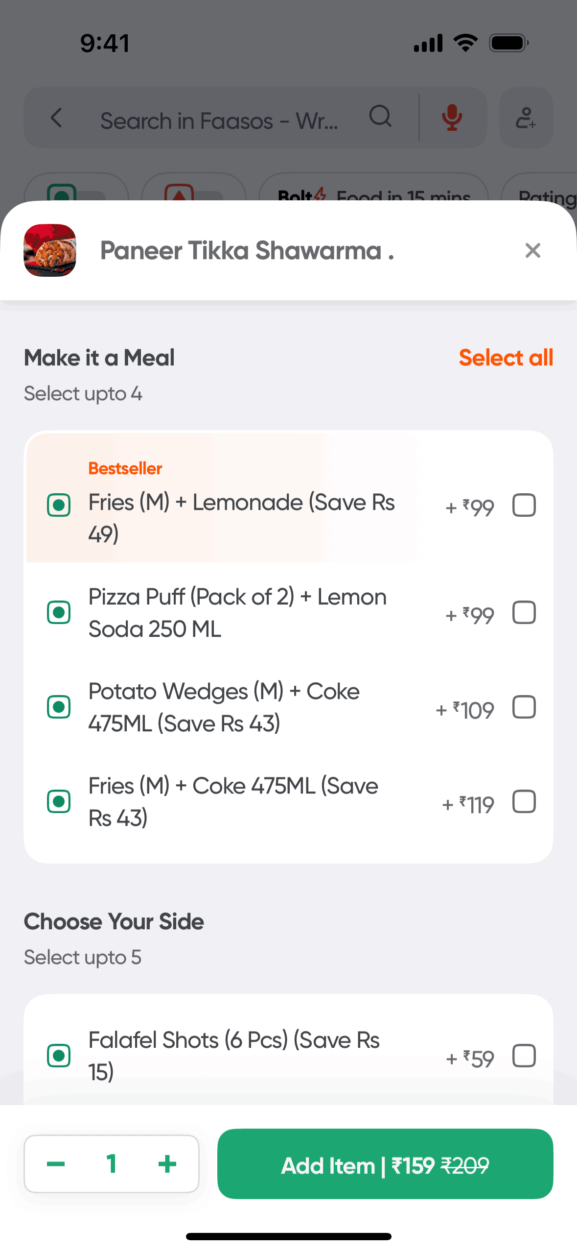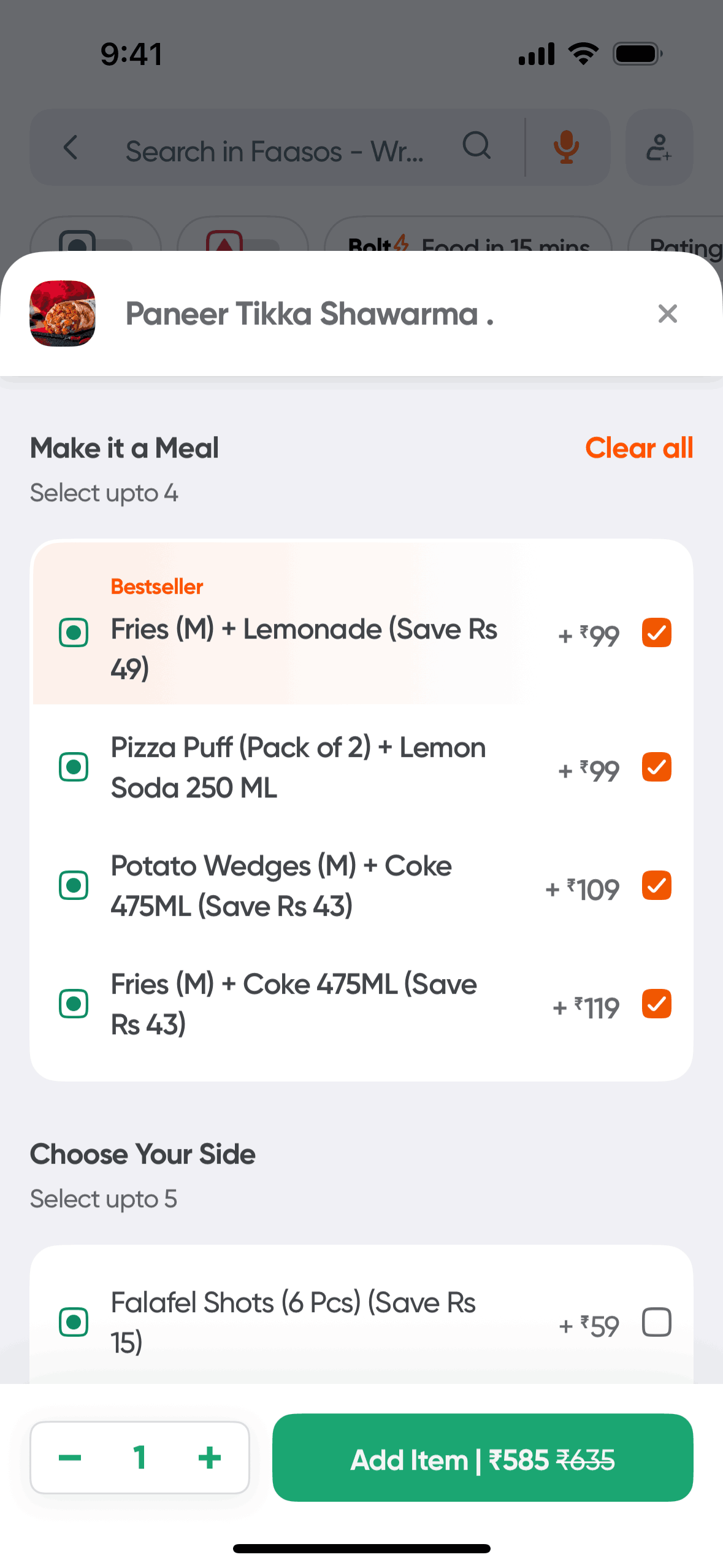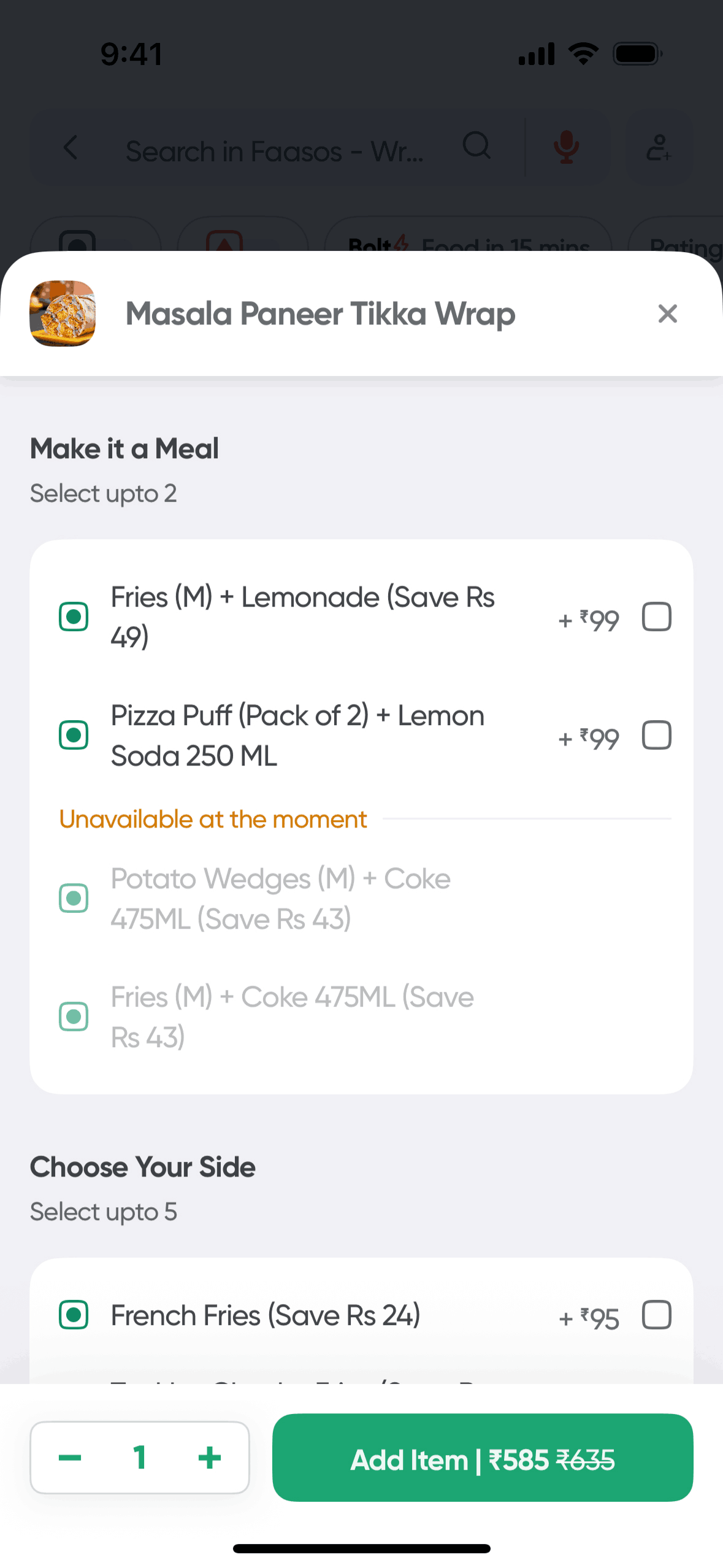The user browses a menu, customizes a dish, and adds it to their cart. They are then given the option to view their cart.