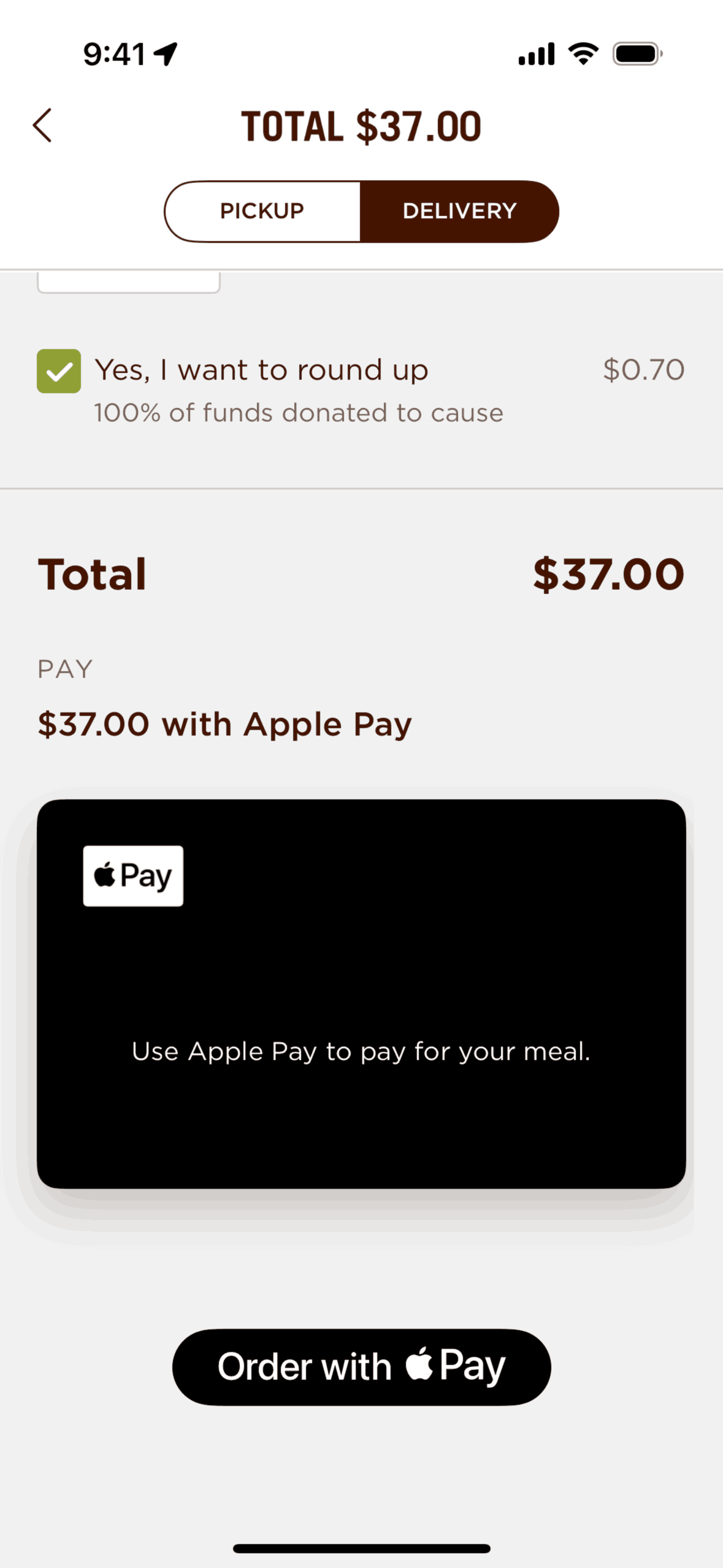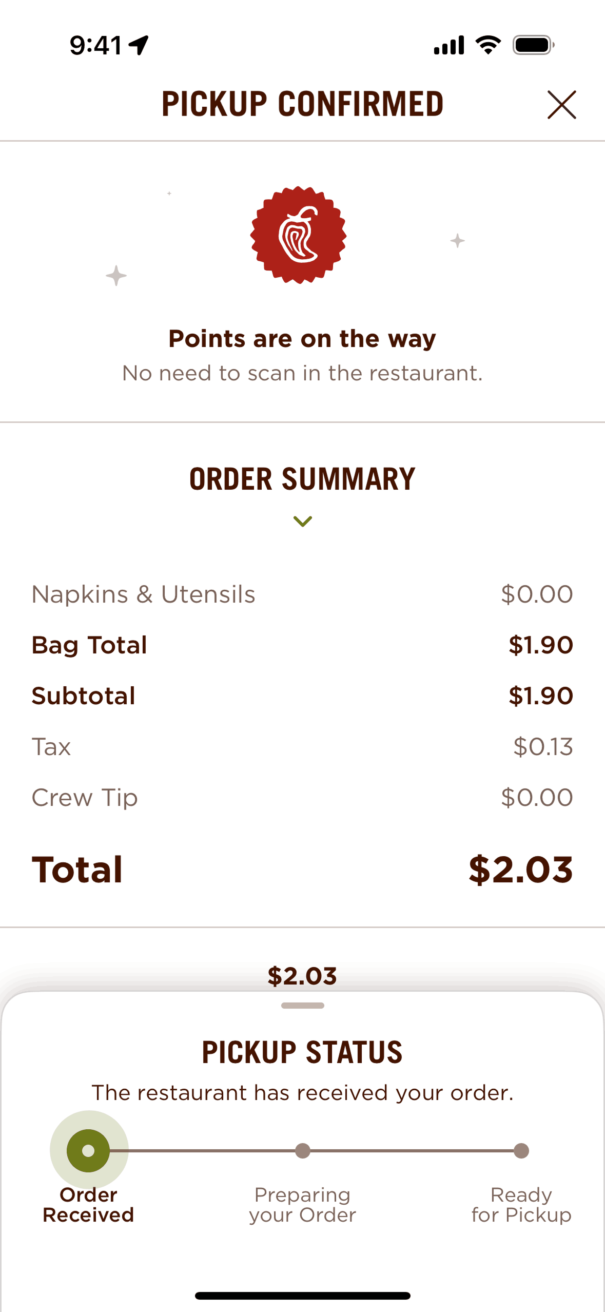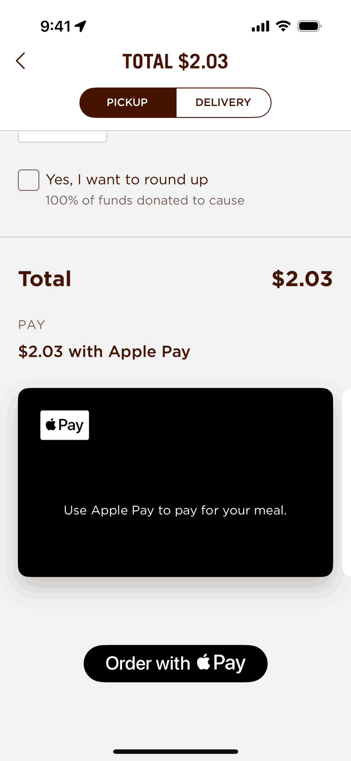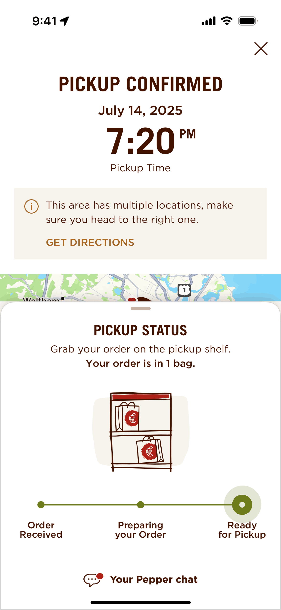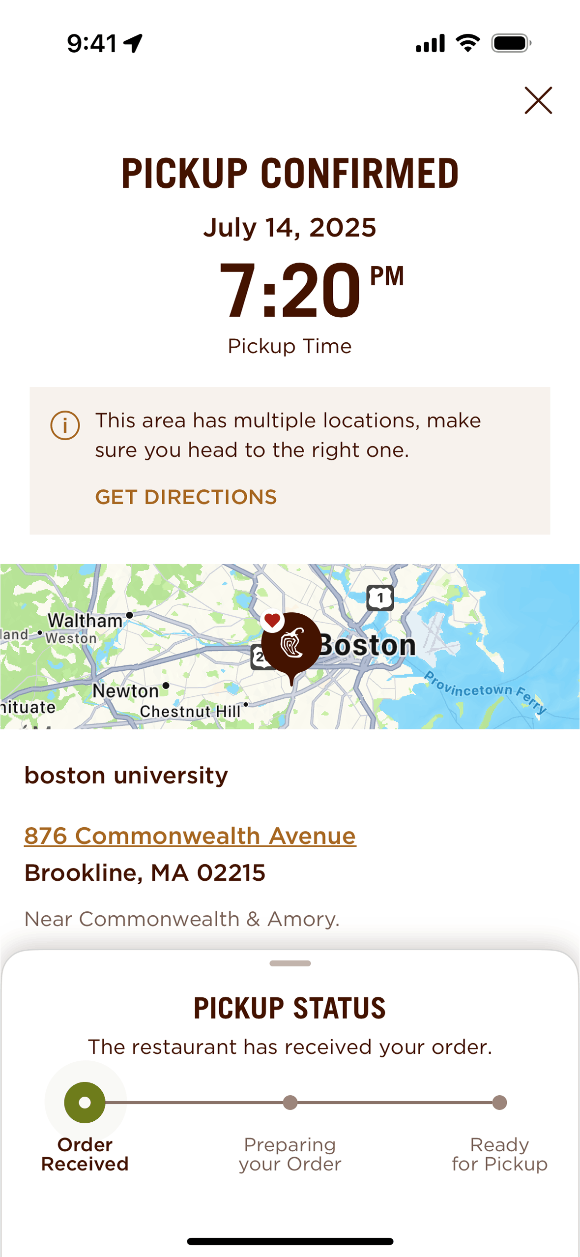 The user flow demonstrates ordering food for pickup, starting from the menu and ending with order confirmation and pickup status. The user adds items, reviews the order, and completes the purchase.