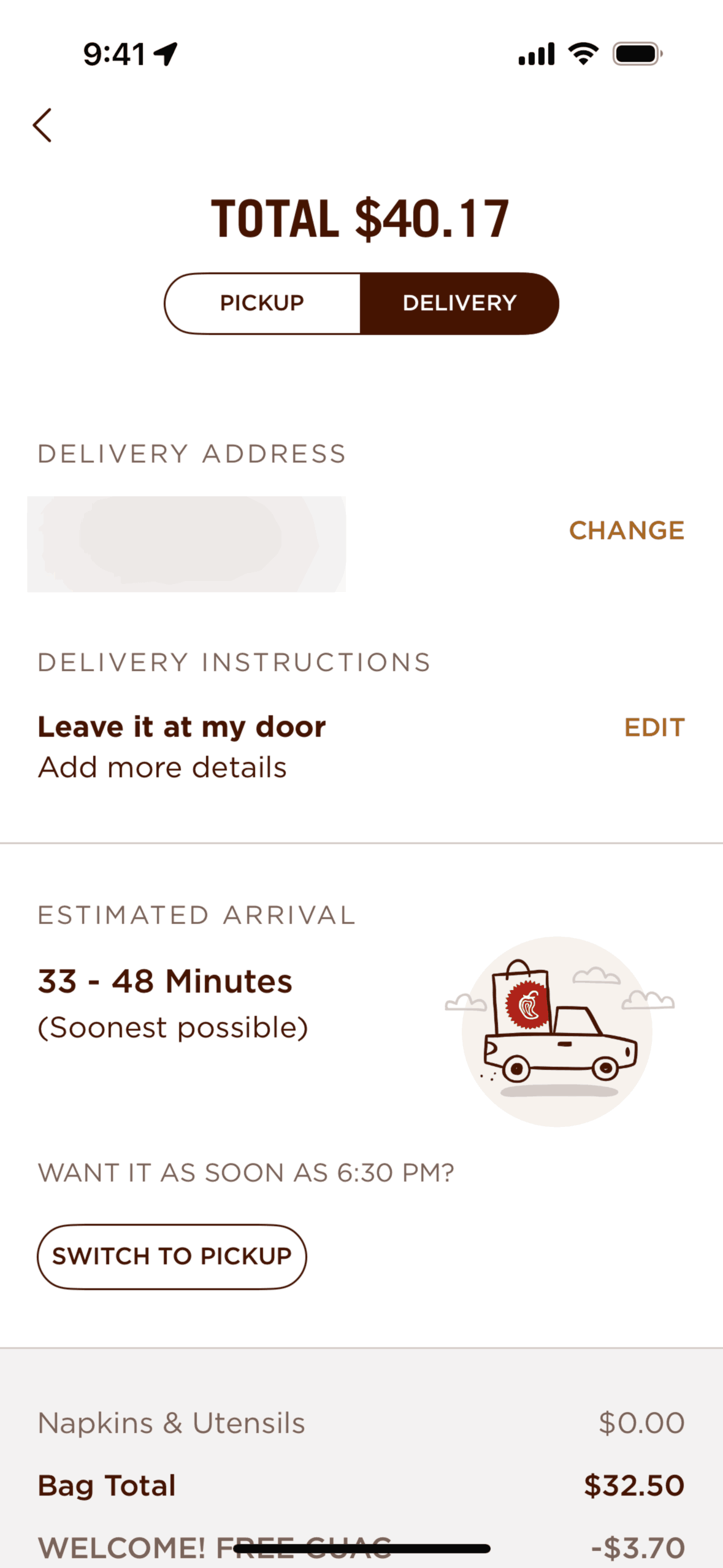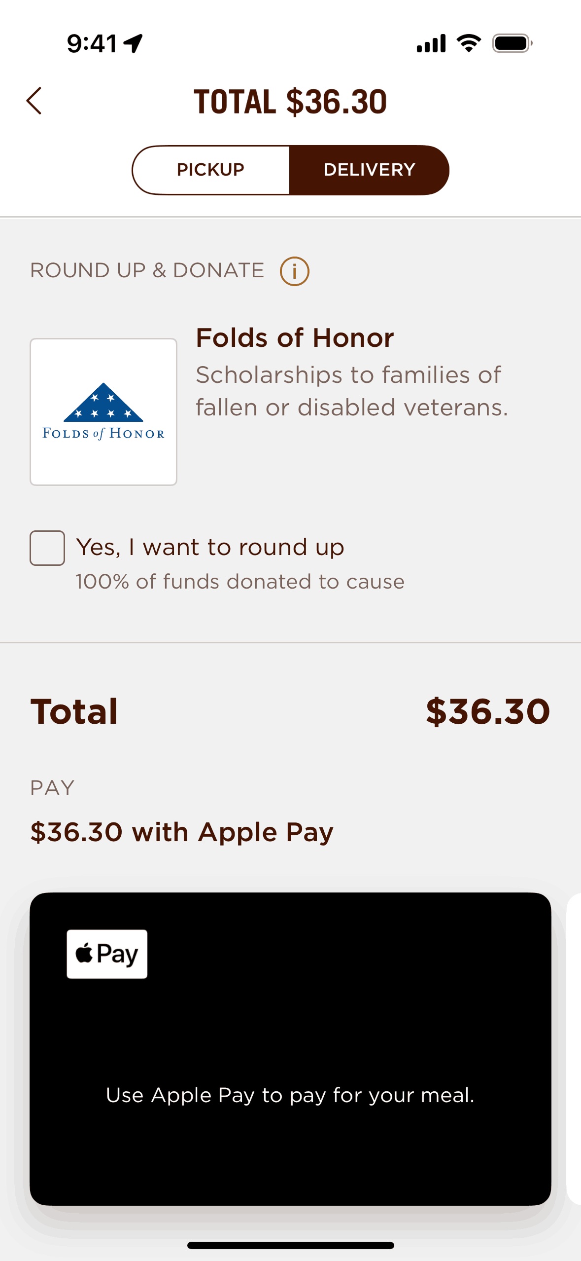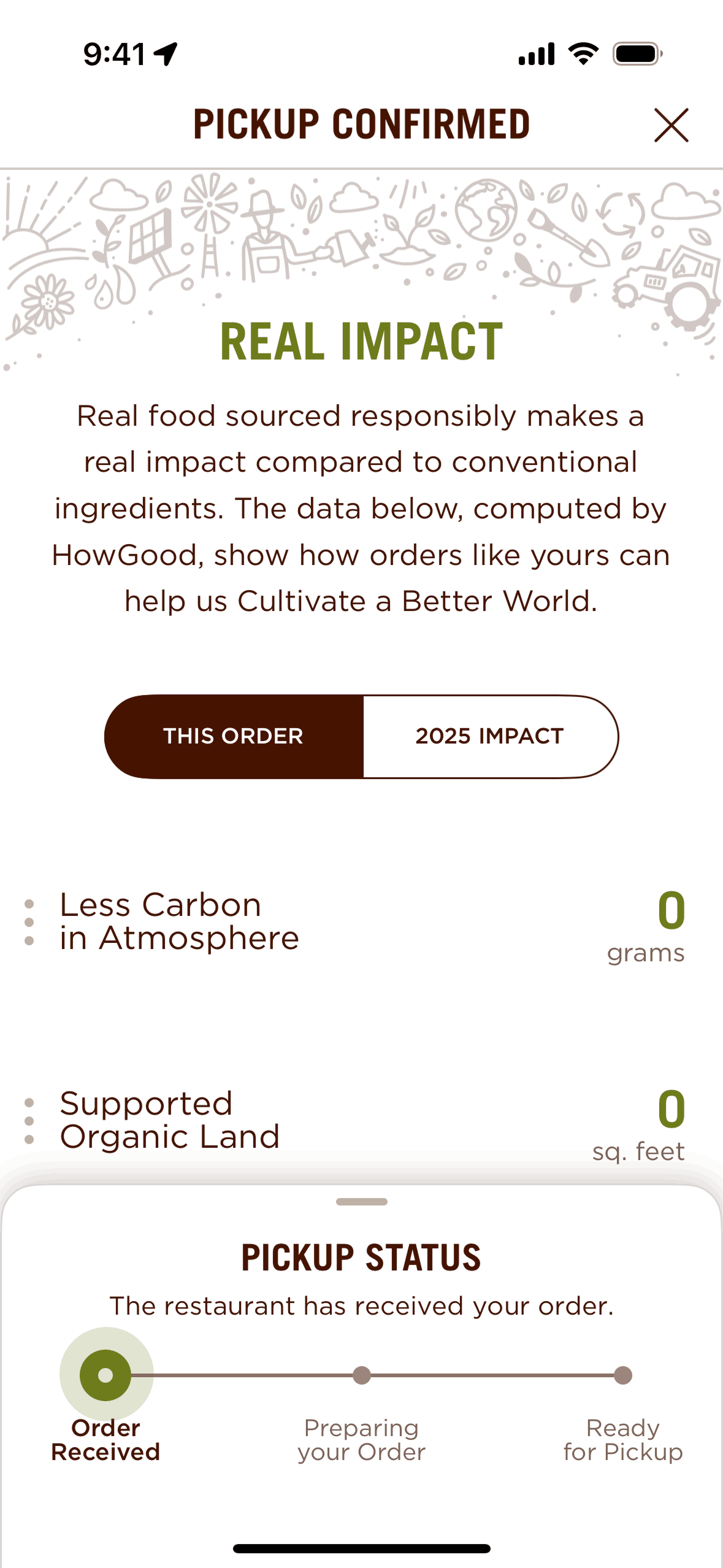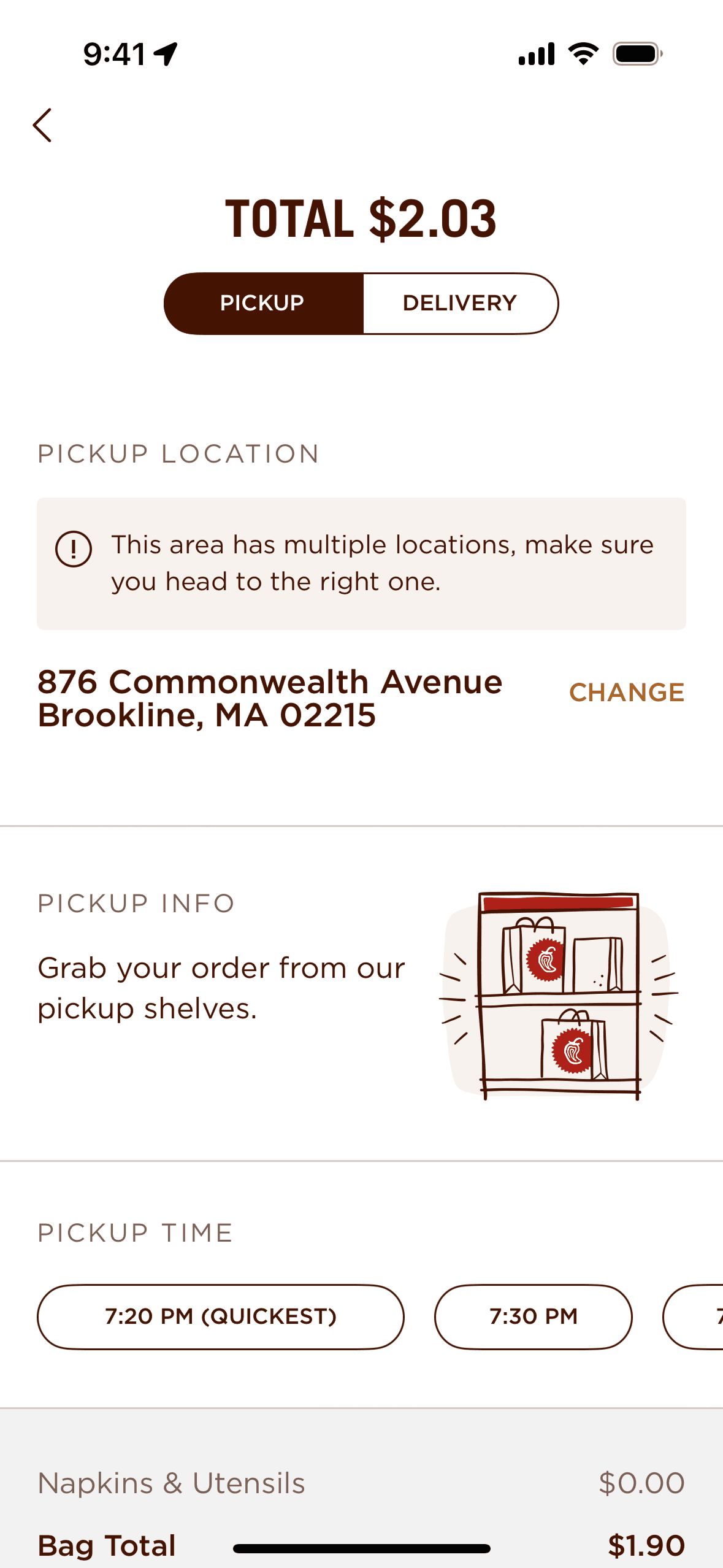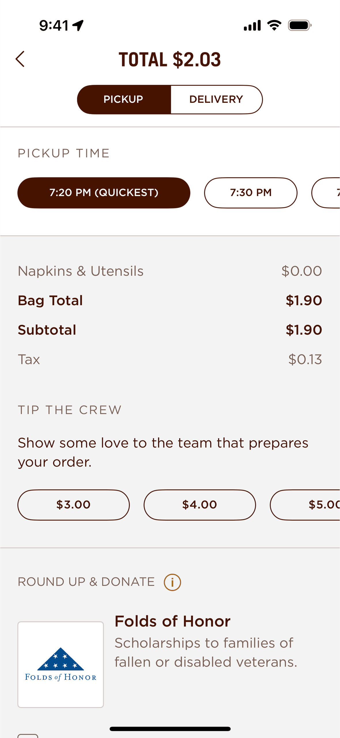 The user flow demonstrates ordering food for pickup, starting from the menu and ending with order confirmation and pickup status. The user adds items, reviews the order, and completes the purchase.