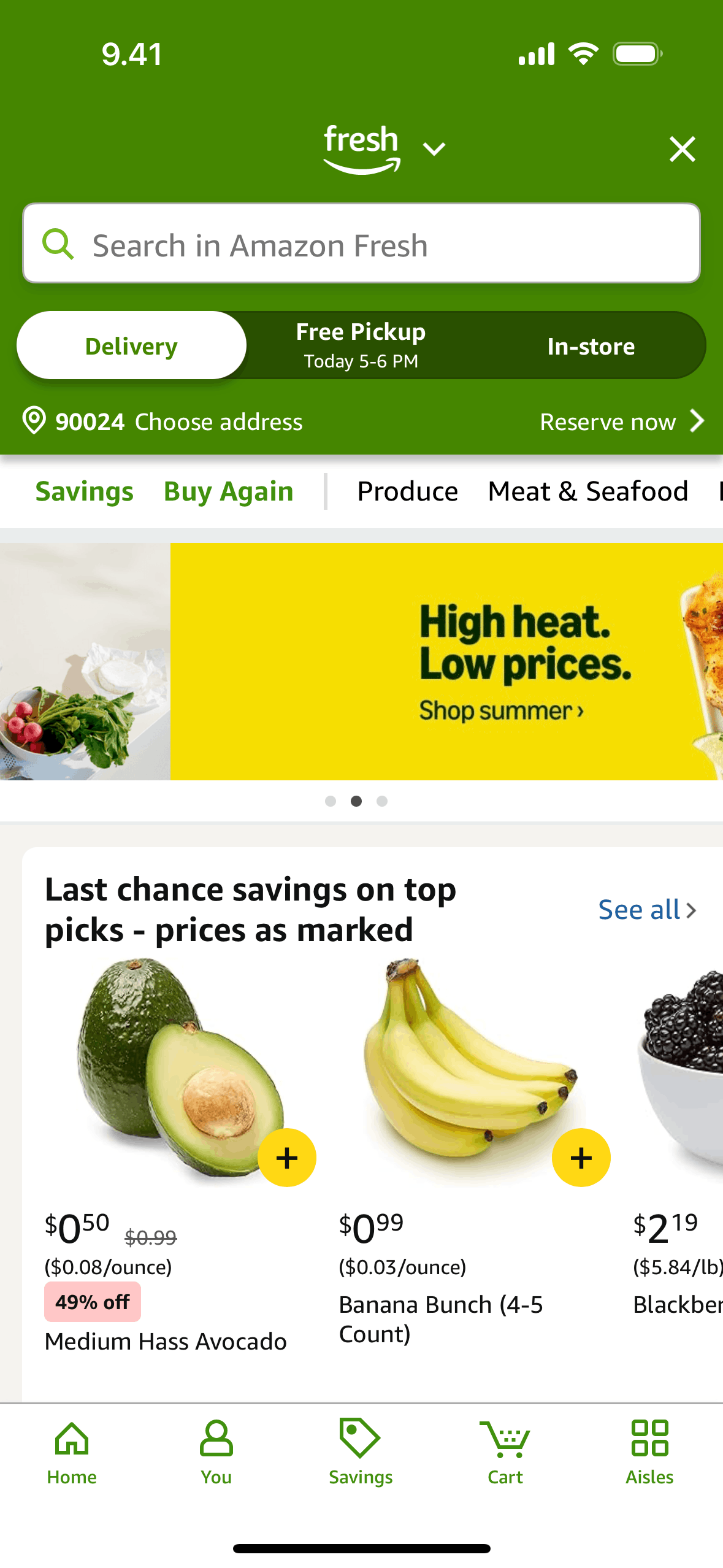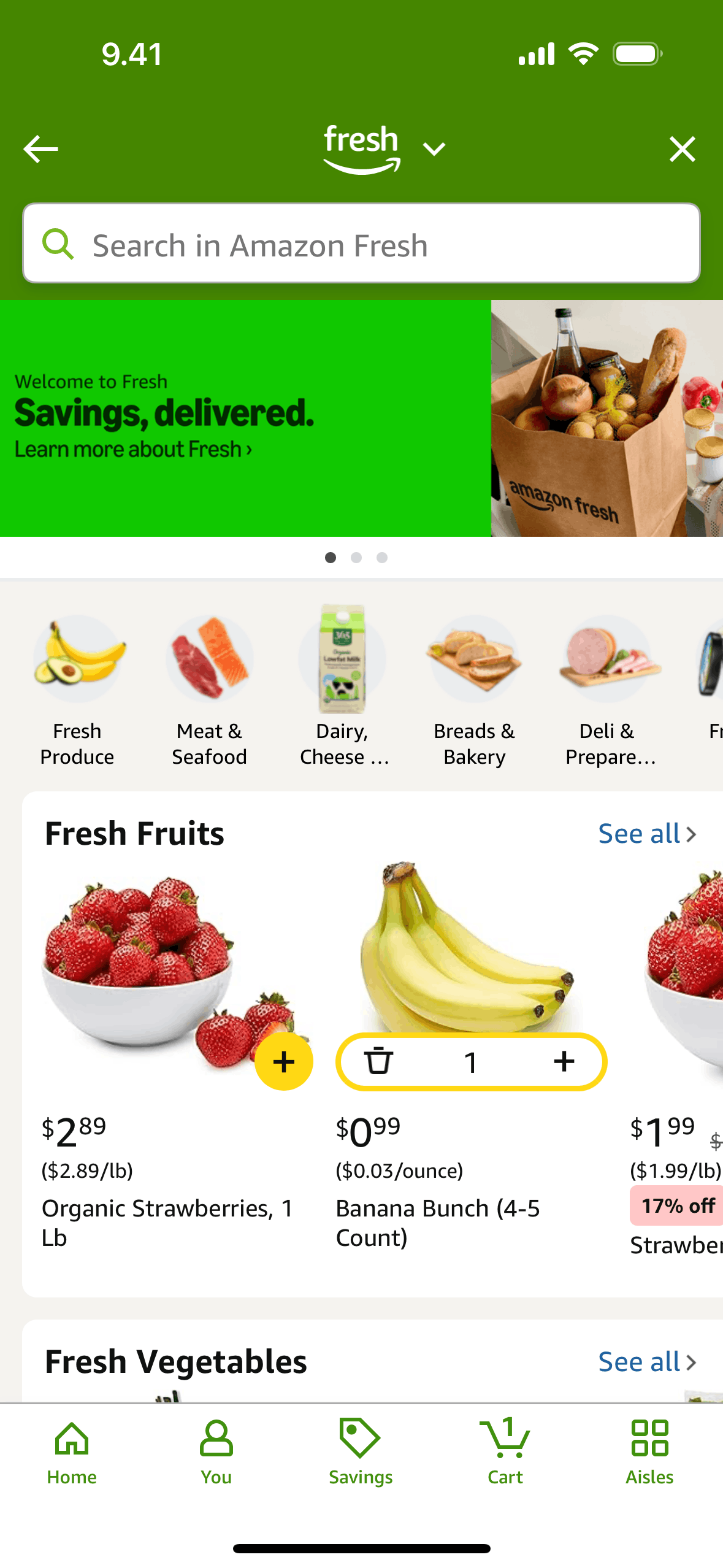 The user navigates the Amazon Fresh homepage and adds bananas to their cart. The flow demonstrates adding items for purchase.