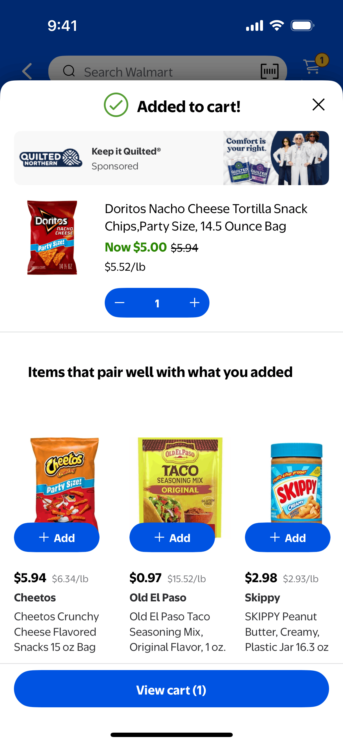 The user views a product and adds it to their cart. A confirmation modal appears, showing the added product and suggested items.