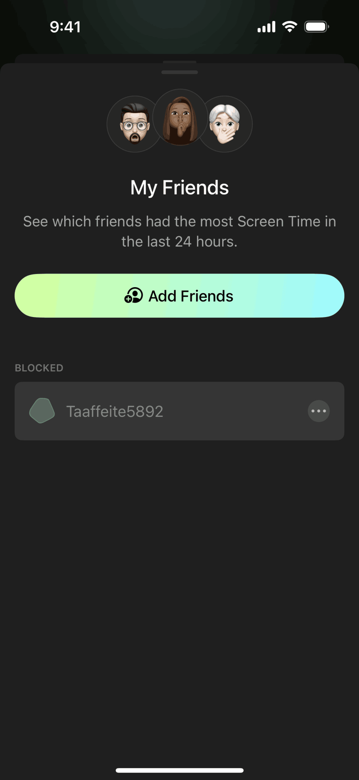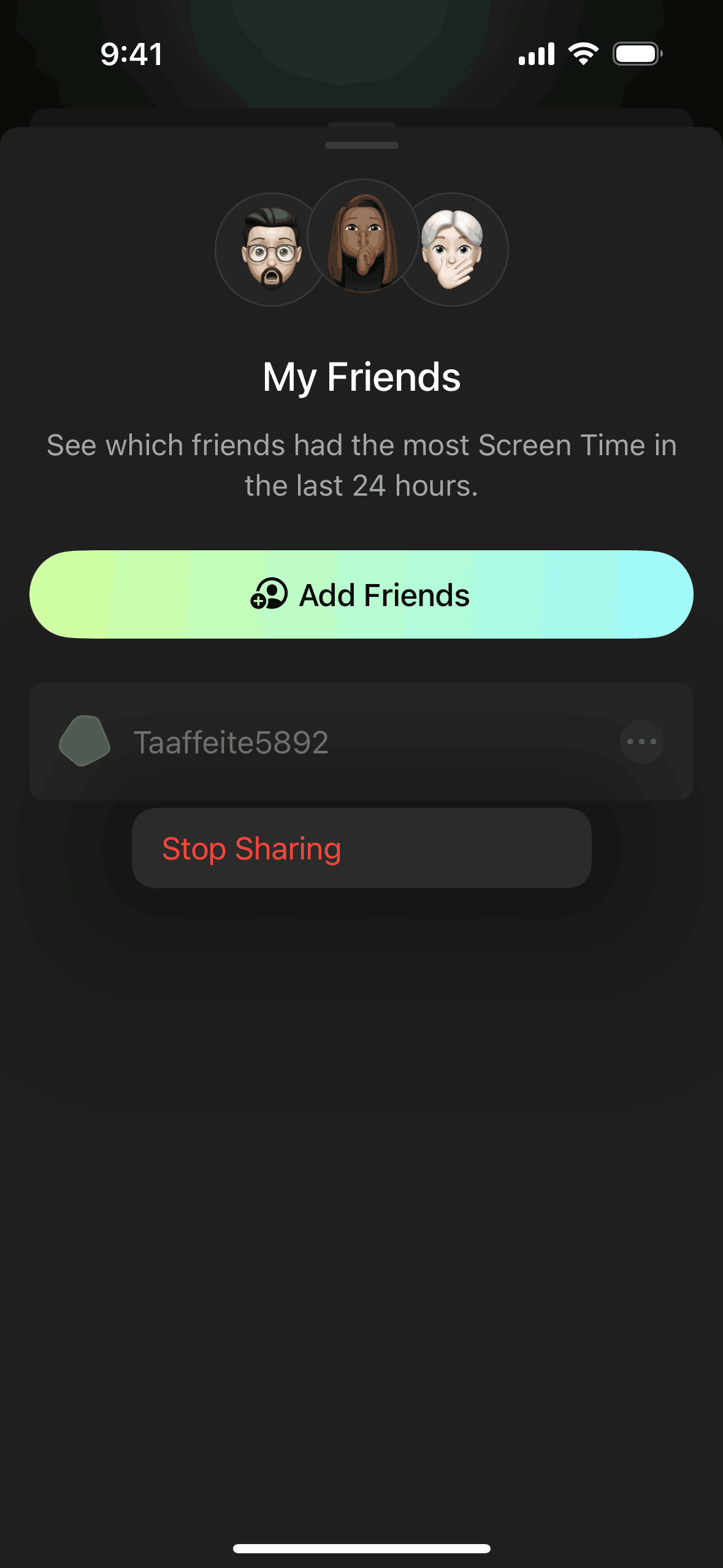 The user views their friend list, selects a friend, and then blocks them by selecting the "Stop Sharing" option. The blocked friend is then listed under a blocked section.