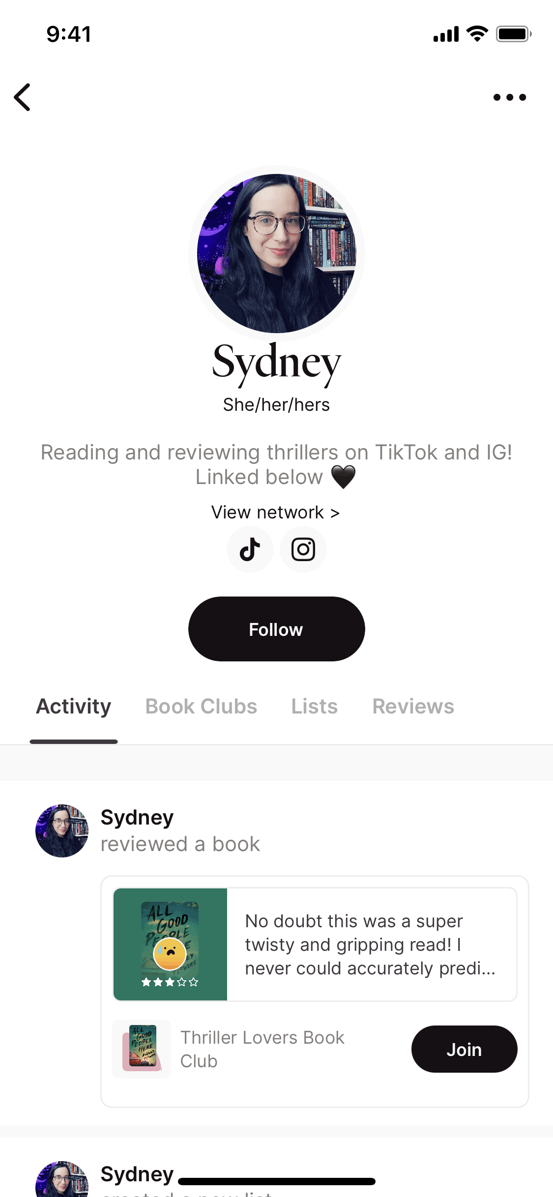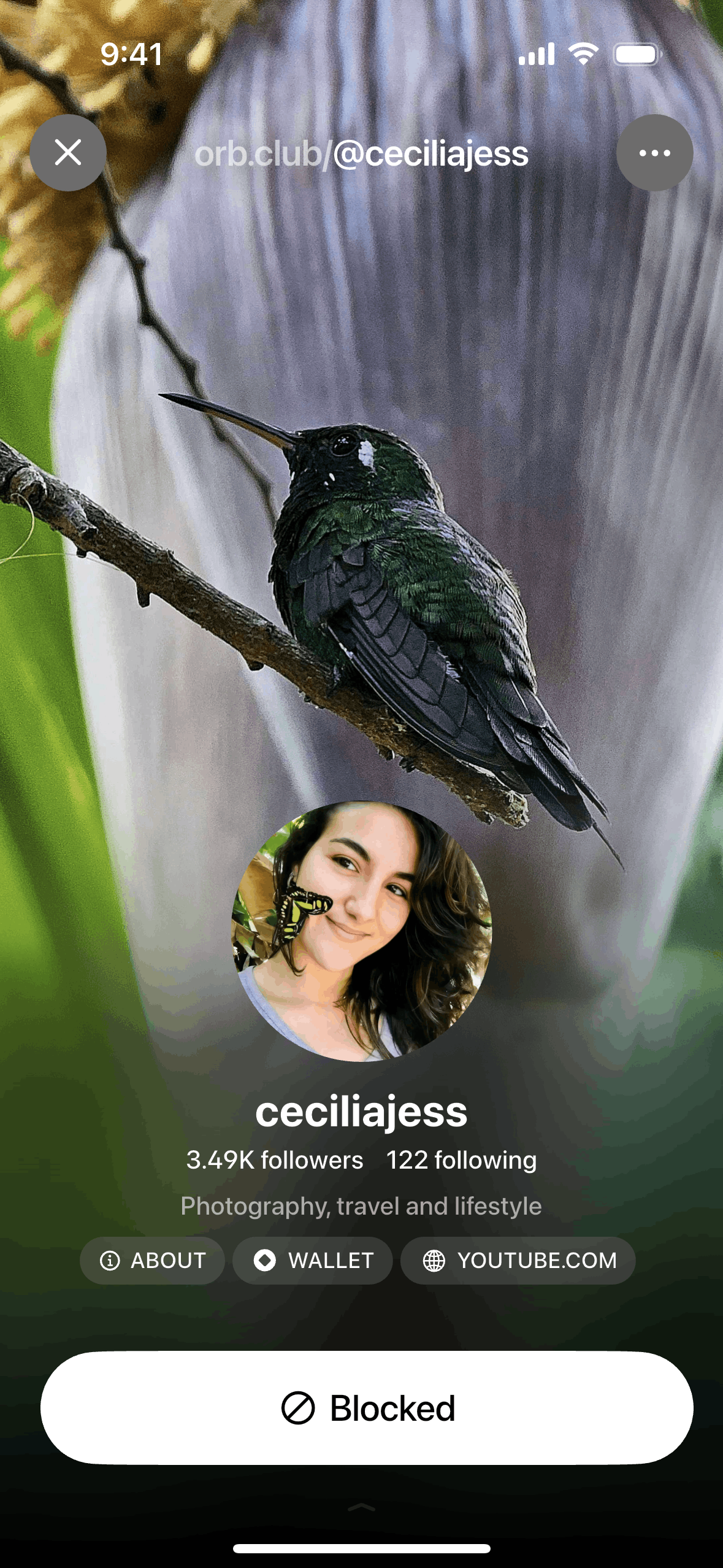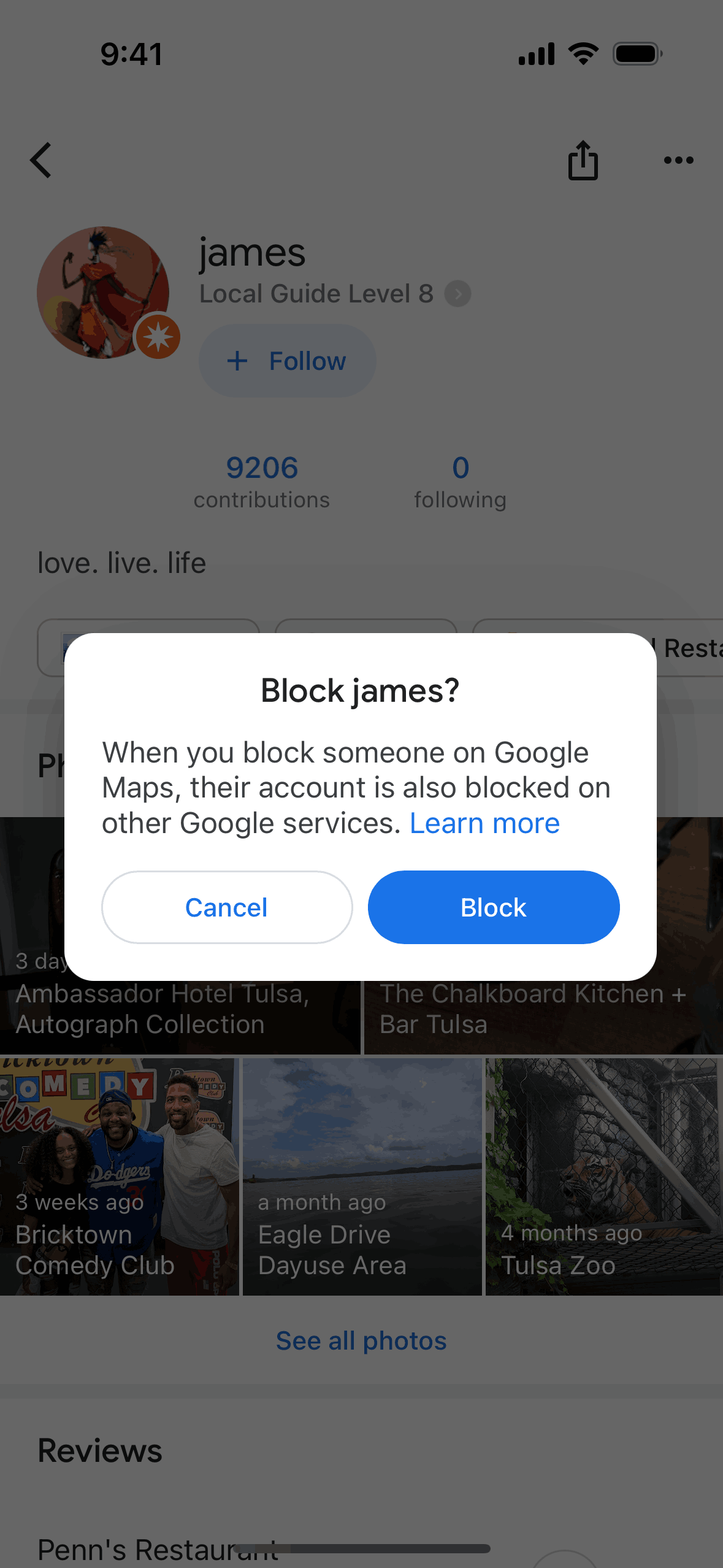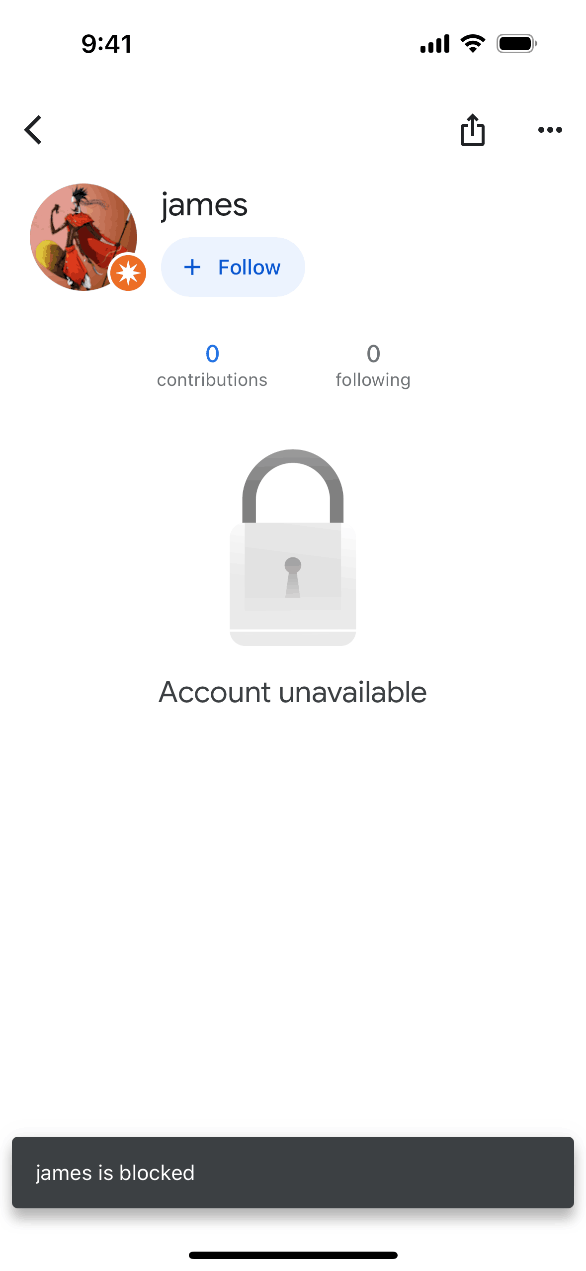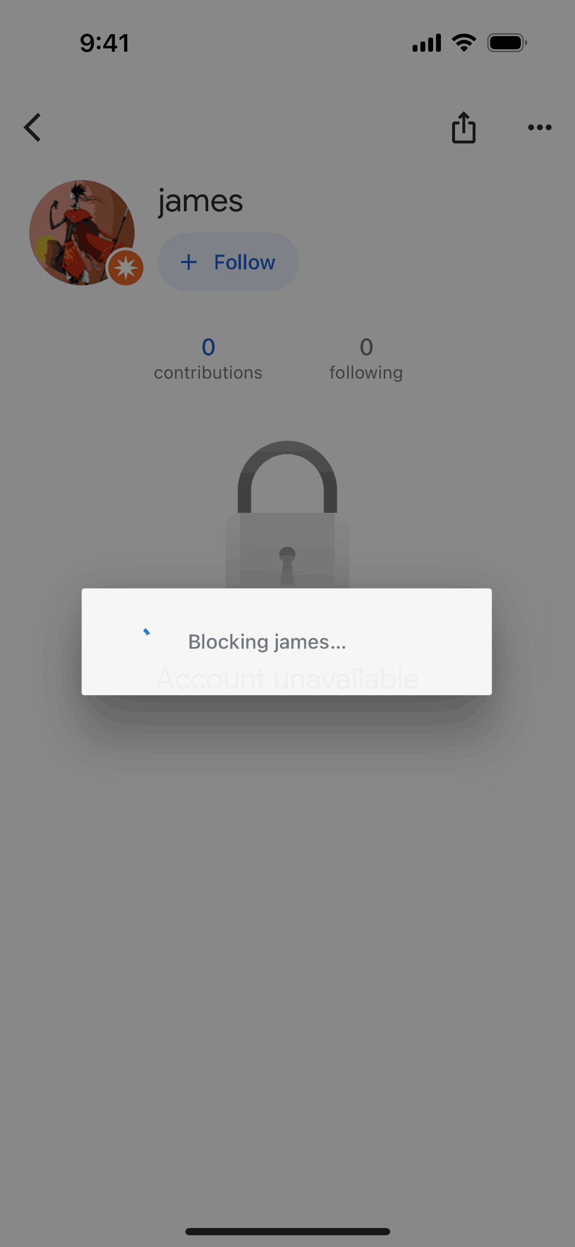 The user views a profile, initiates the block user flow, confirms the action, and the profile updates to show the blocked state. The user successfully blocks another user.