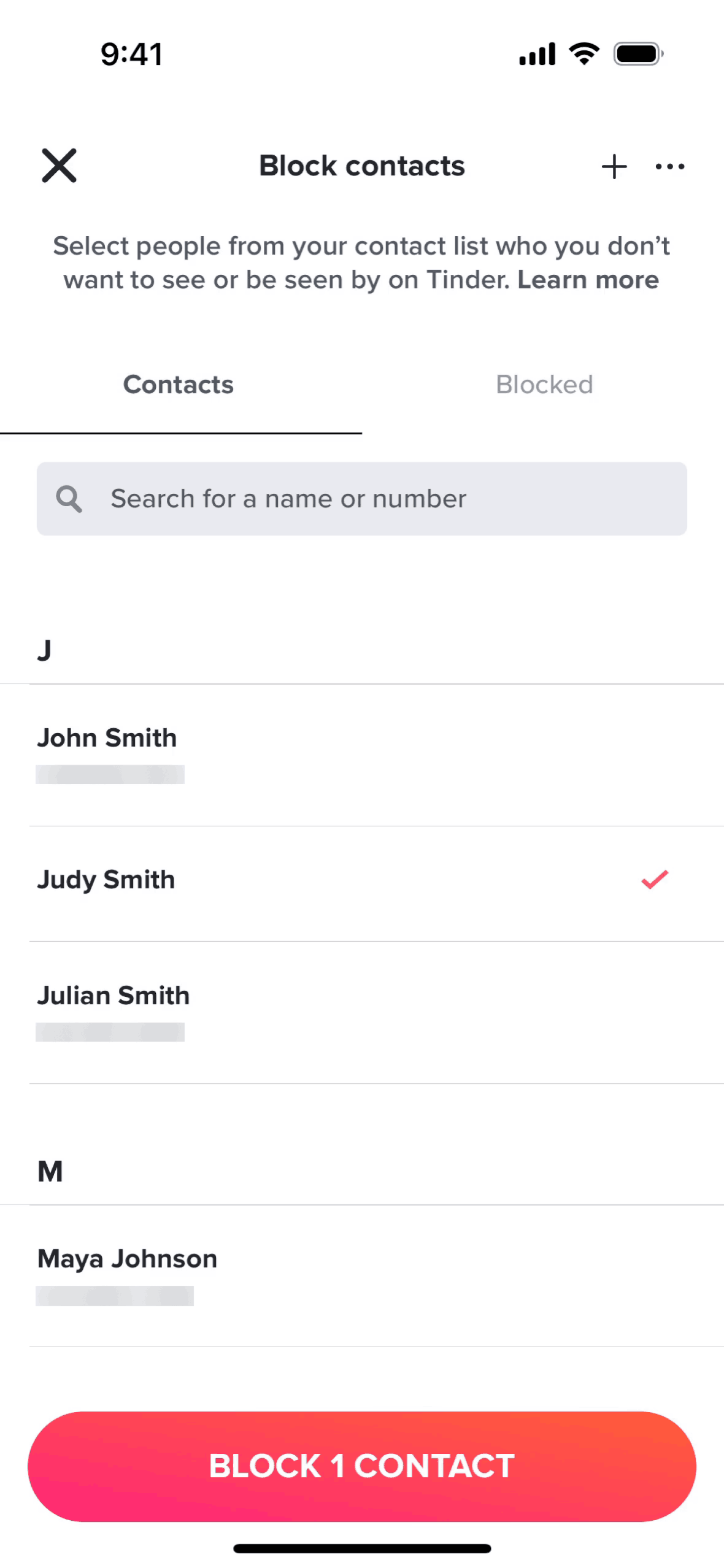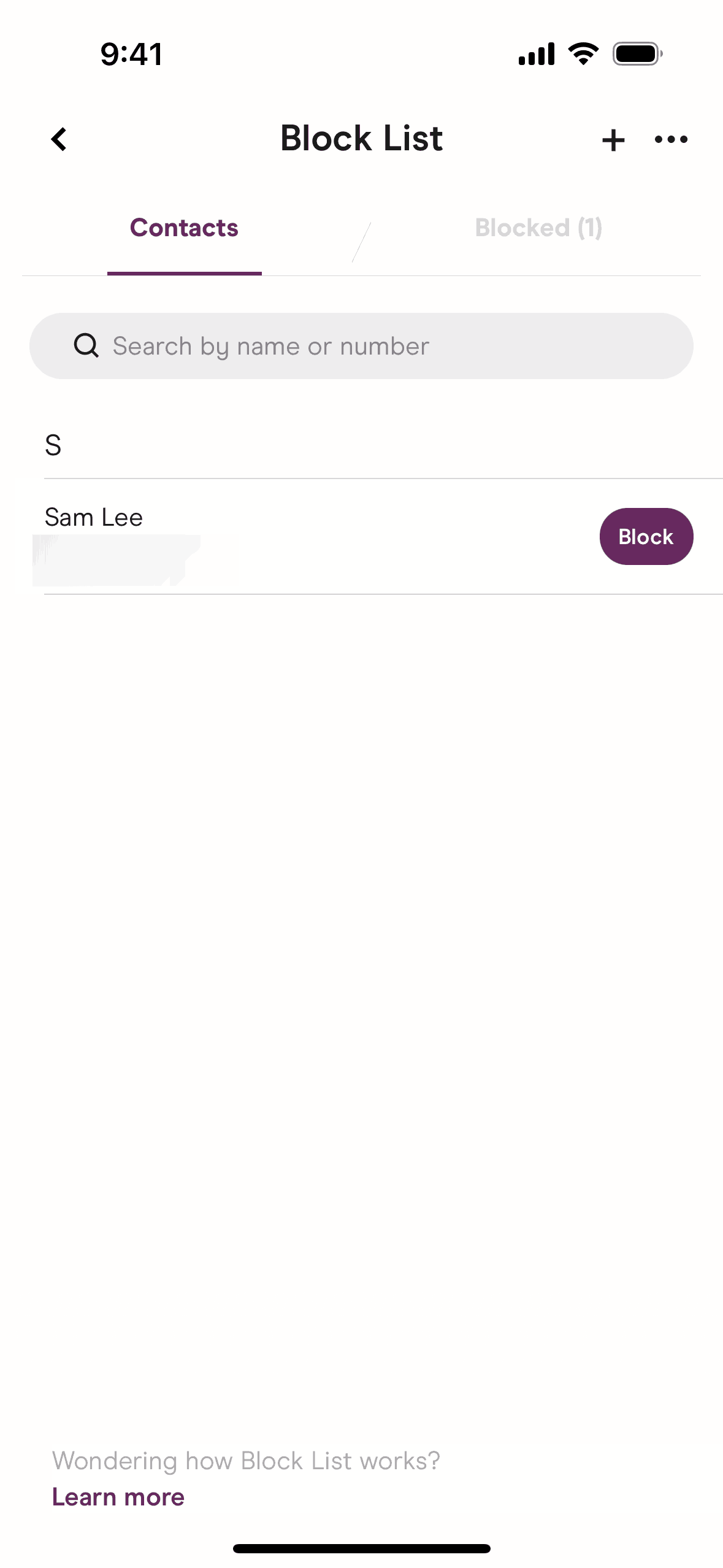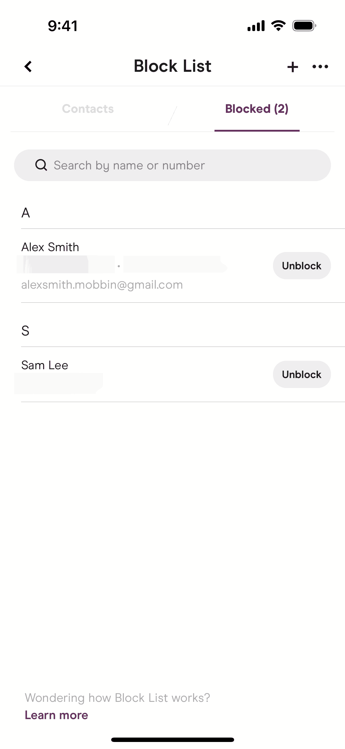The user navigates to the block list, grants contact access, and blocks a contact. The flow concludes with the user viewing the updated block list.