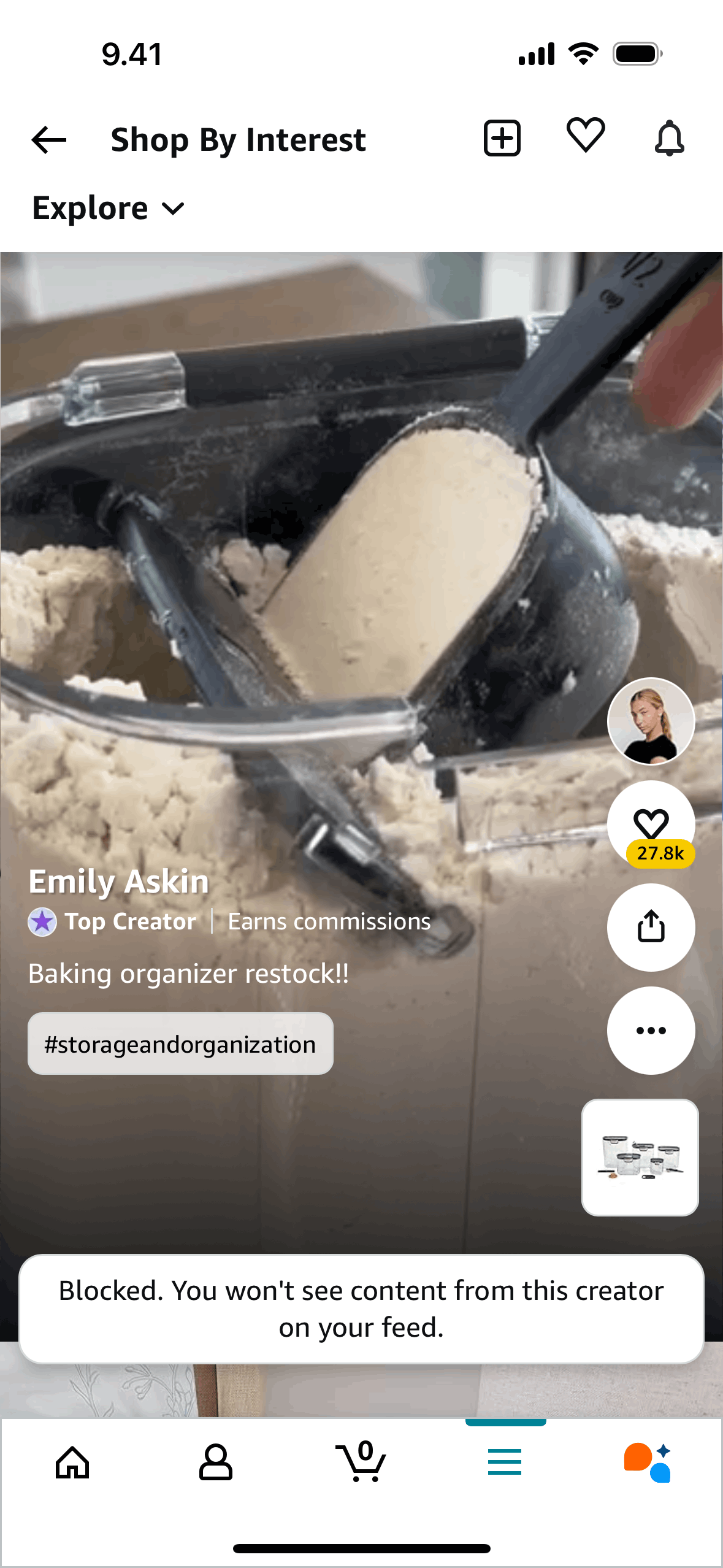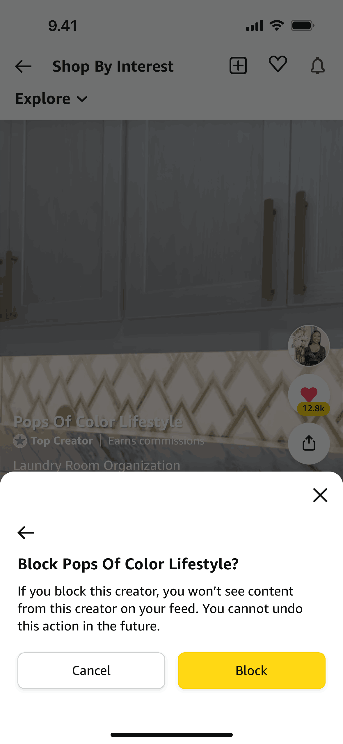 The user flow demonstrates blocking a creator. It shows the options menu, the confirmation prompt, and the final confirmation message.