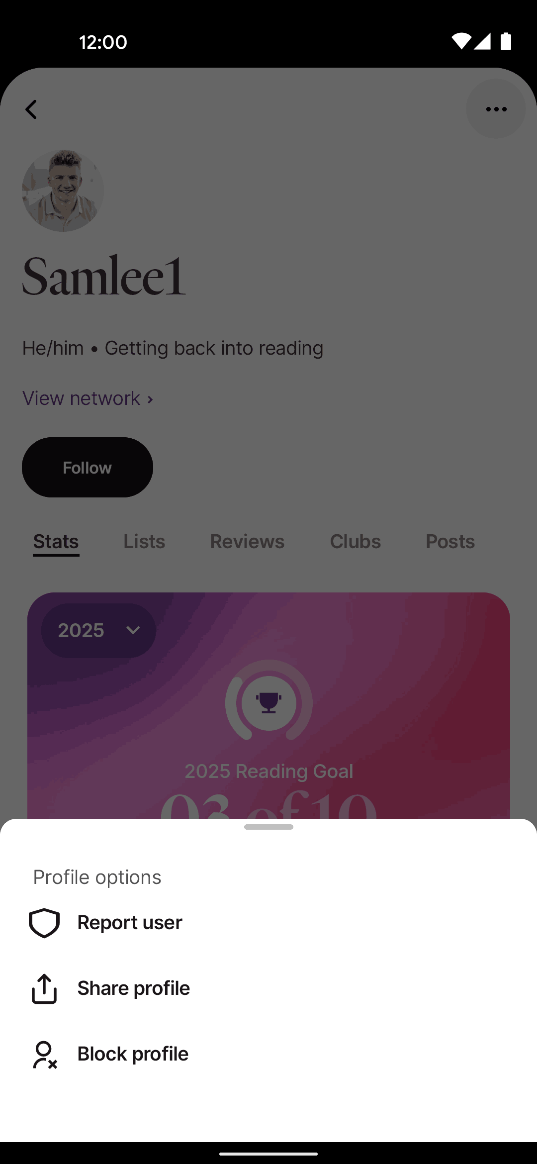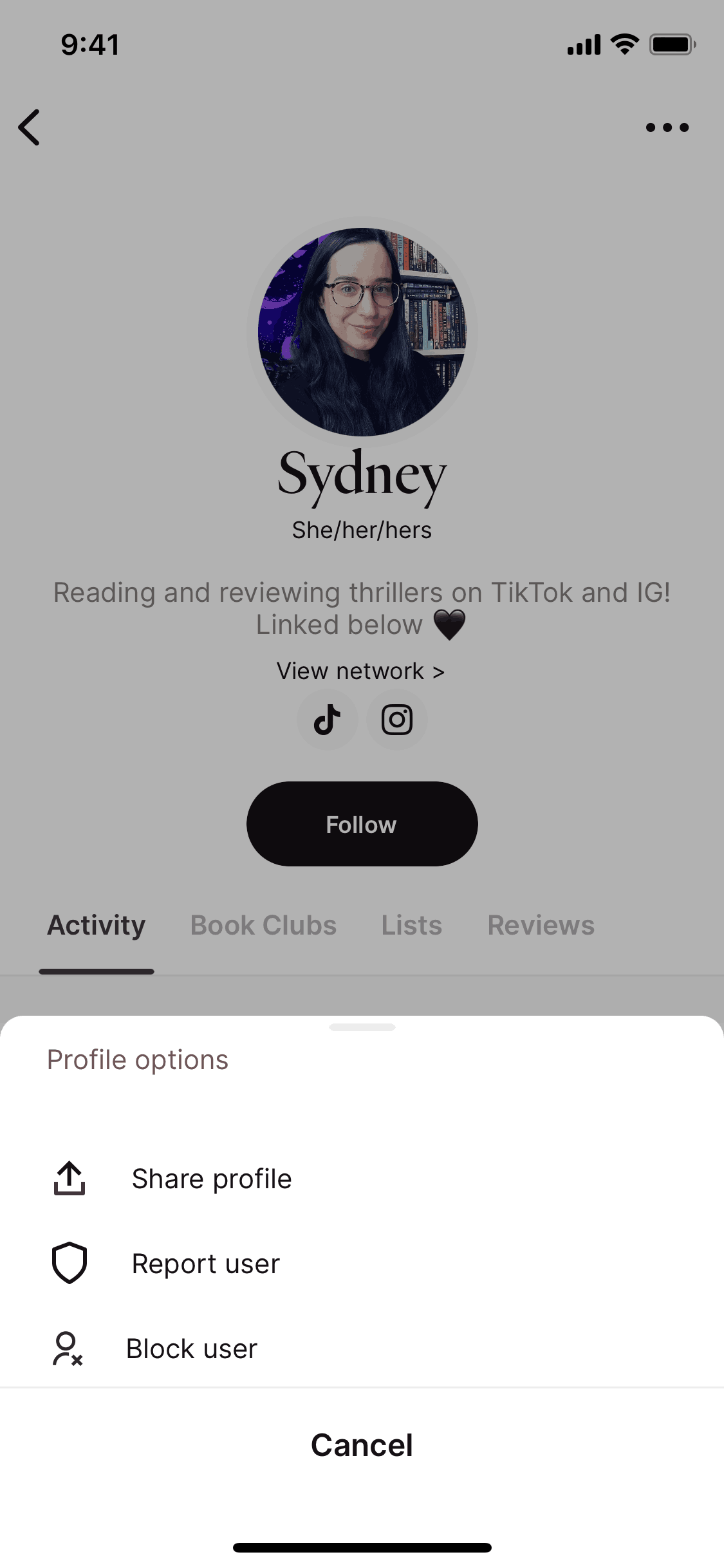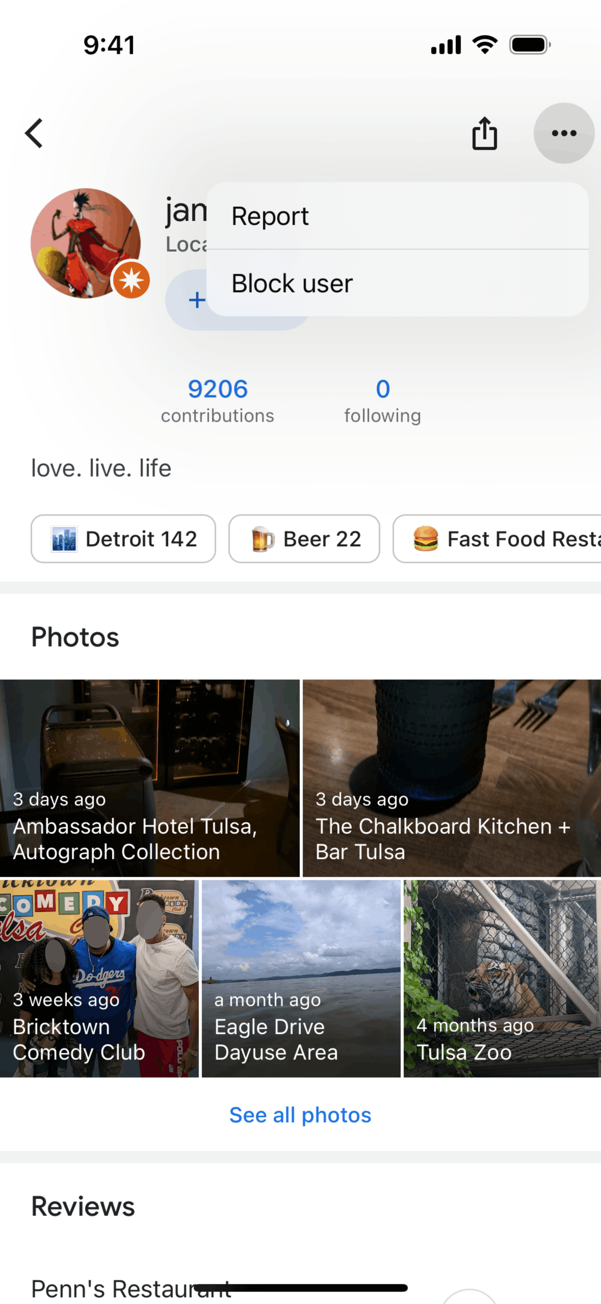 The user views a profile, opens options, and blocks the user. A simplified profile is then shown.