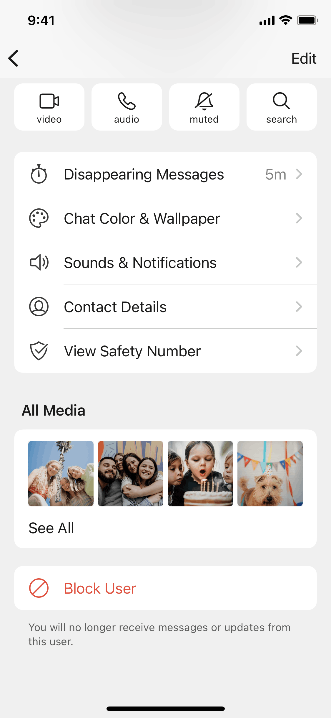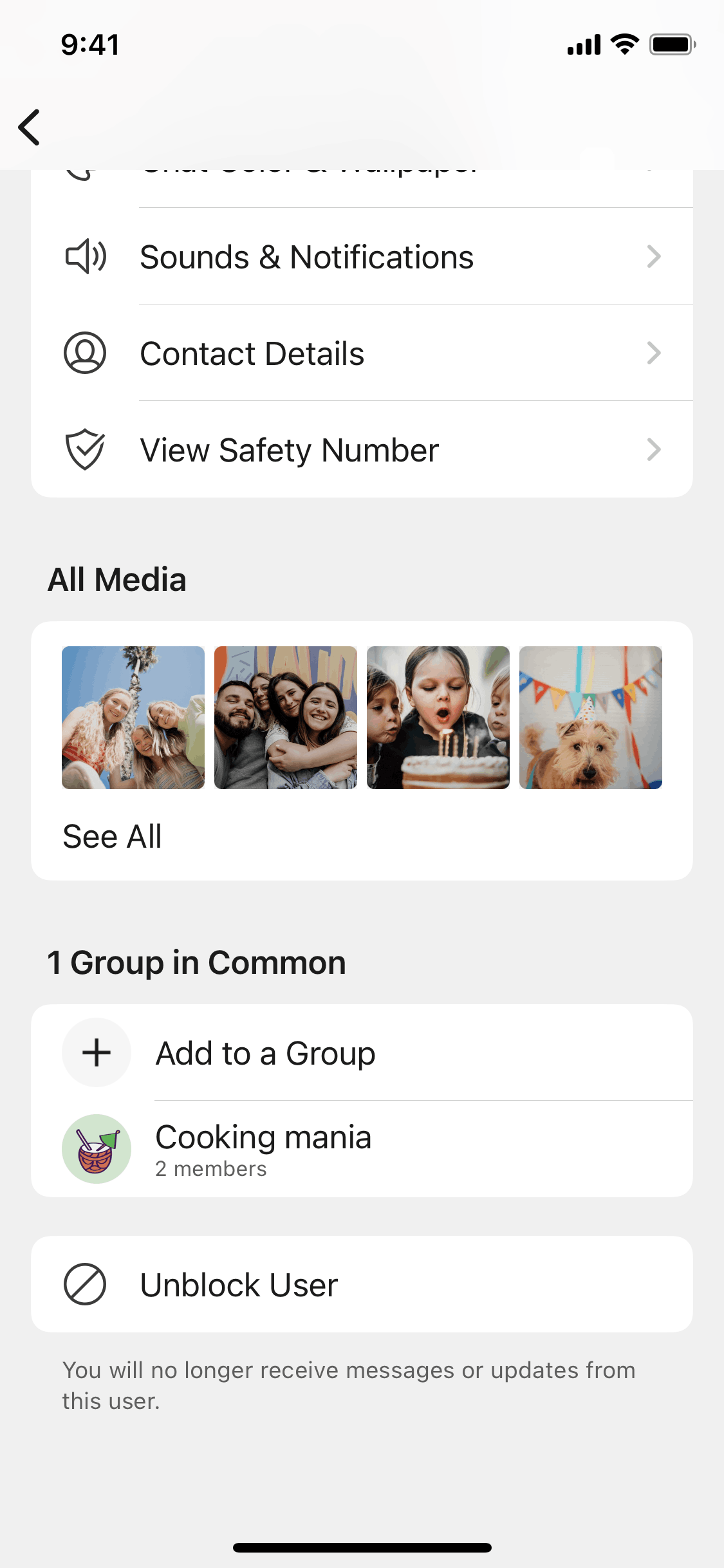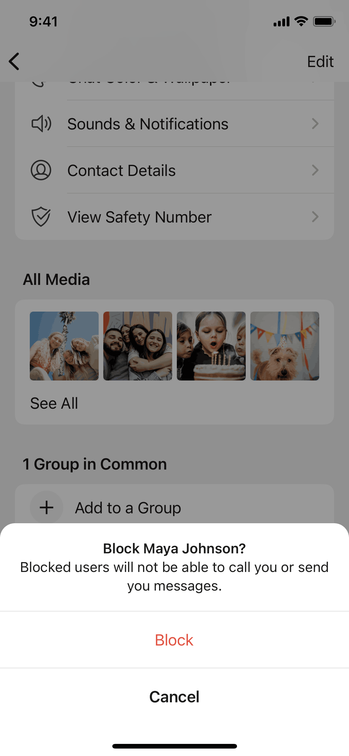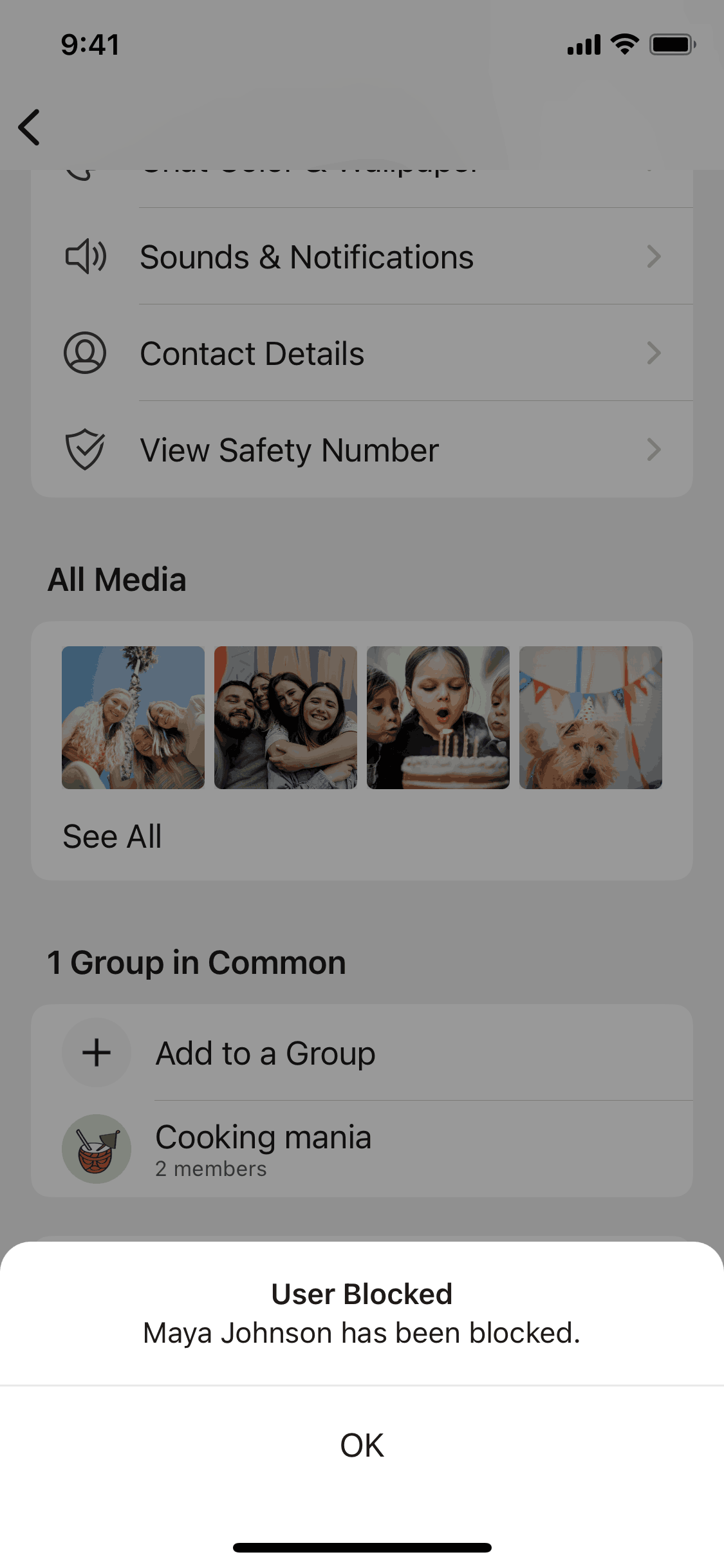 The user flow demonstrates blocking a user, including confirmation and a final state where the user can unblock the contact. The key action is the blocking confirmation.