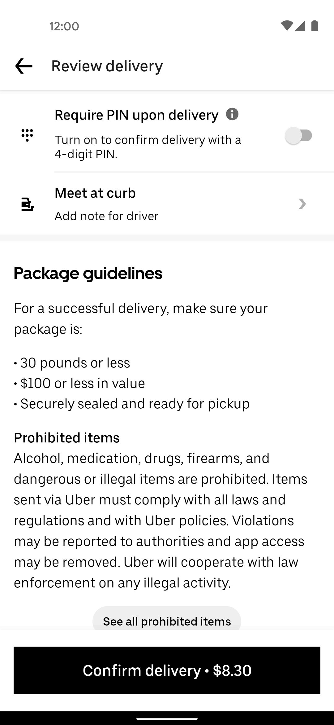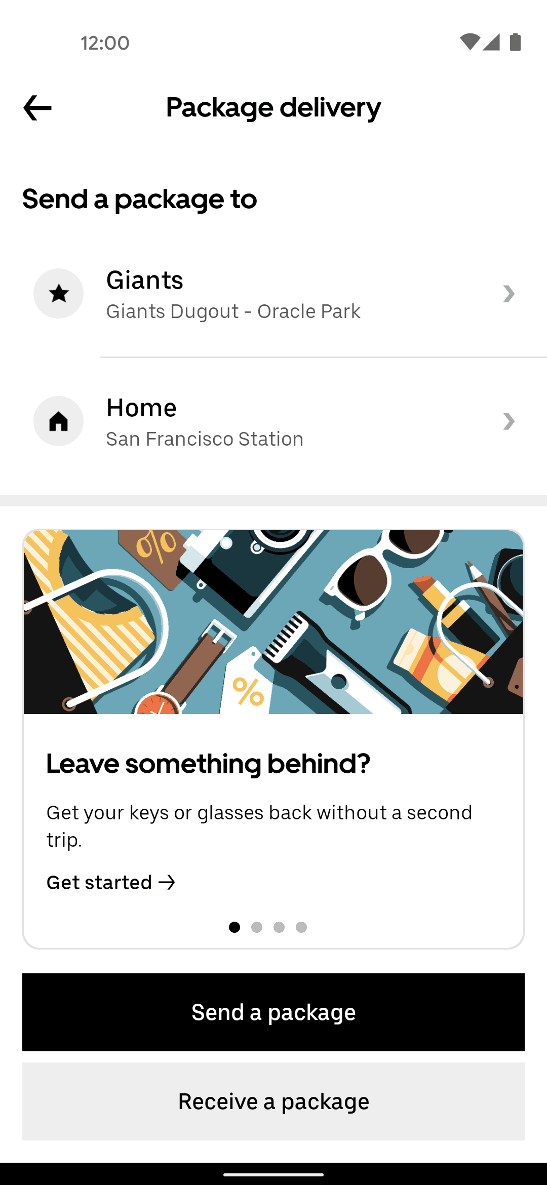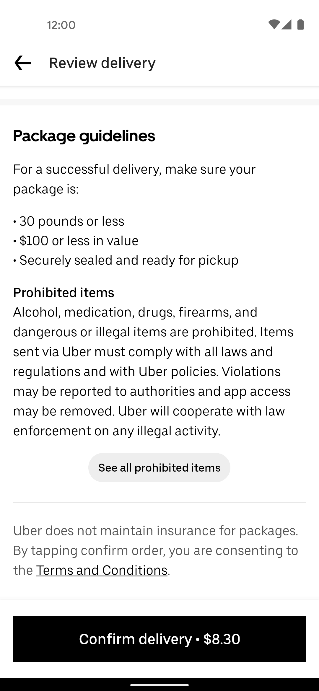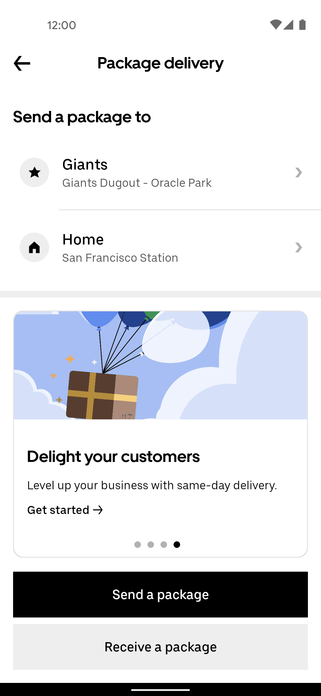 The user attempts to send a package via Uber, providing all necessary details, but the delivery request fails due to an error.