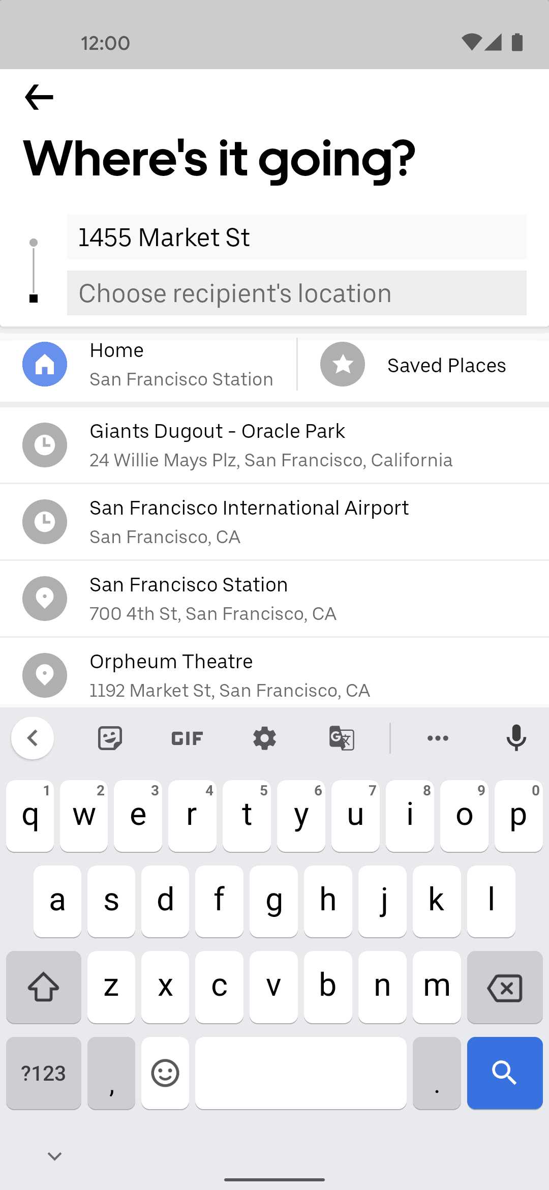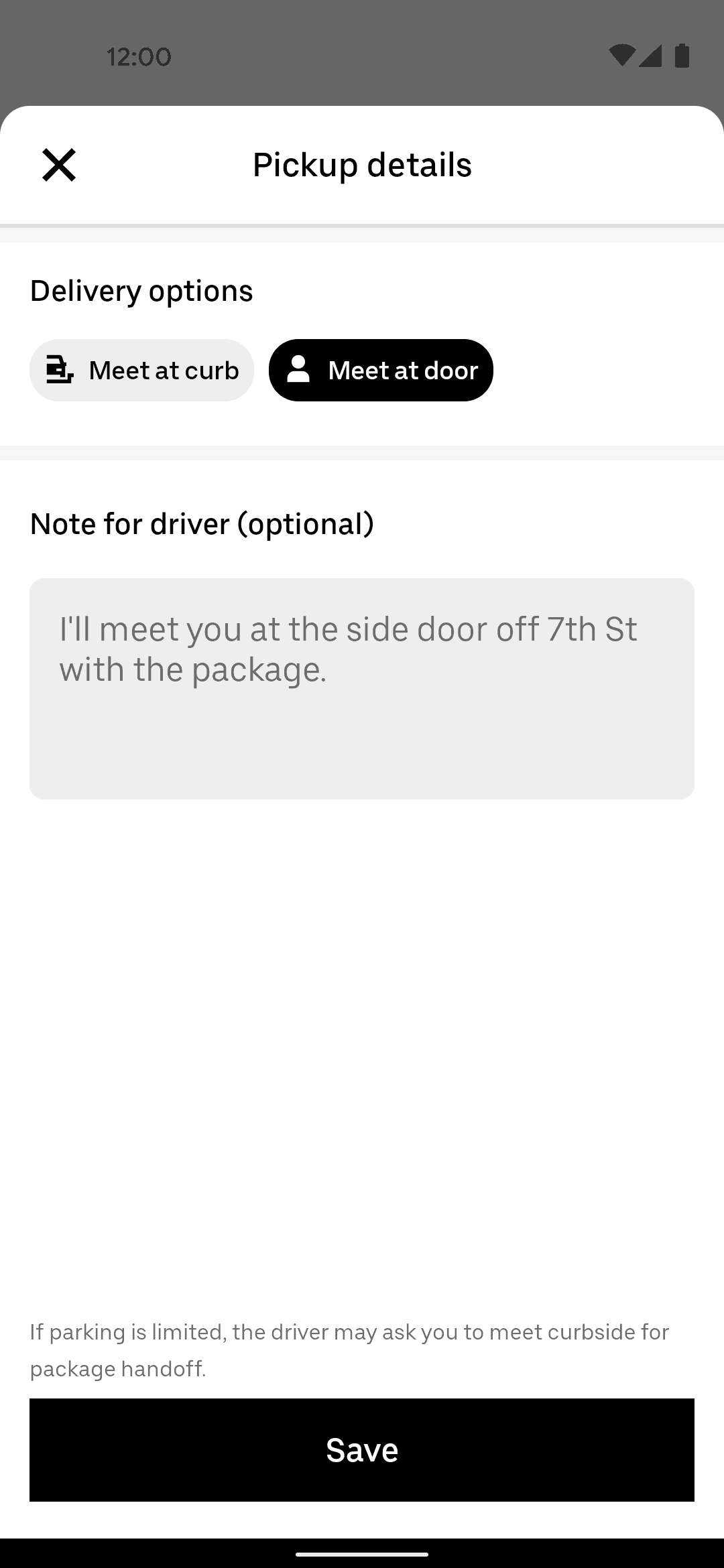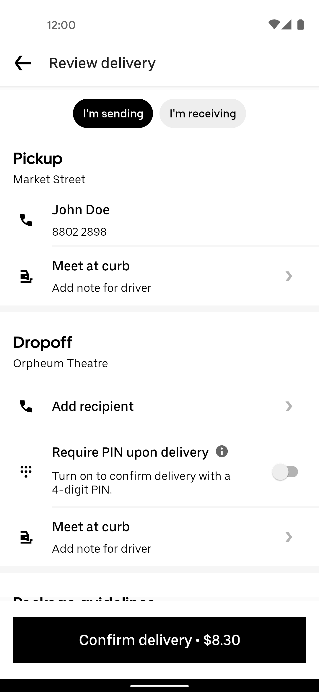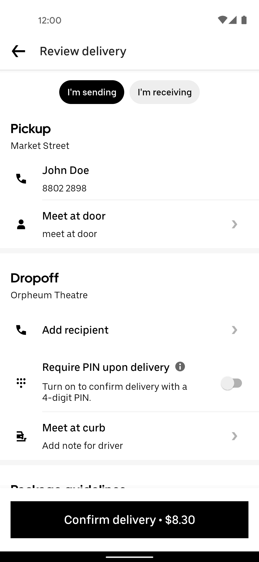 The user attempts to send a package via Uber, providing all necessary details, but the delivery request fails due to an error.
