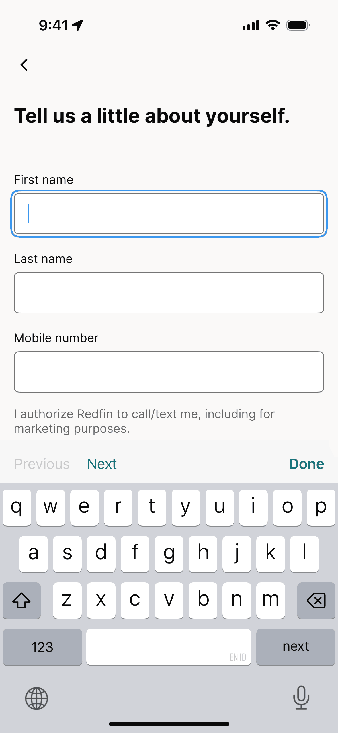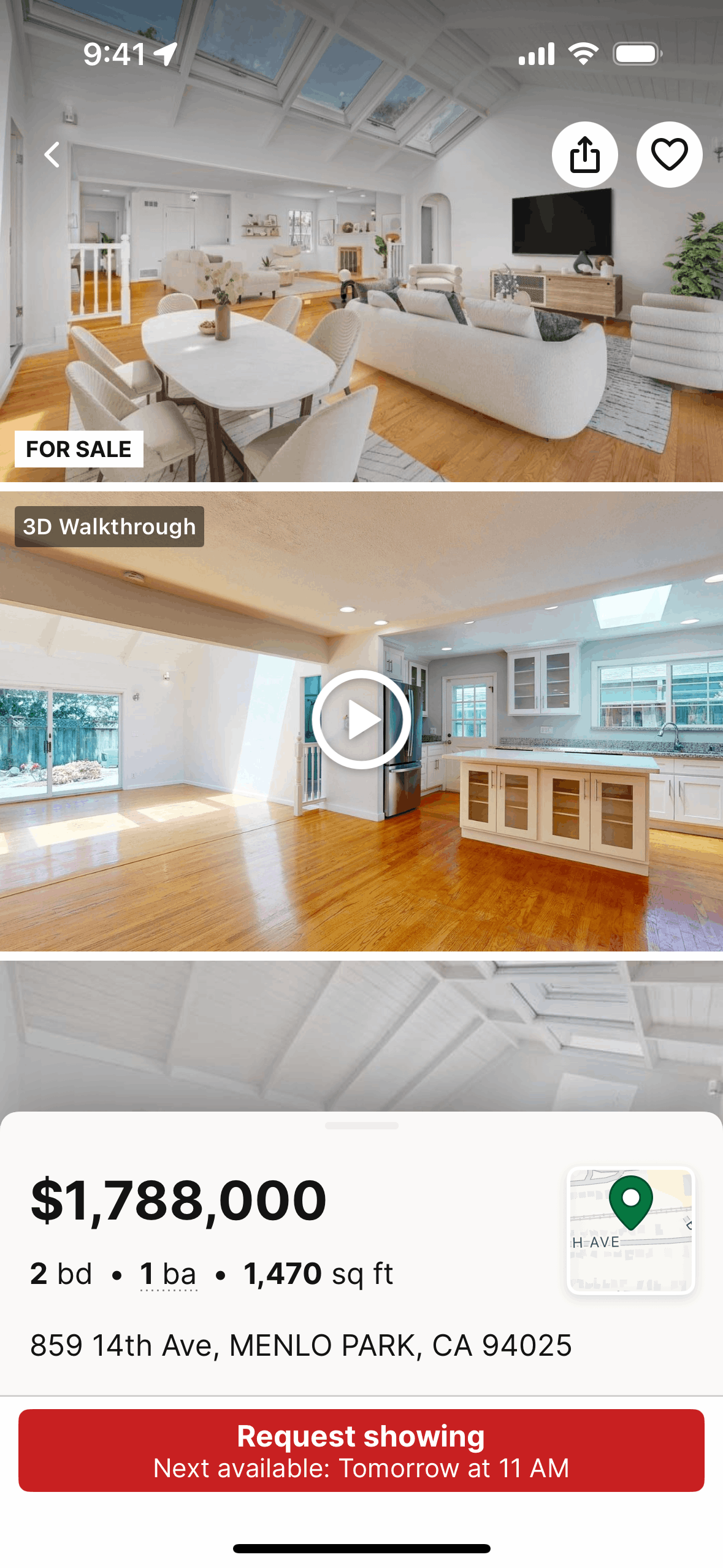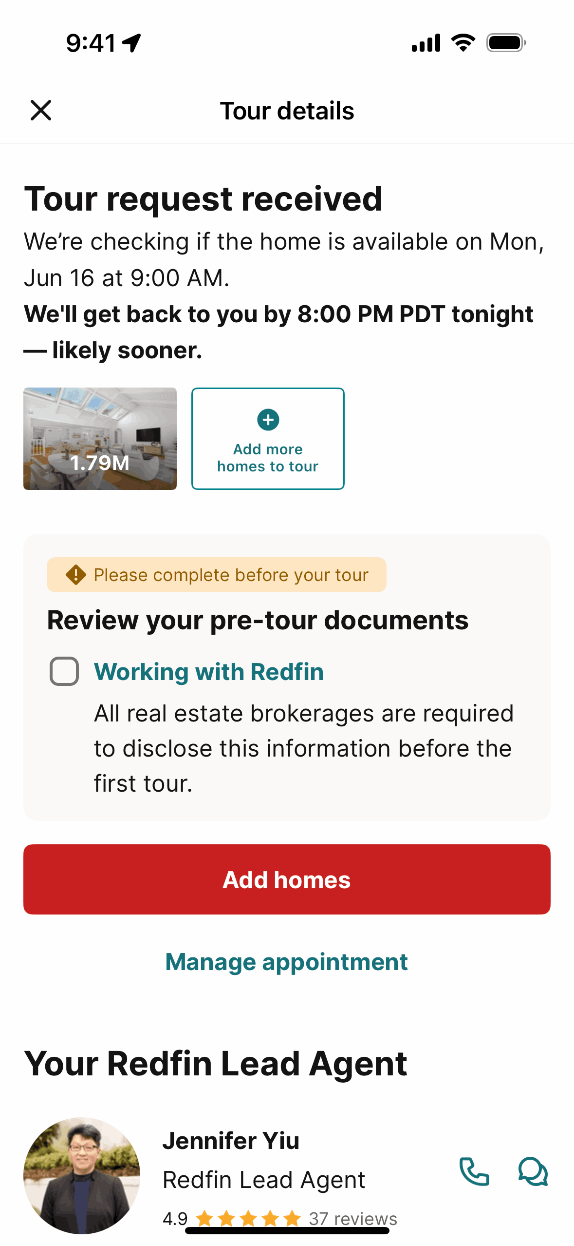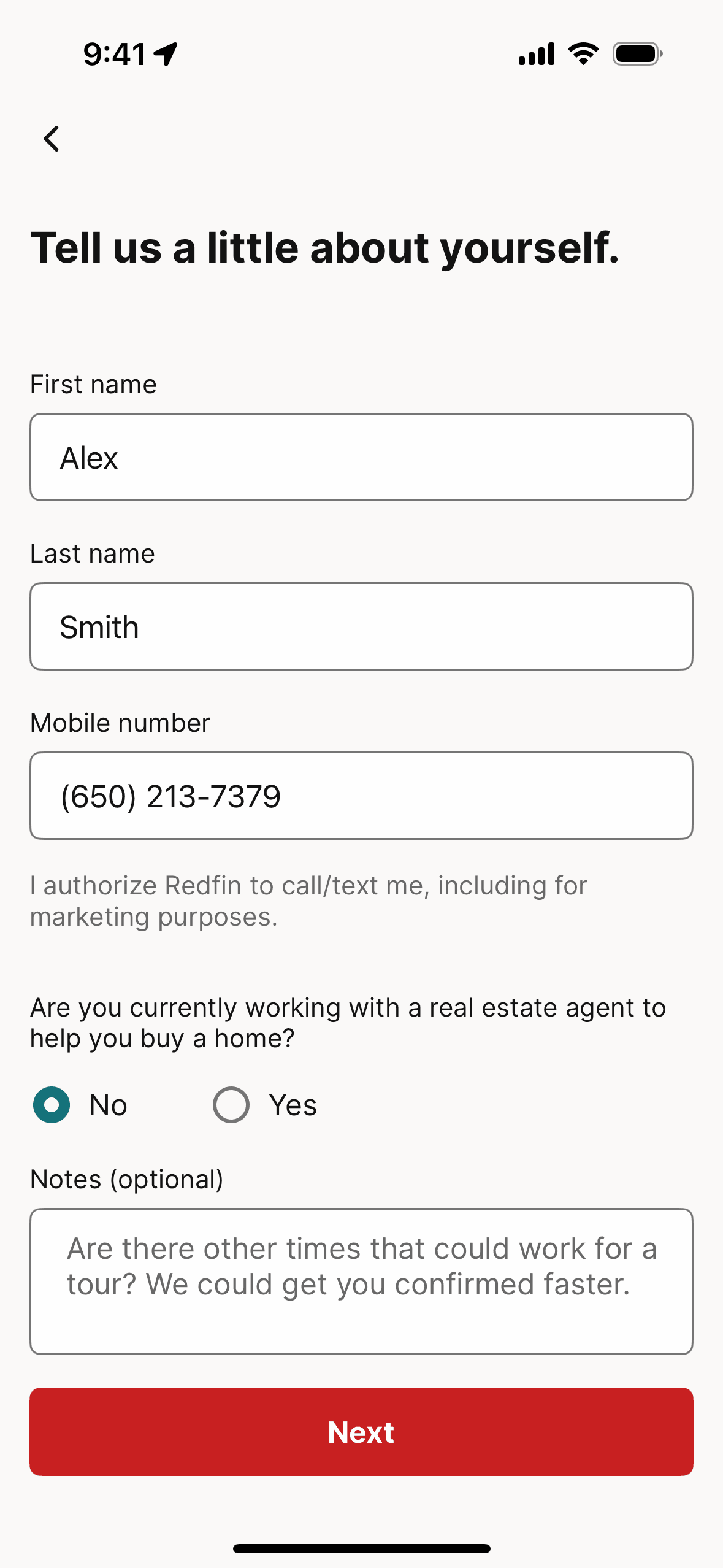 The user requests a tour of a property by selecting a date and time, providing personal information, and verifying their phone number. The app then confirms the tour request.