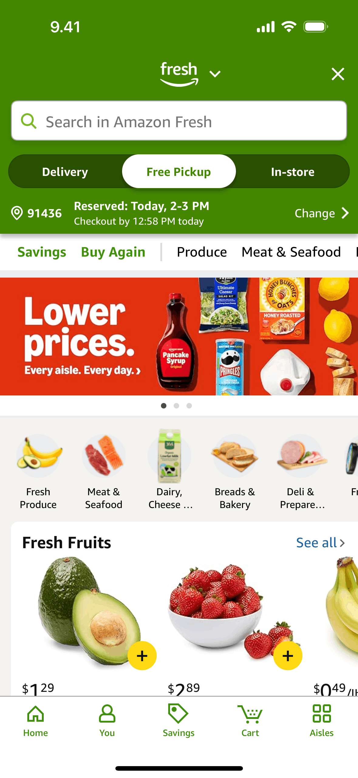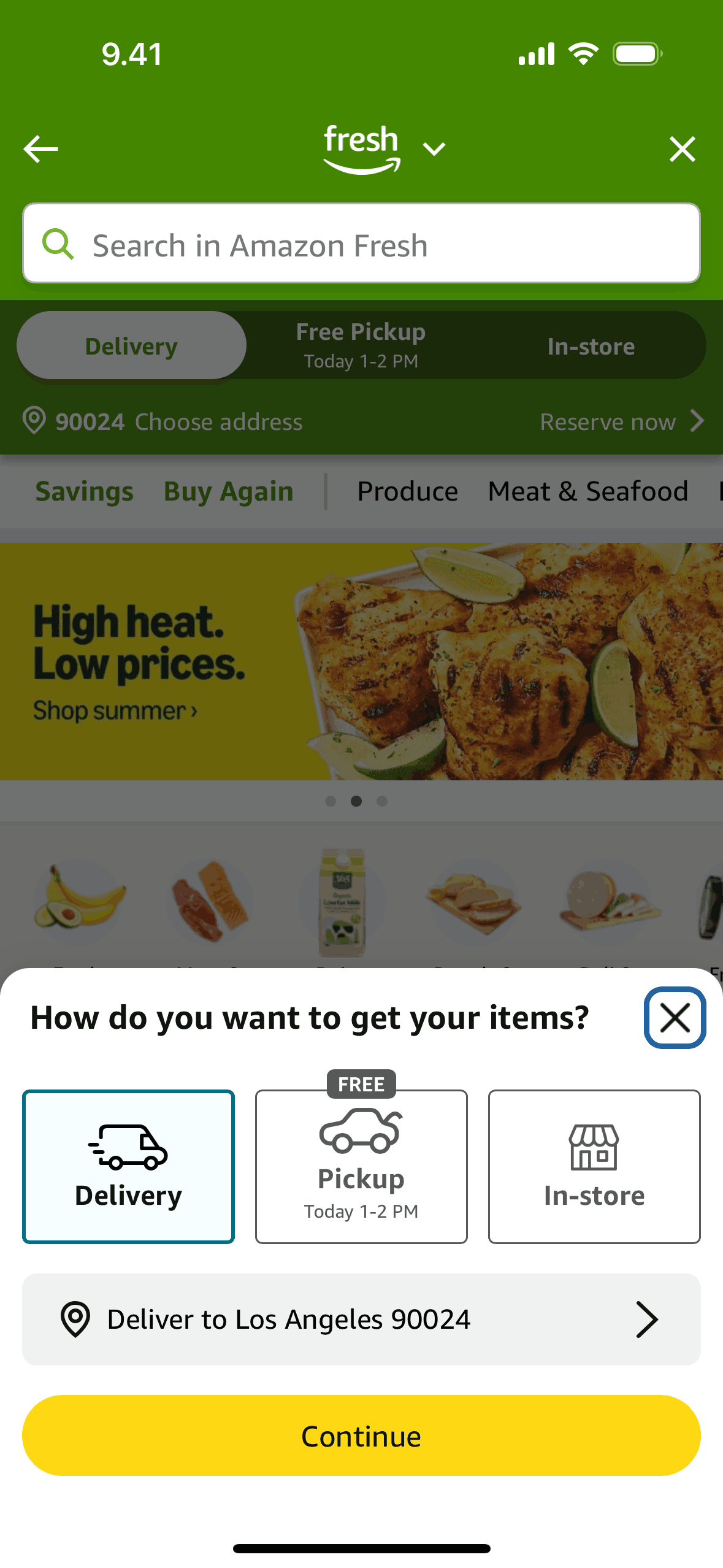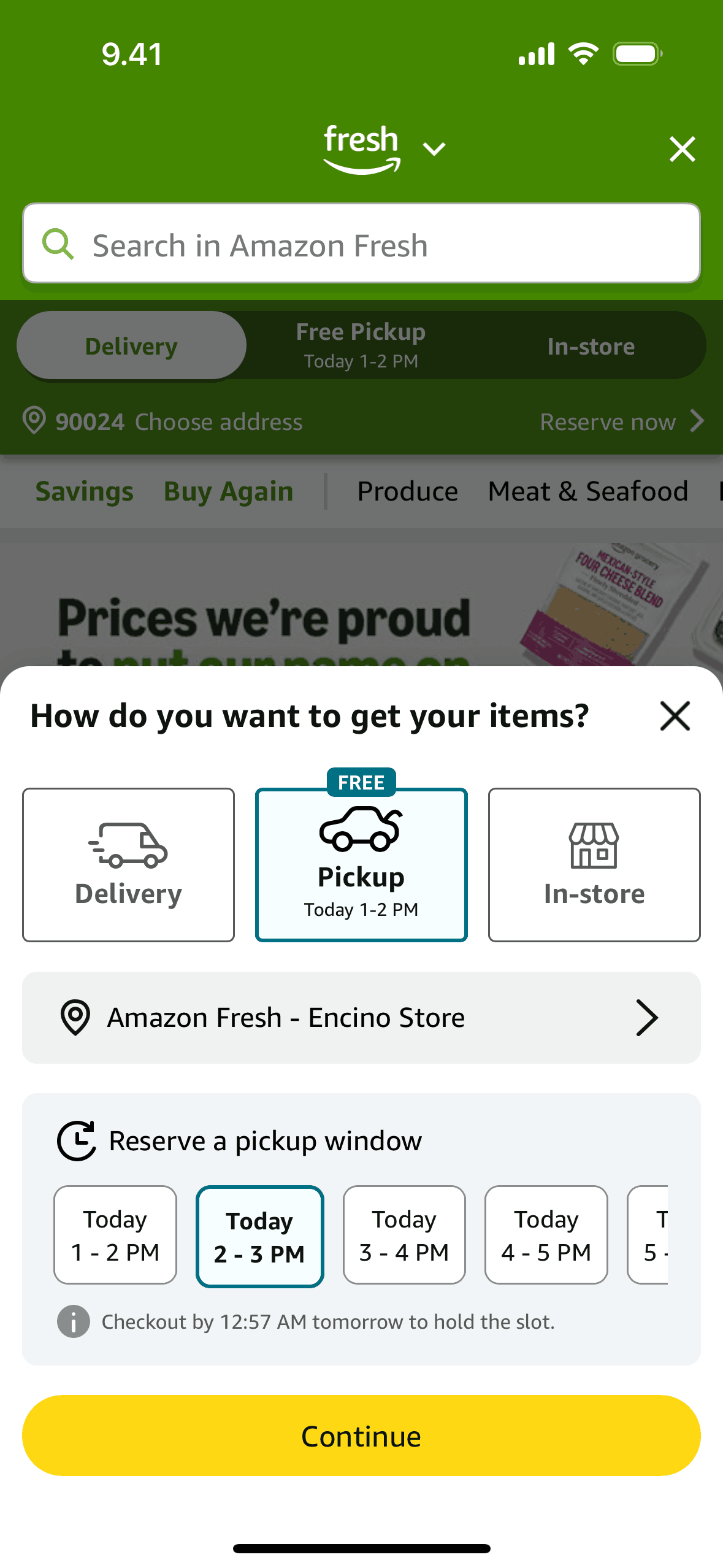 The user reserves a pickup slot through the Amazon Fresh app. They select a time and receive confirmation on the homepage.
