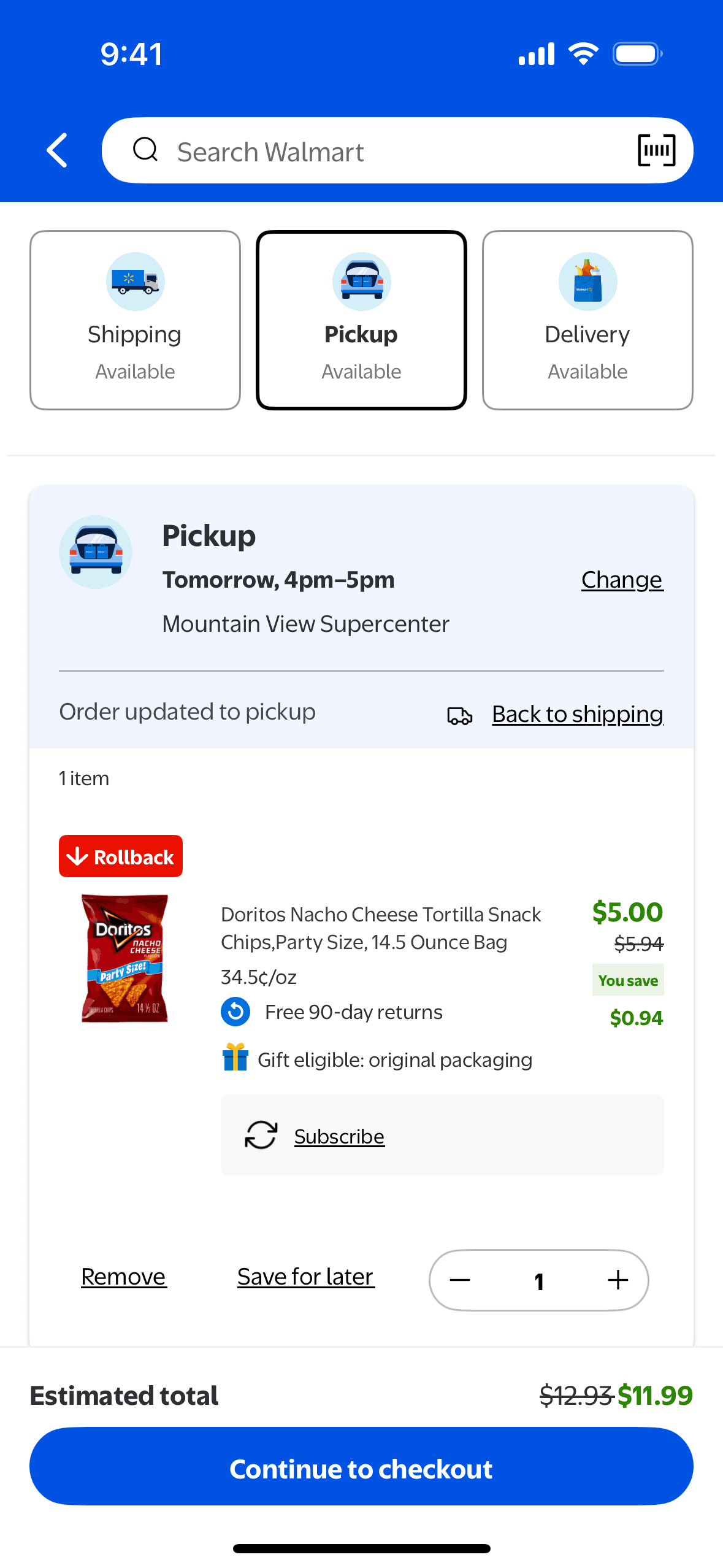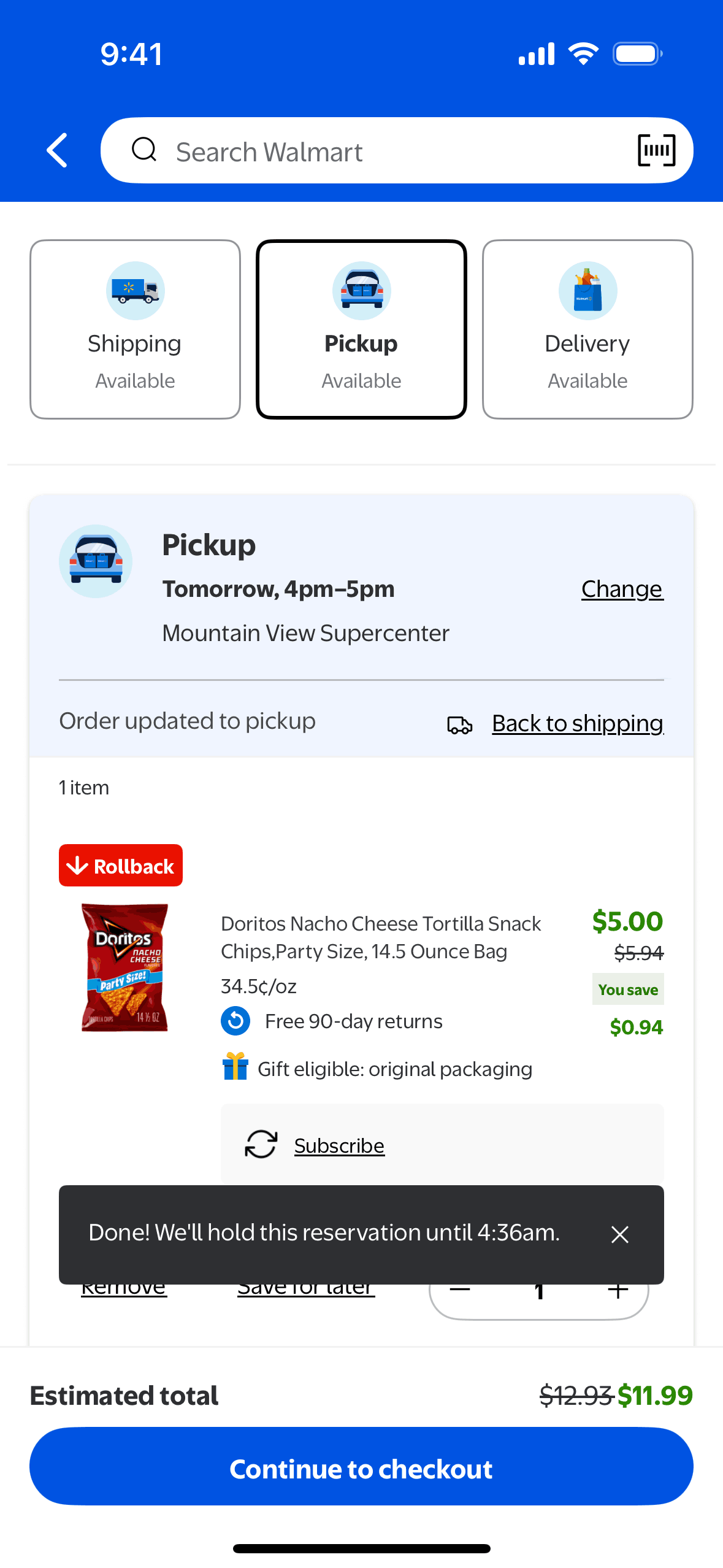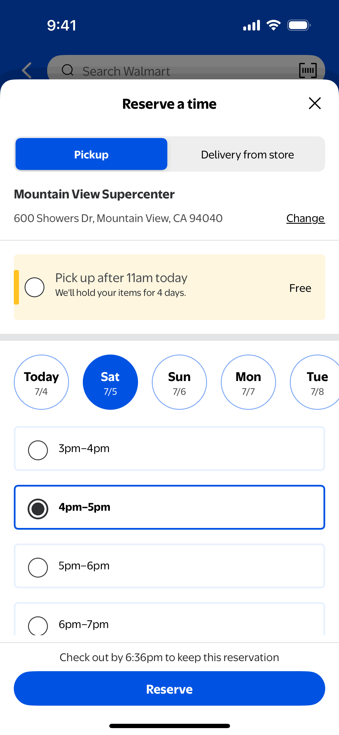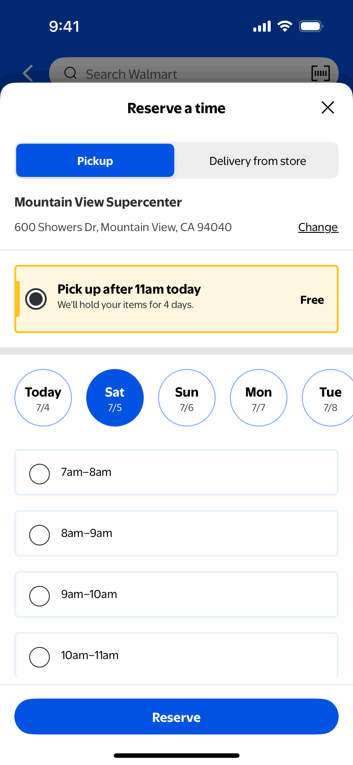 The user reserves a pickup slot through the Amazon Fresh app. They select a time and receive confirmation on the homepage.