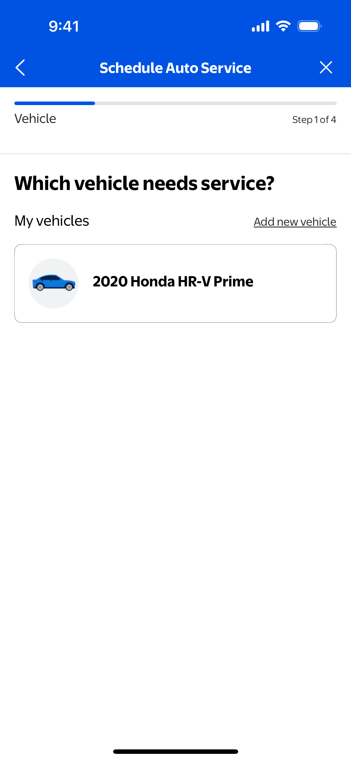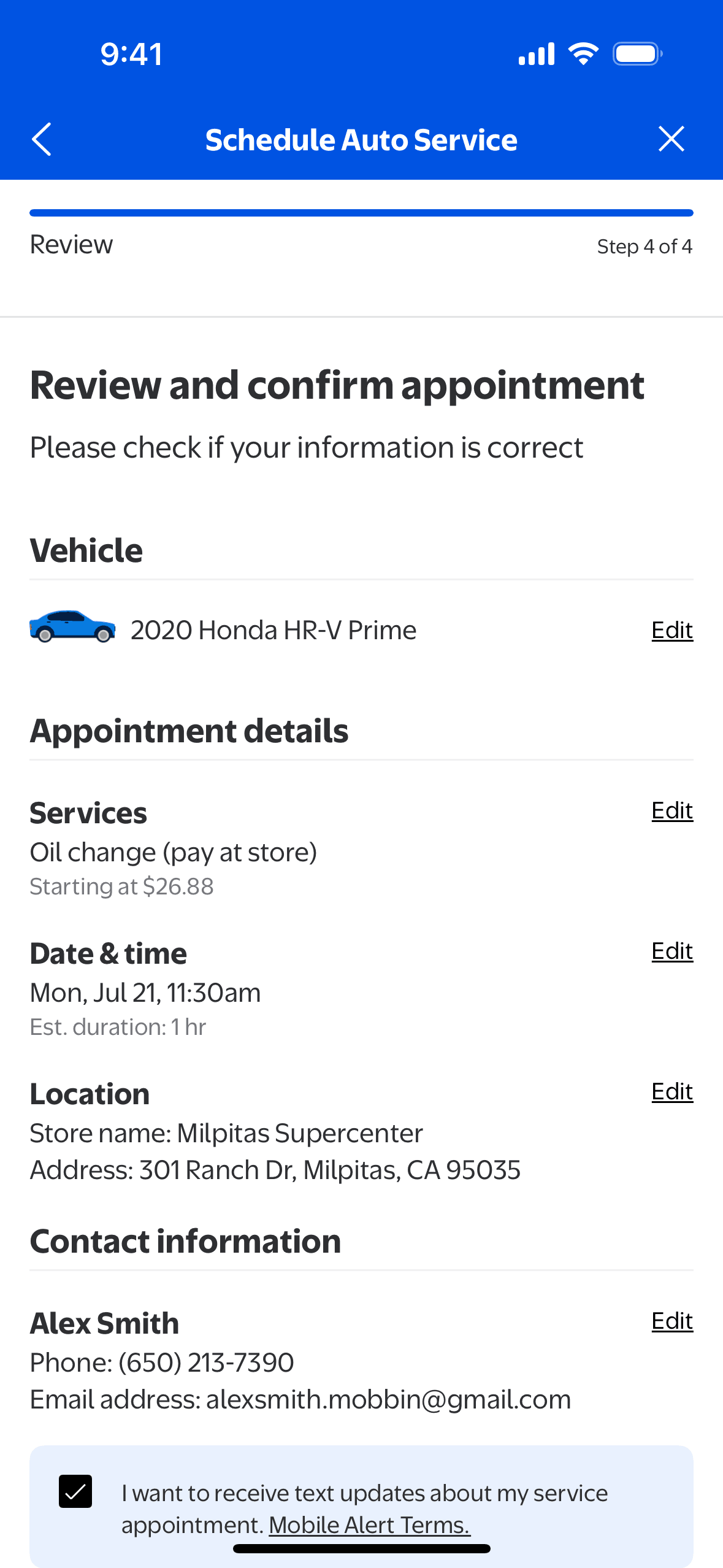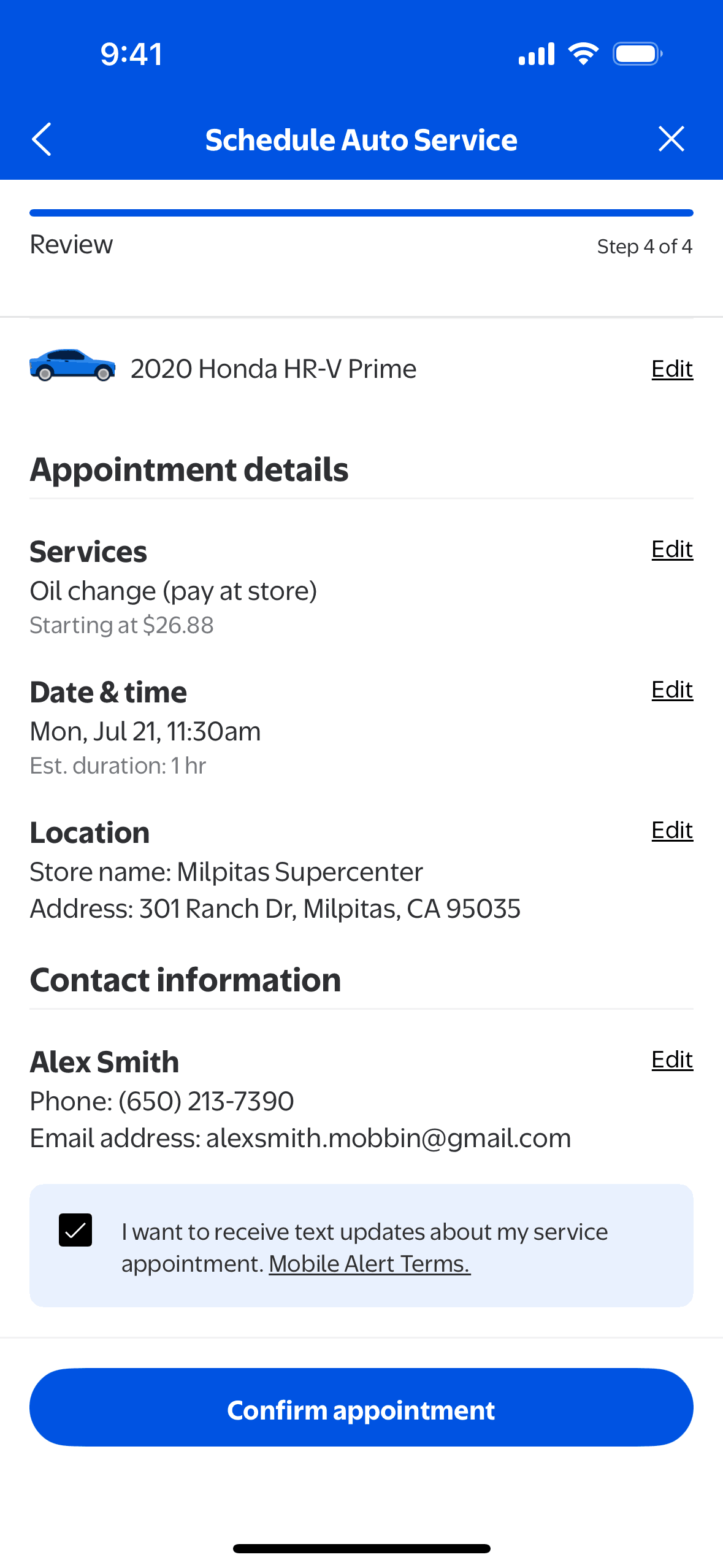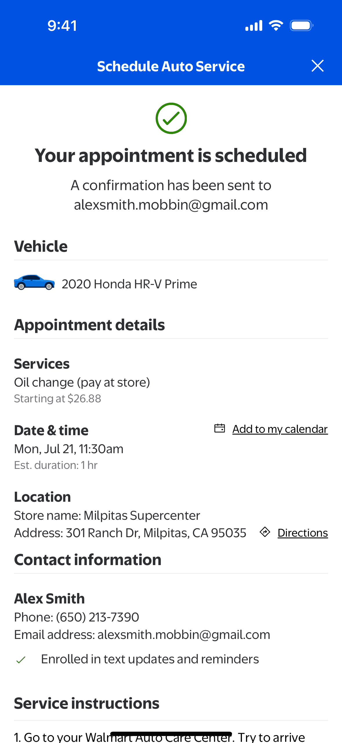 The user flow demonstrates scheduling a service for a vehicle, including store selection, service type, date/time selection, and final confirmation. The user successfully books an appointment.