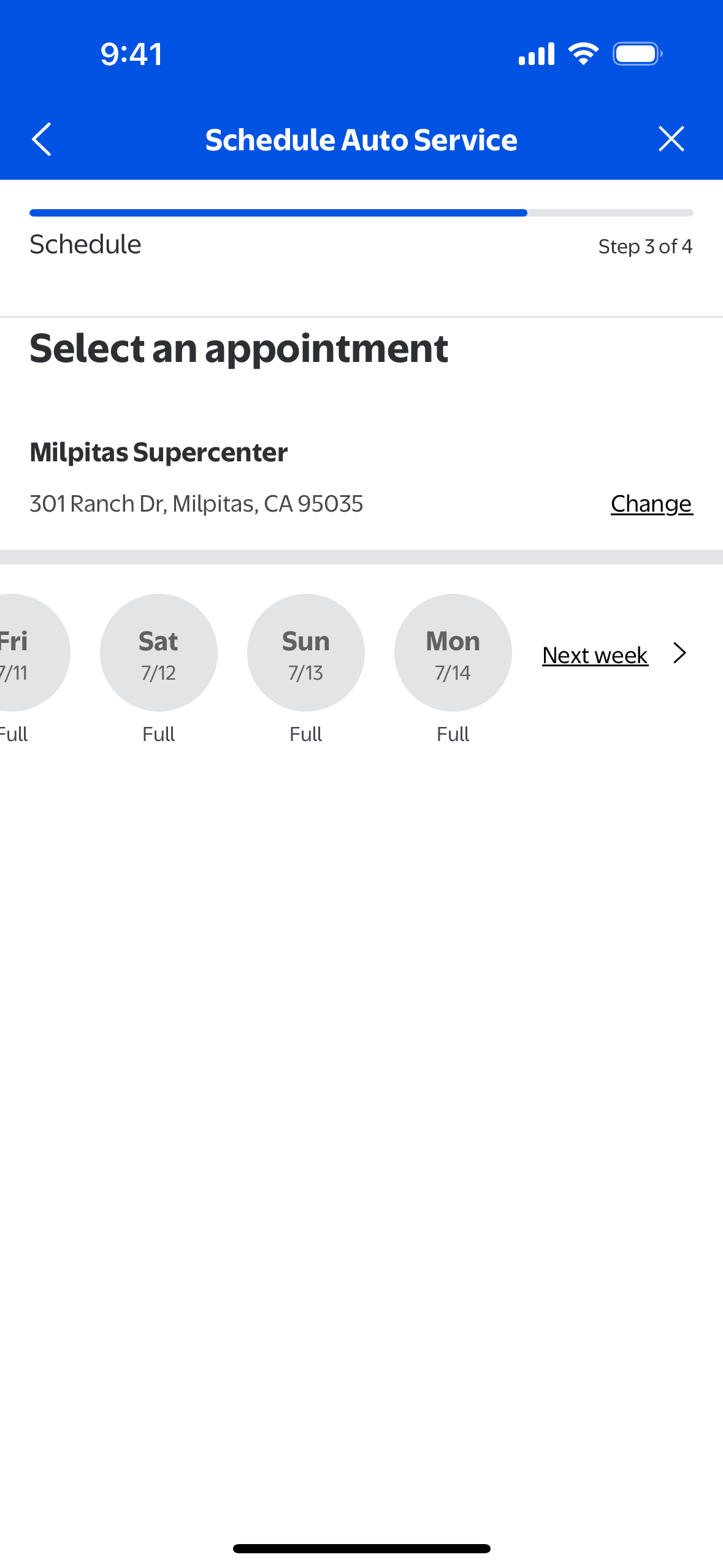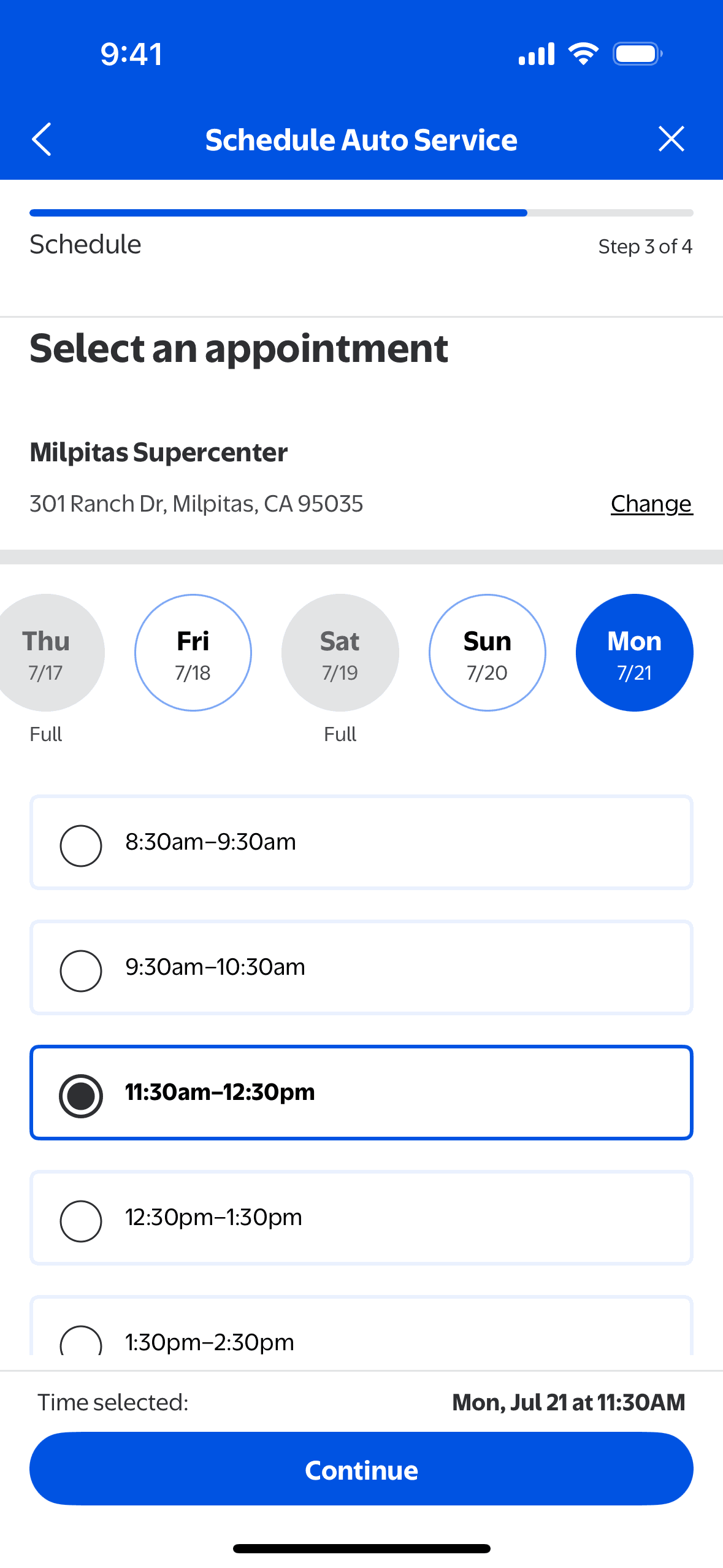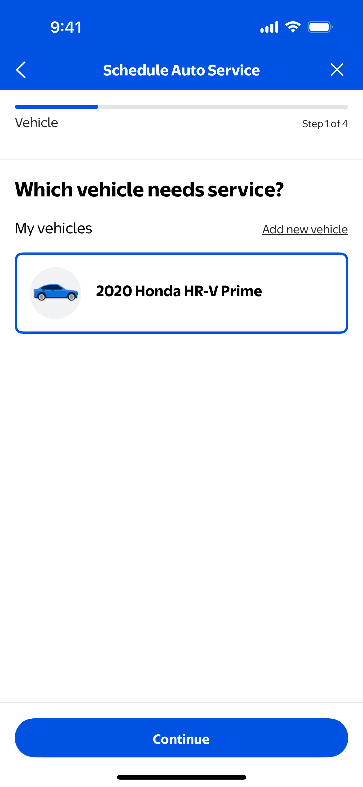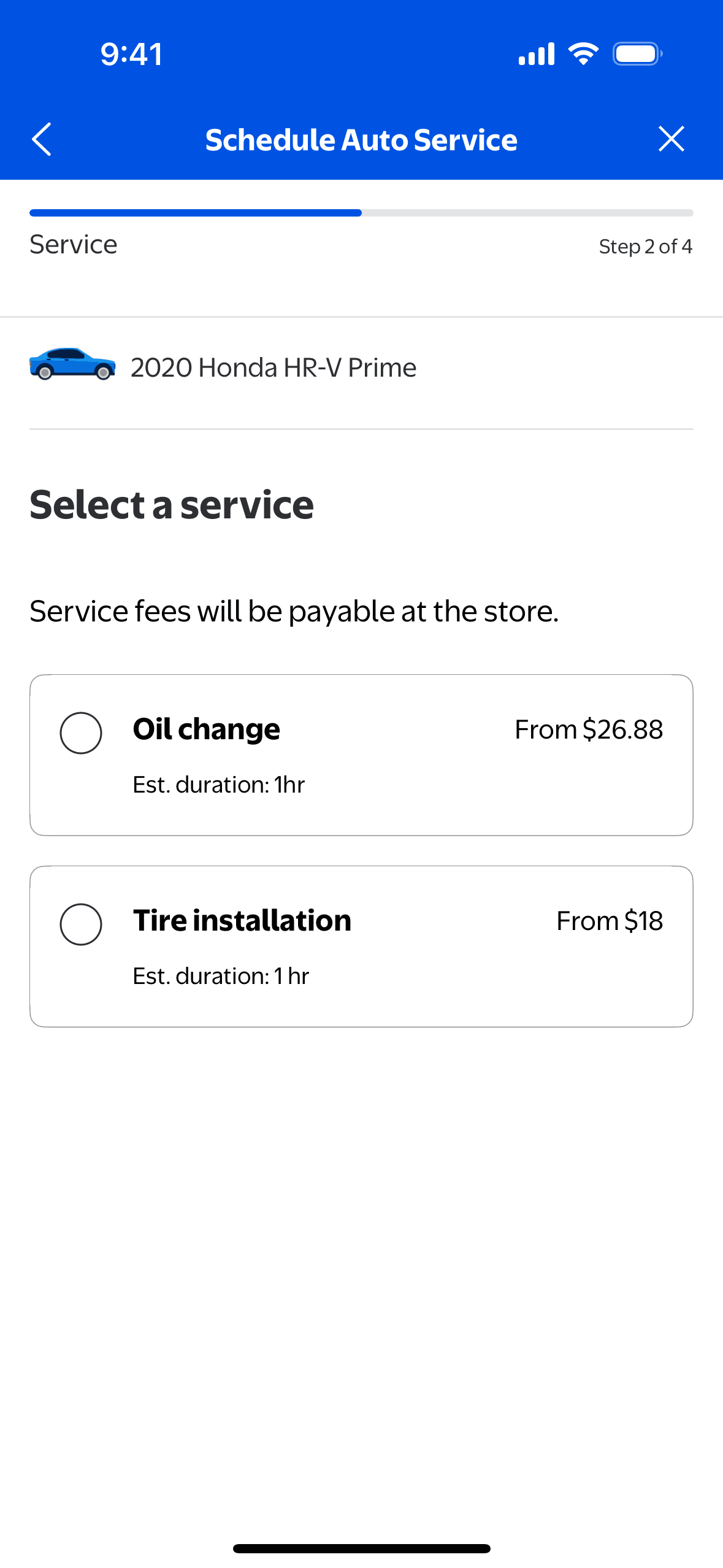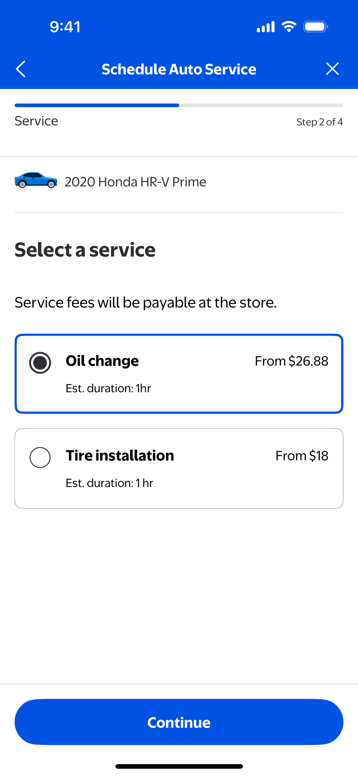 The user flow demonstrates scheduling a service for a vehicle, including store selection, service type, date/time selection, and final confirmation. The user successfully books an appointment.
