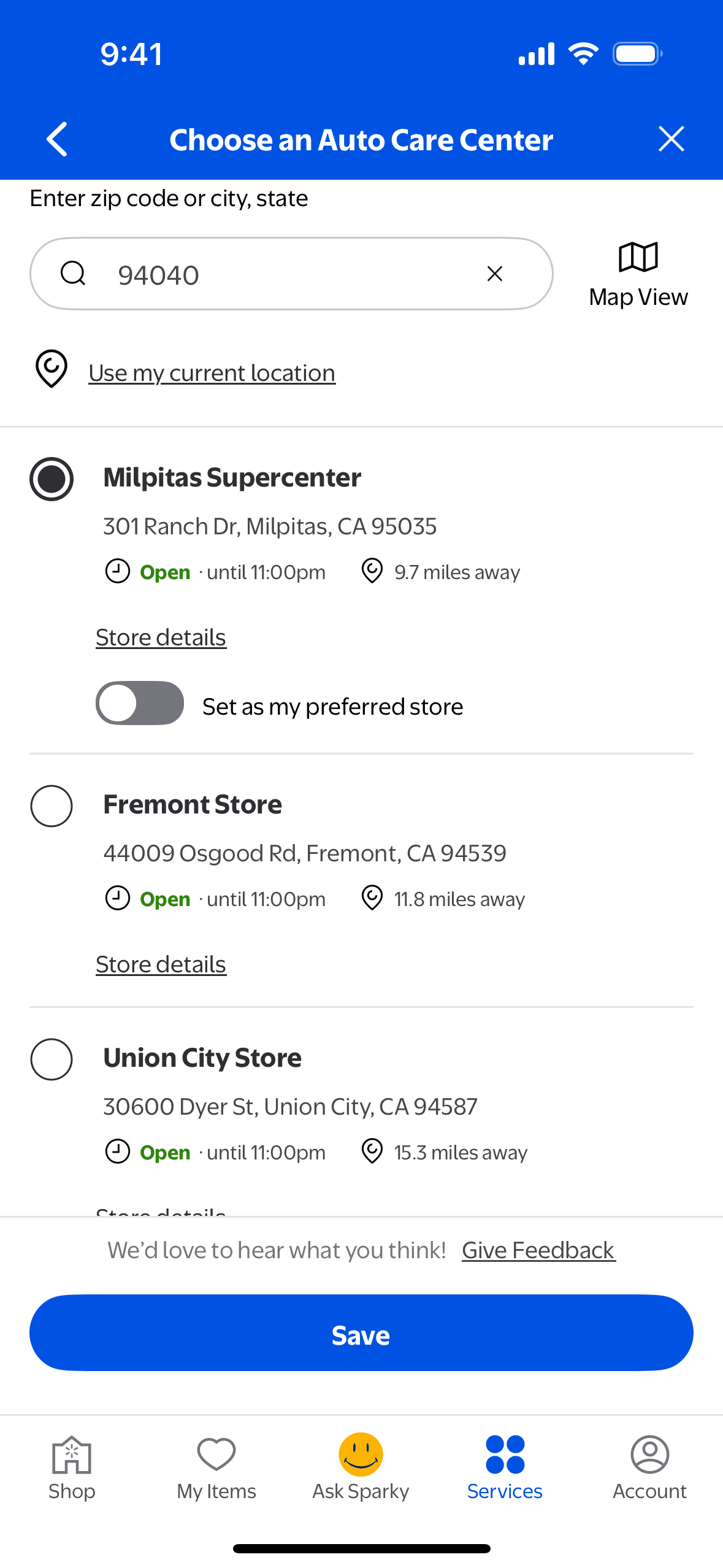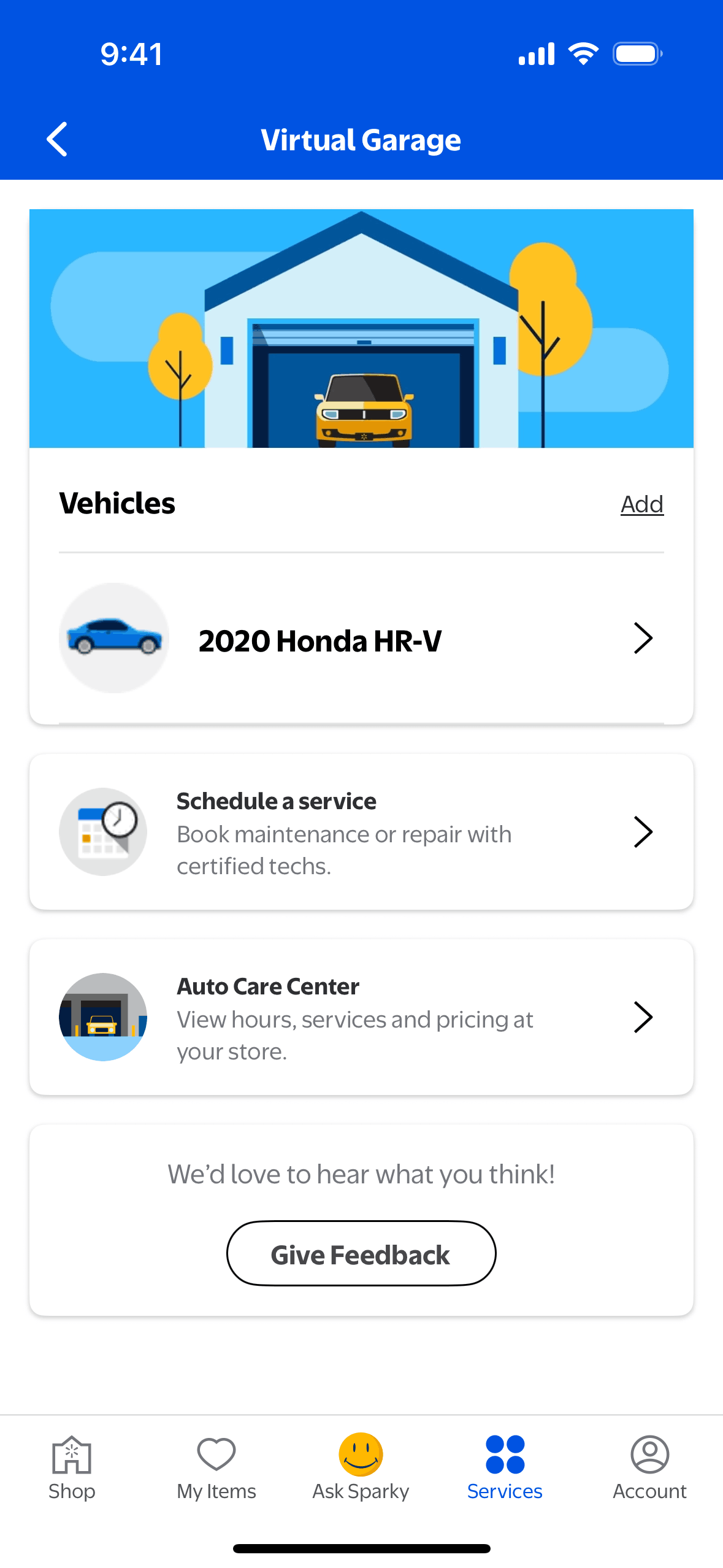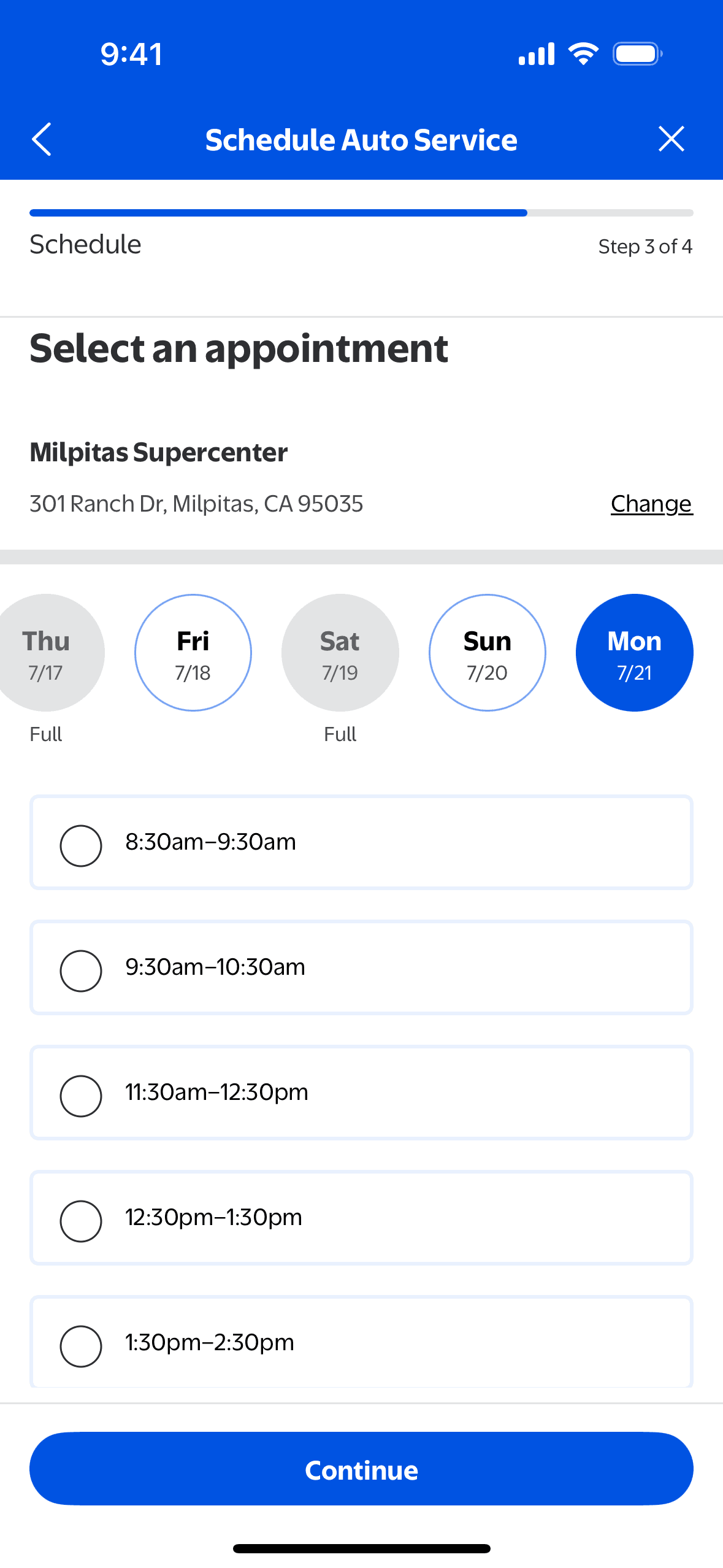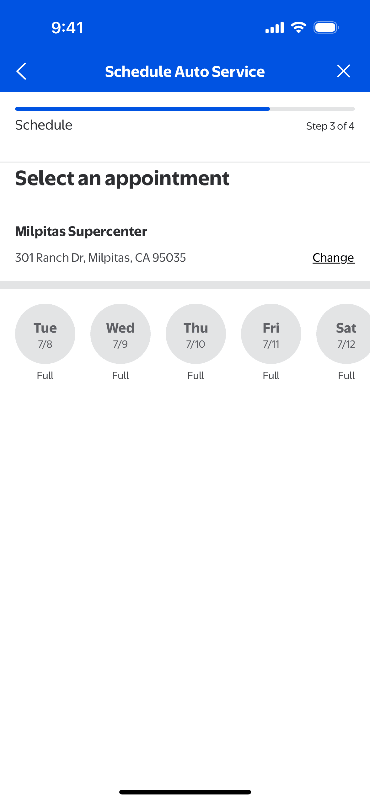 The user flow demonstrates scheduling a service for a vehicle, including store selection, service type, date/time selection, and final confirmation. The user successfully books an appointment.