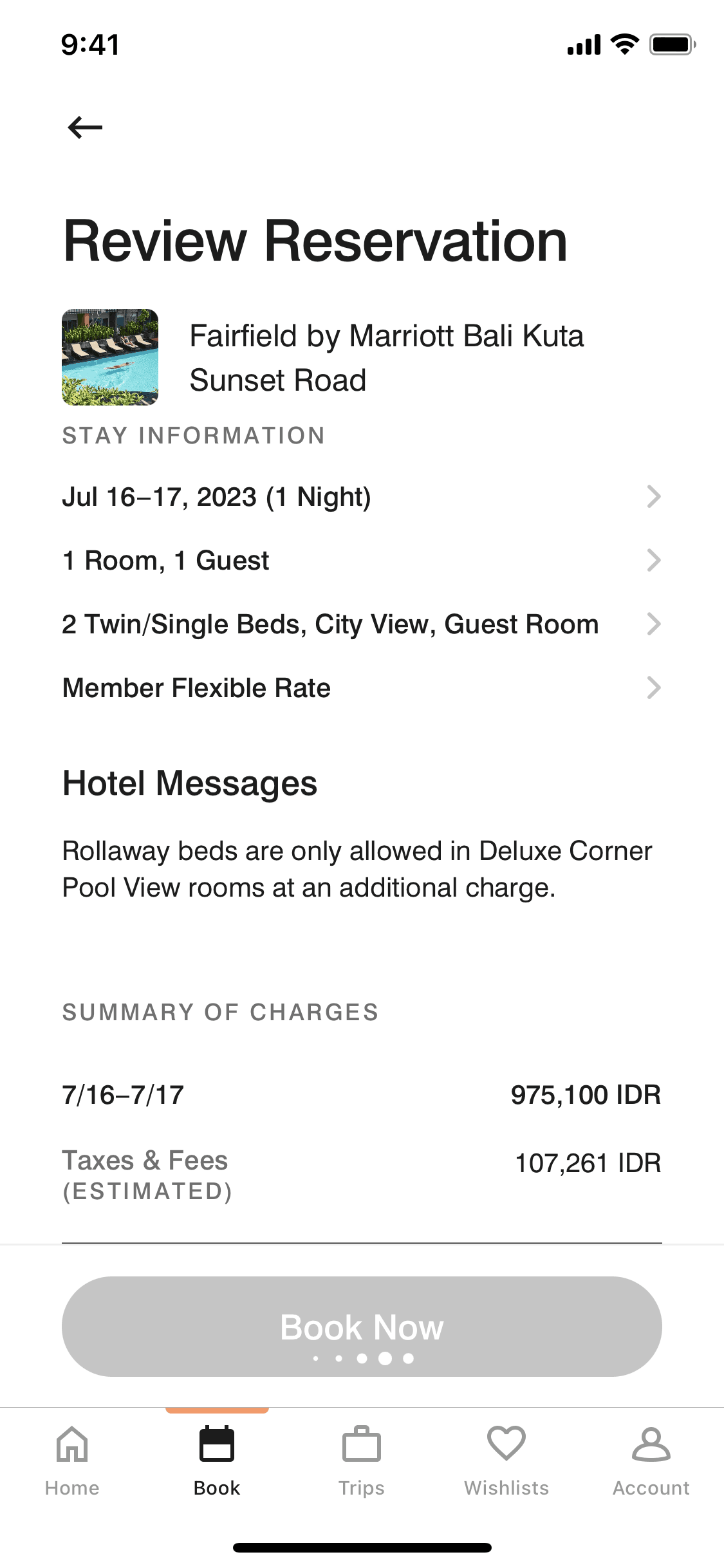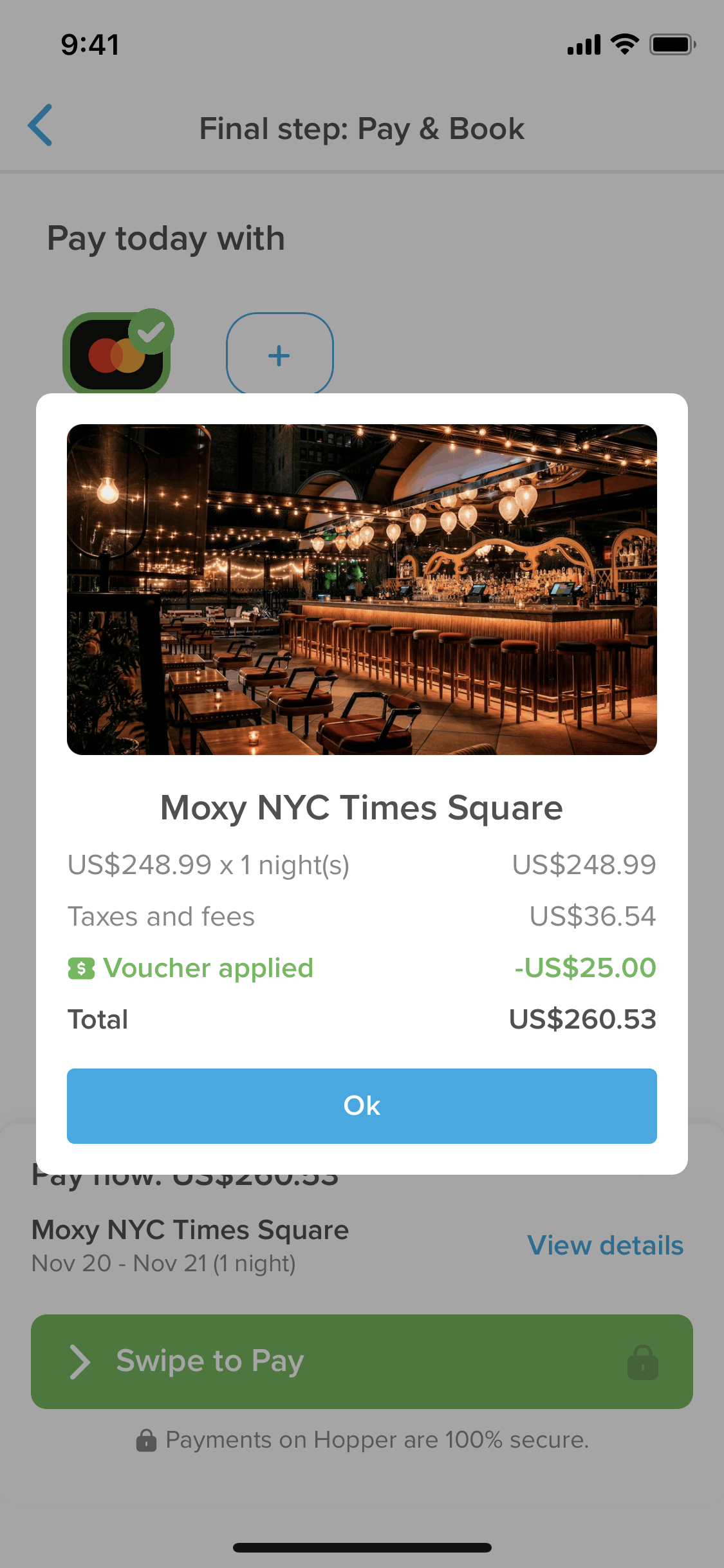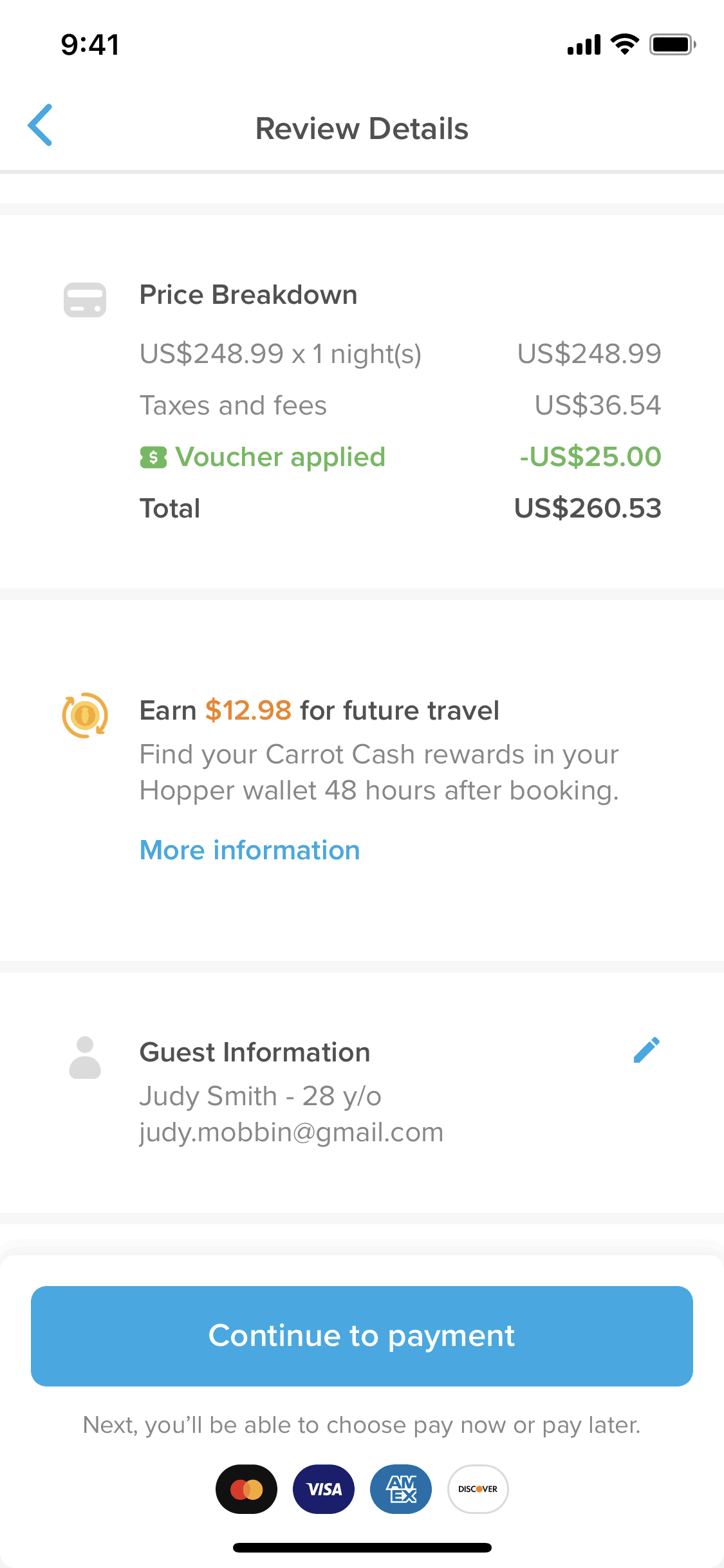 The user books a hotel room by selecting a room, adding extras, entering guest details, and completing the payment. The flow ends with a booking confirmation and feedback request.