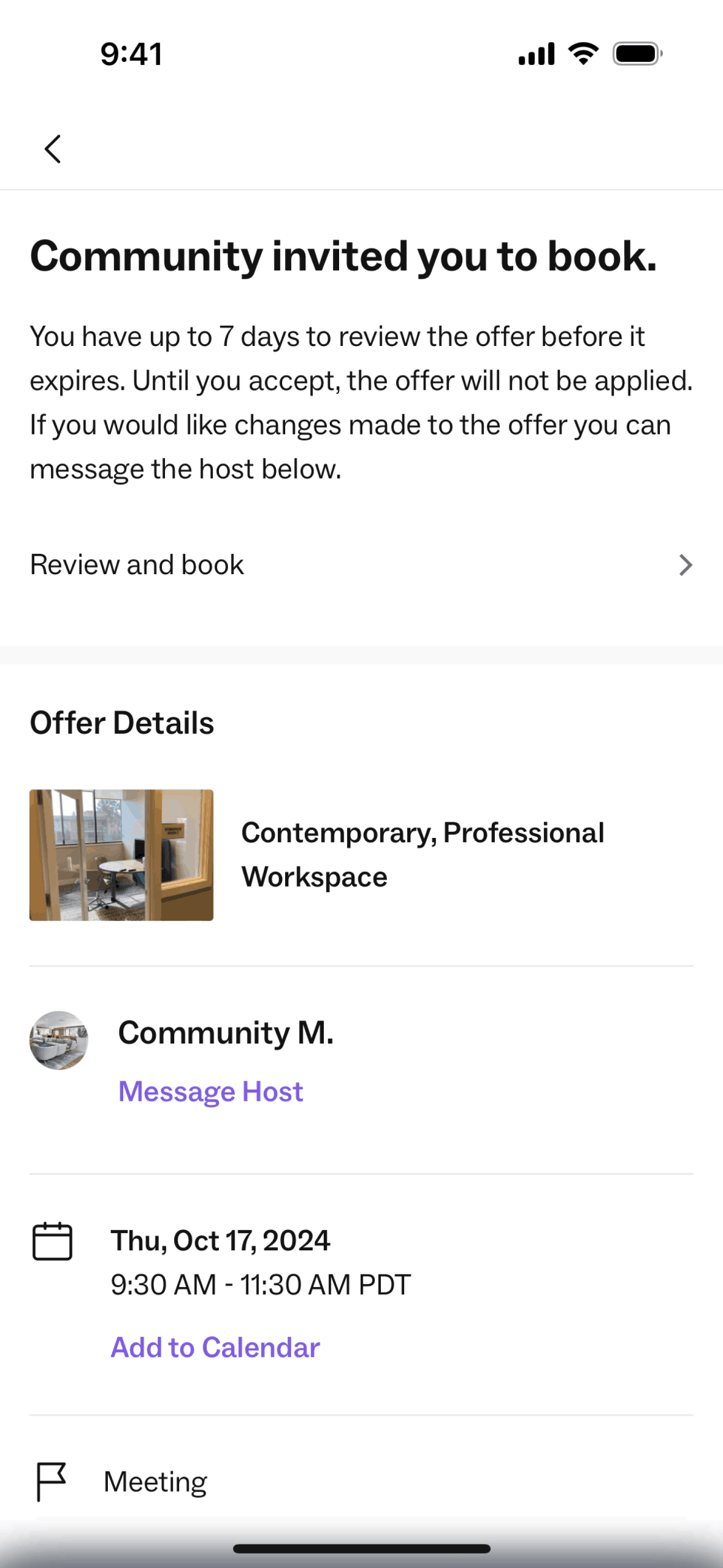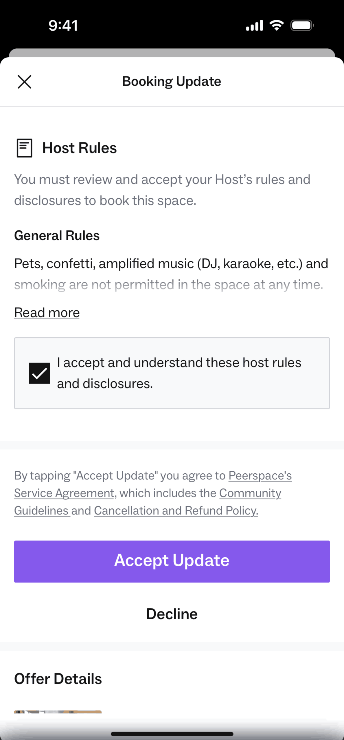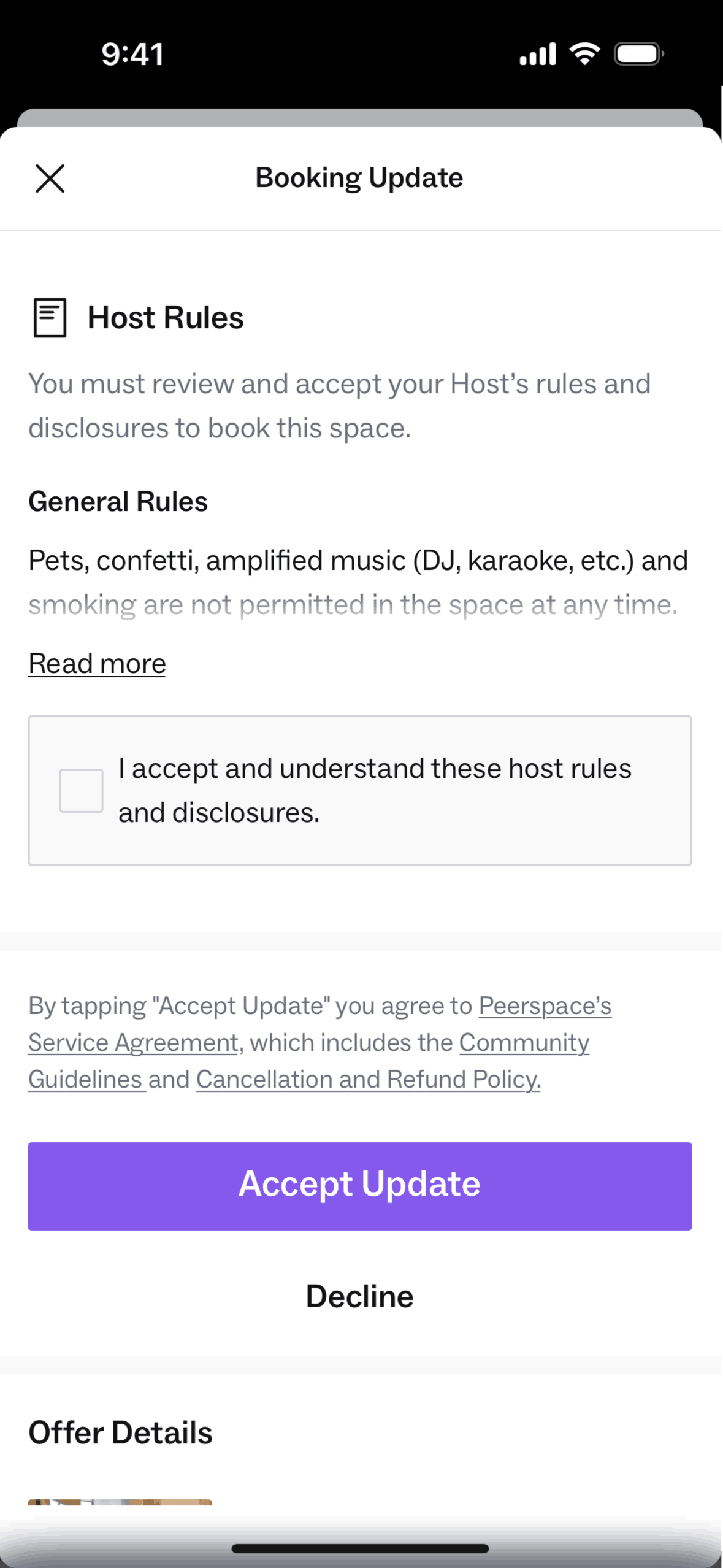 The user receives a booking offer, reviews the details, accepts the host rules, and confirms the booking. The flow concludes with a booking confirmation.
