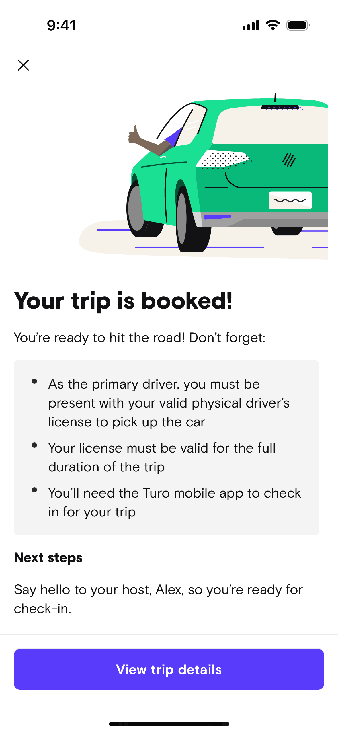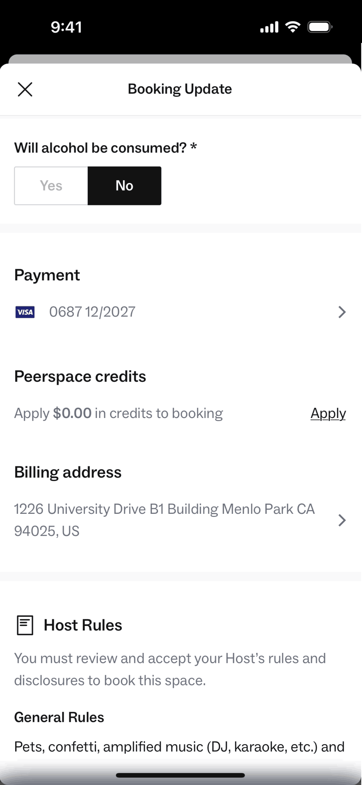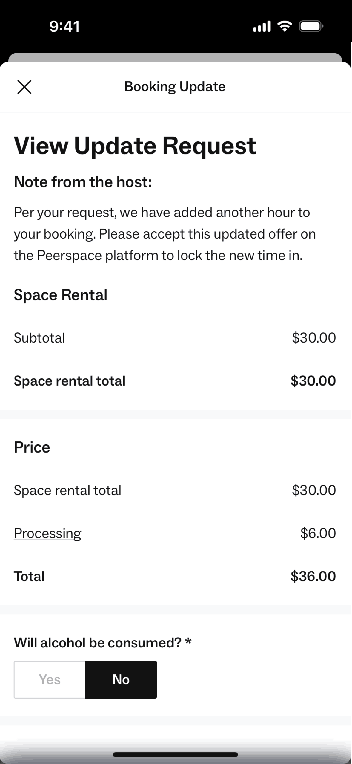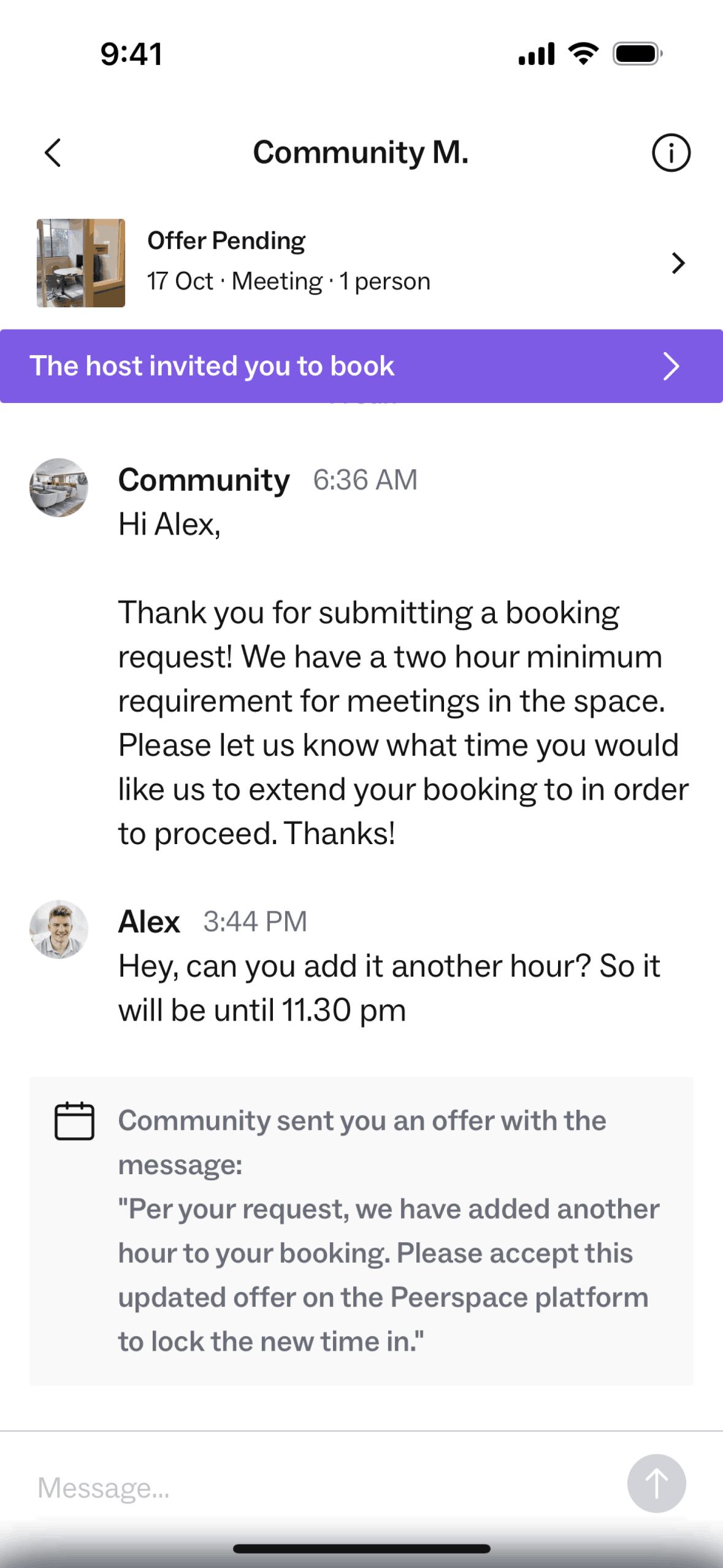 The user receives a booking offer, reviews the details, accepts the host rules, and confirms the booking. The flow concludes with a booking confirmation.