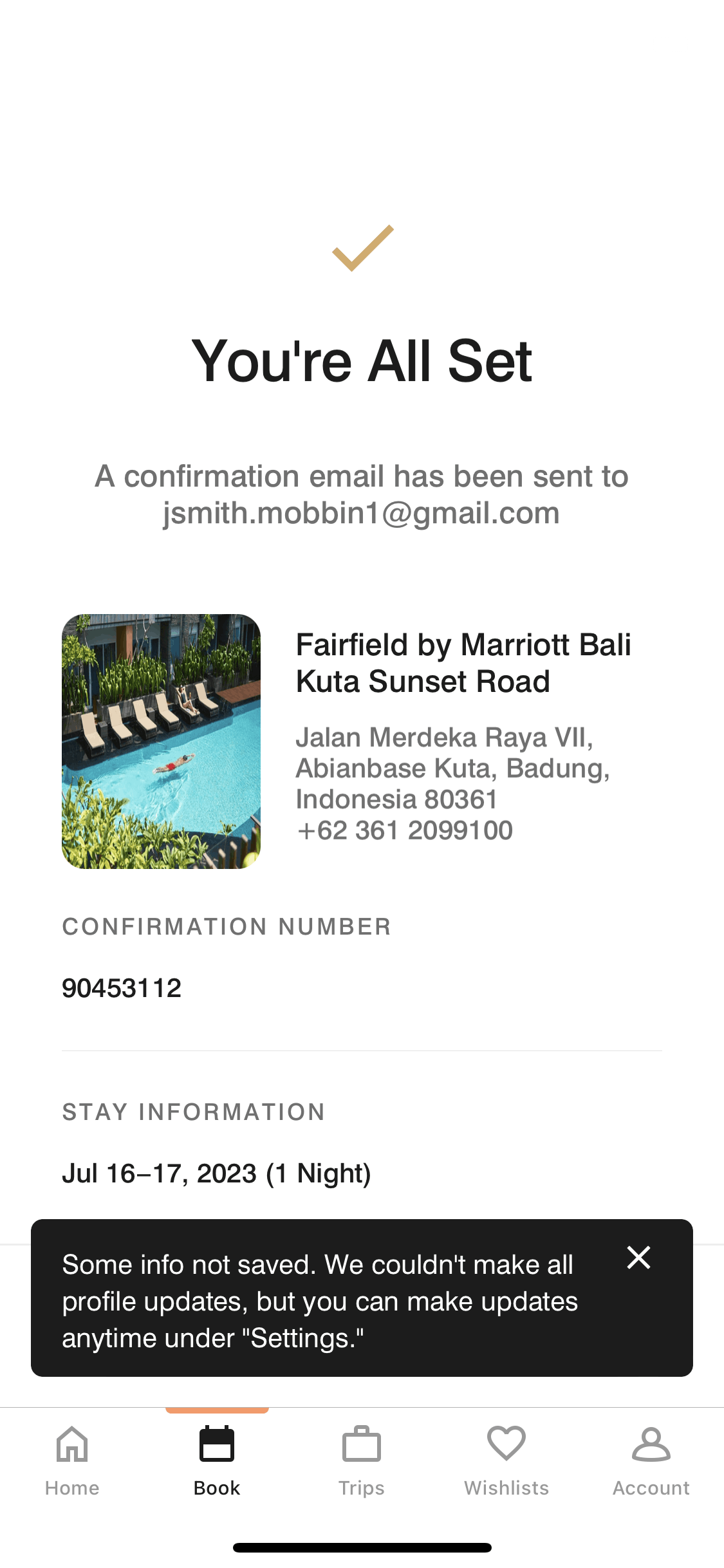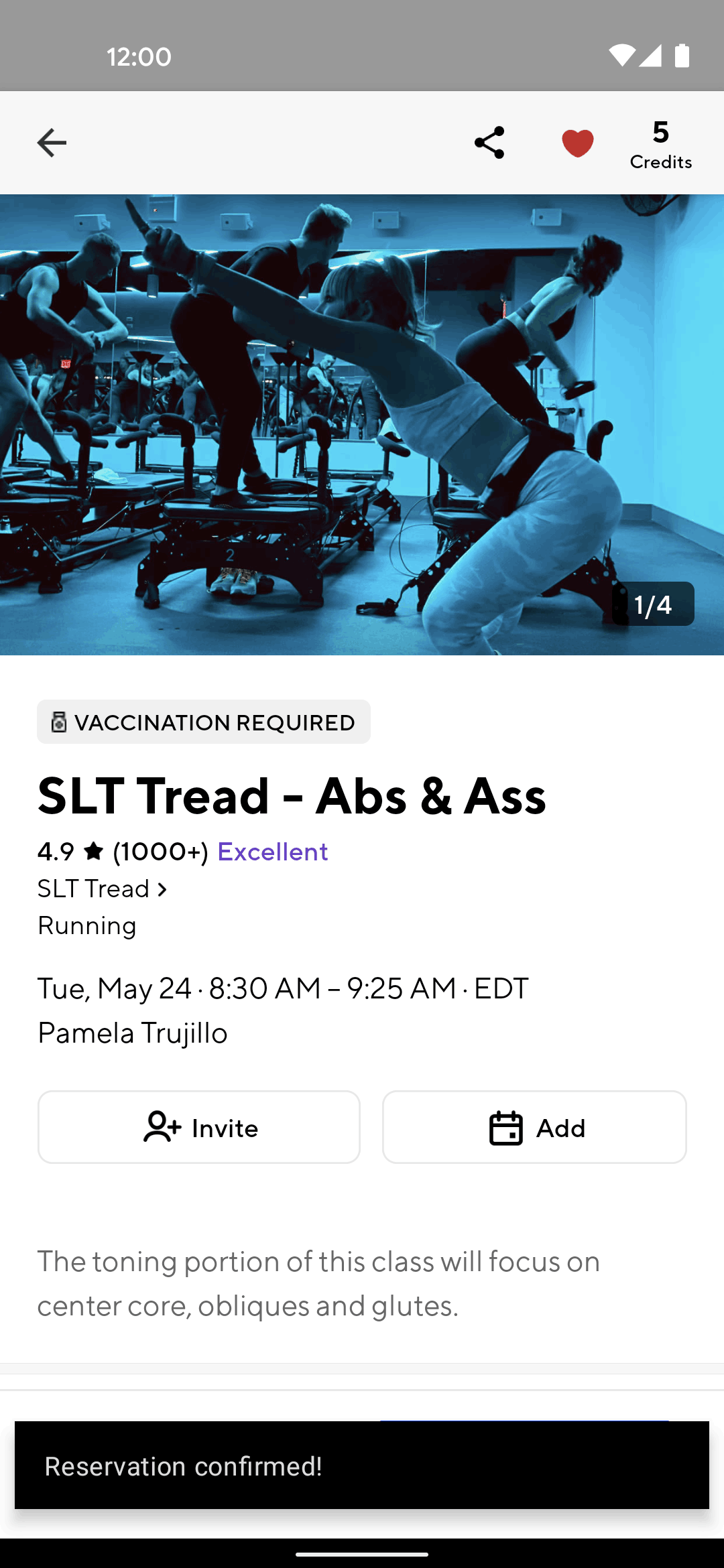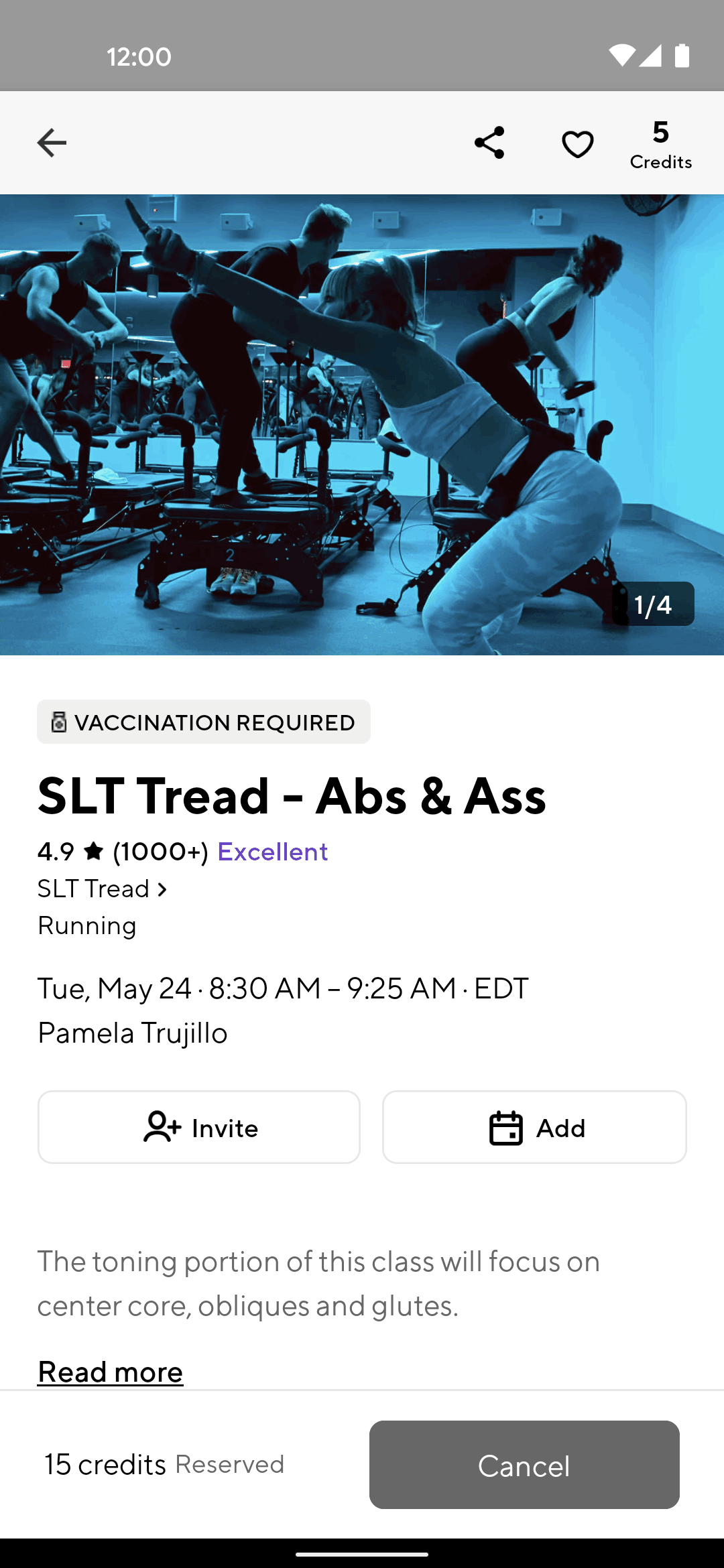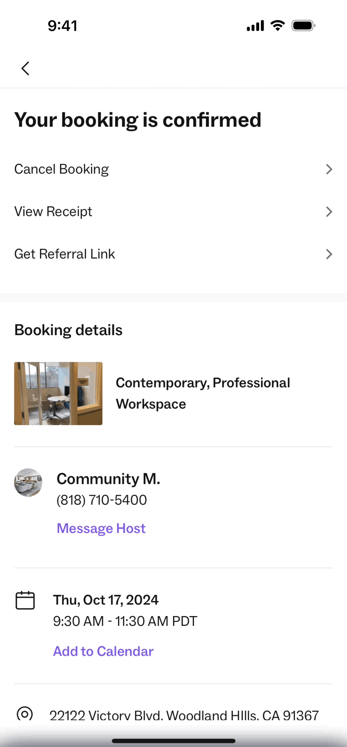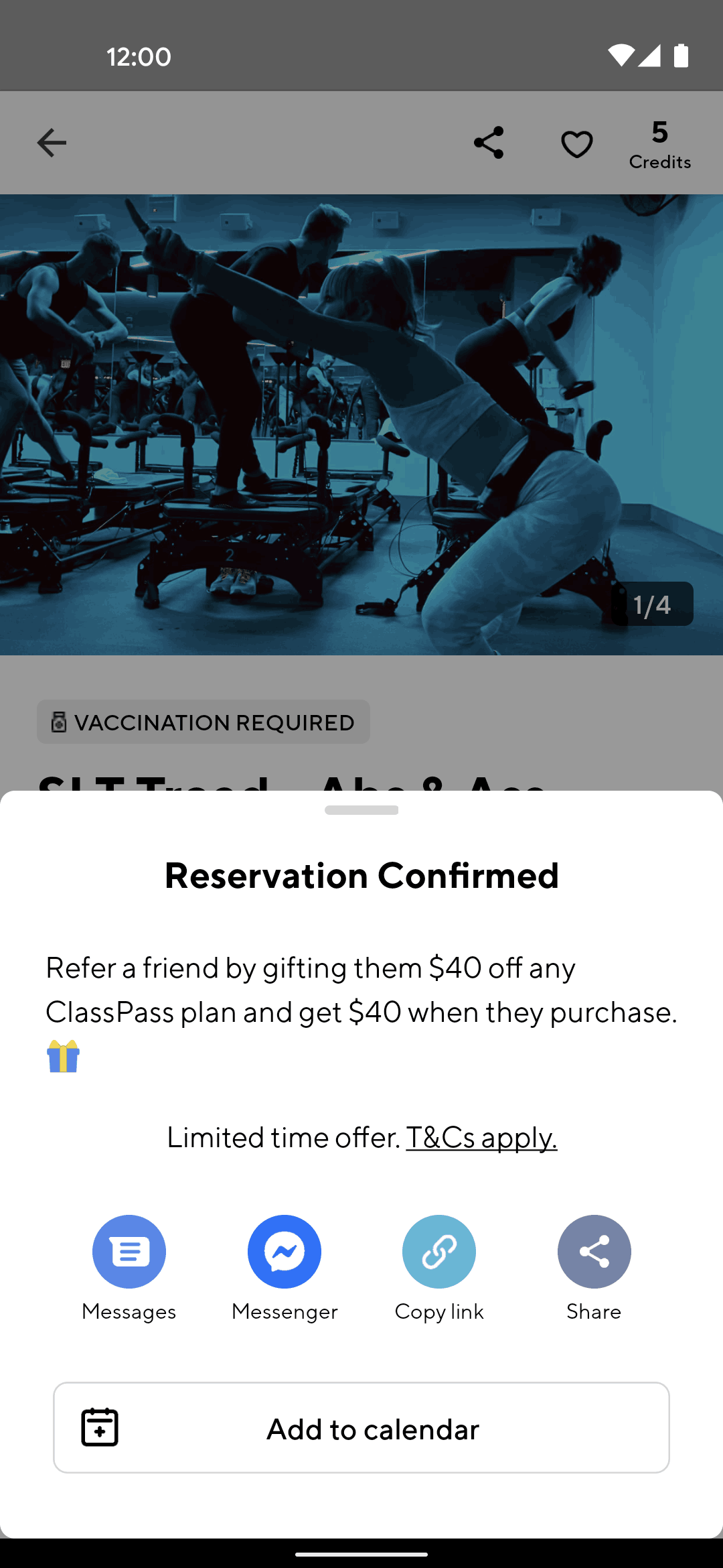 The user views a class, reserves it, and then is presented with a referral offer. Finally, the user has the option to cancel the reserved class.
