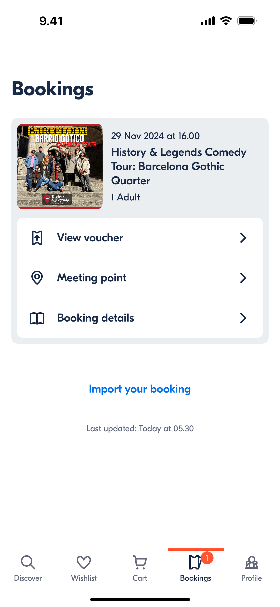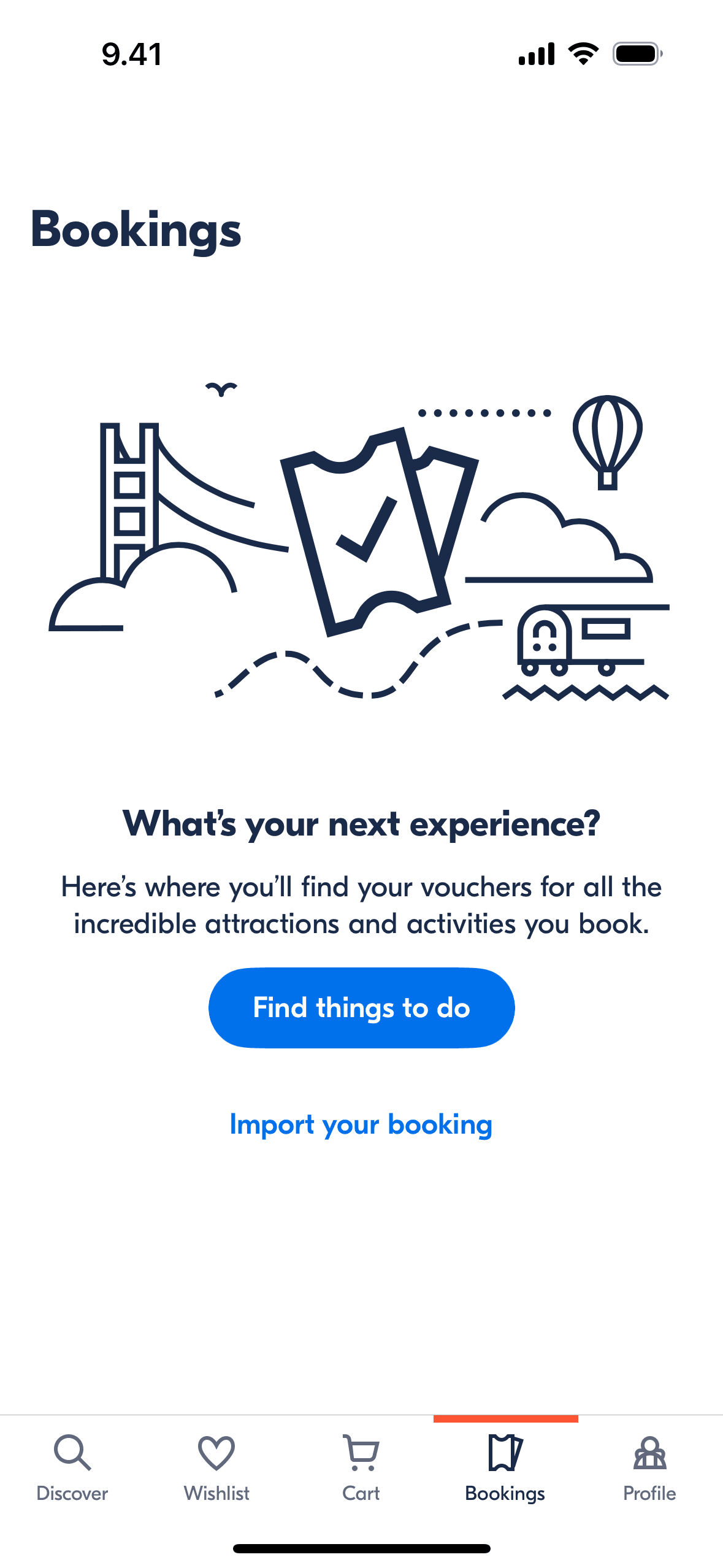 The user flow showcases how a user navigates to the bookings page and views their booking details after making a purchase. It also shows the initial state of the bookings page when no bookings have been made.