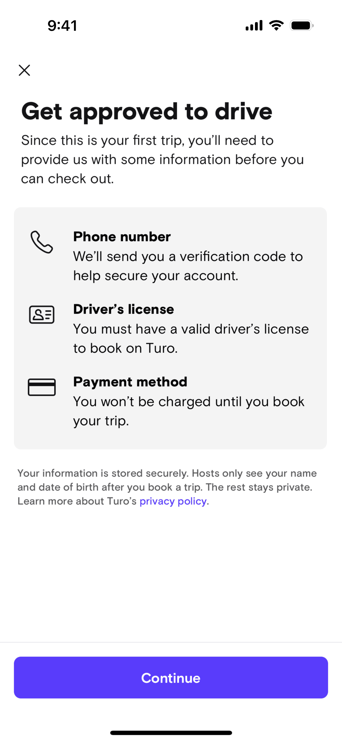 The user books a car rental by verifying their email, providing personal information, reviewing trip details, and confirming the booking. The flow culminates in a booking confirmation.