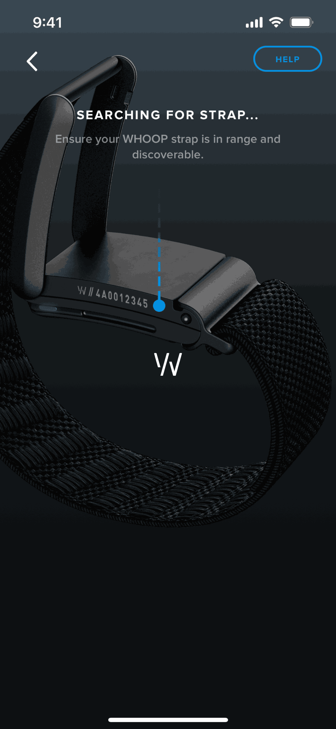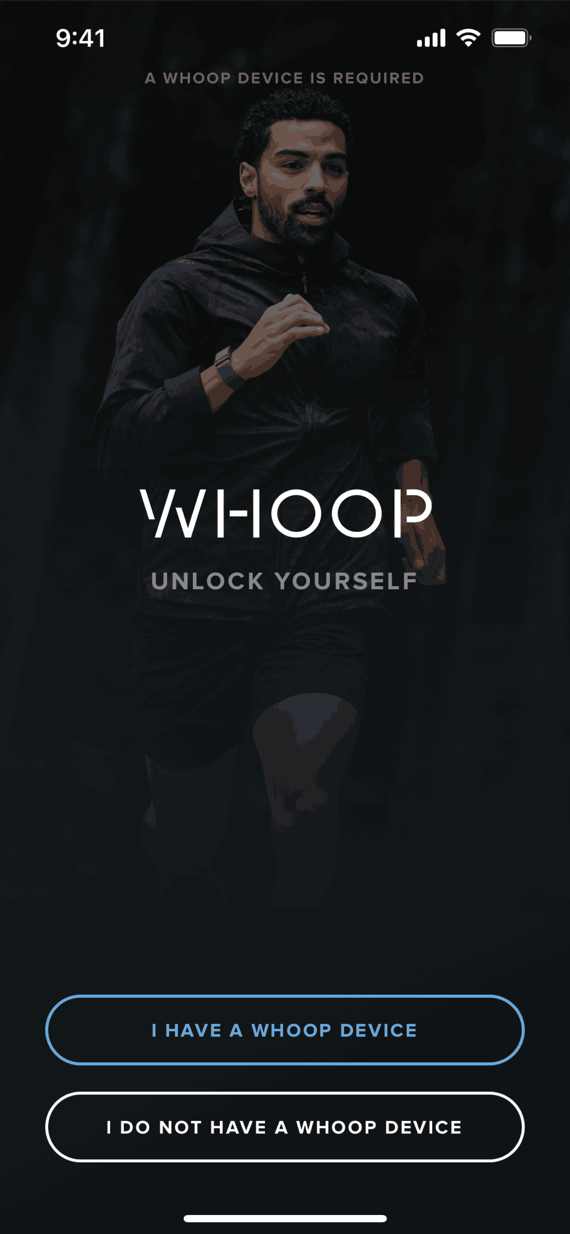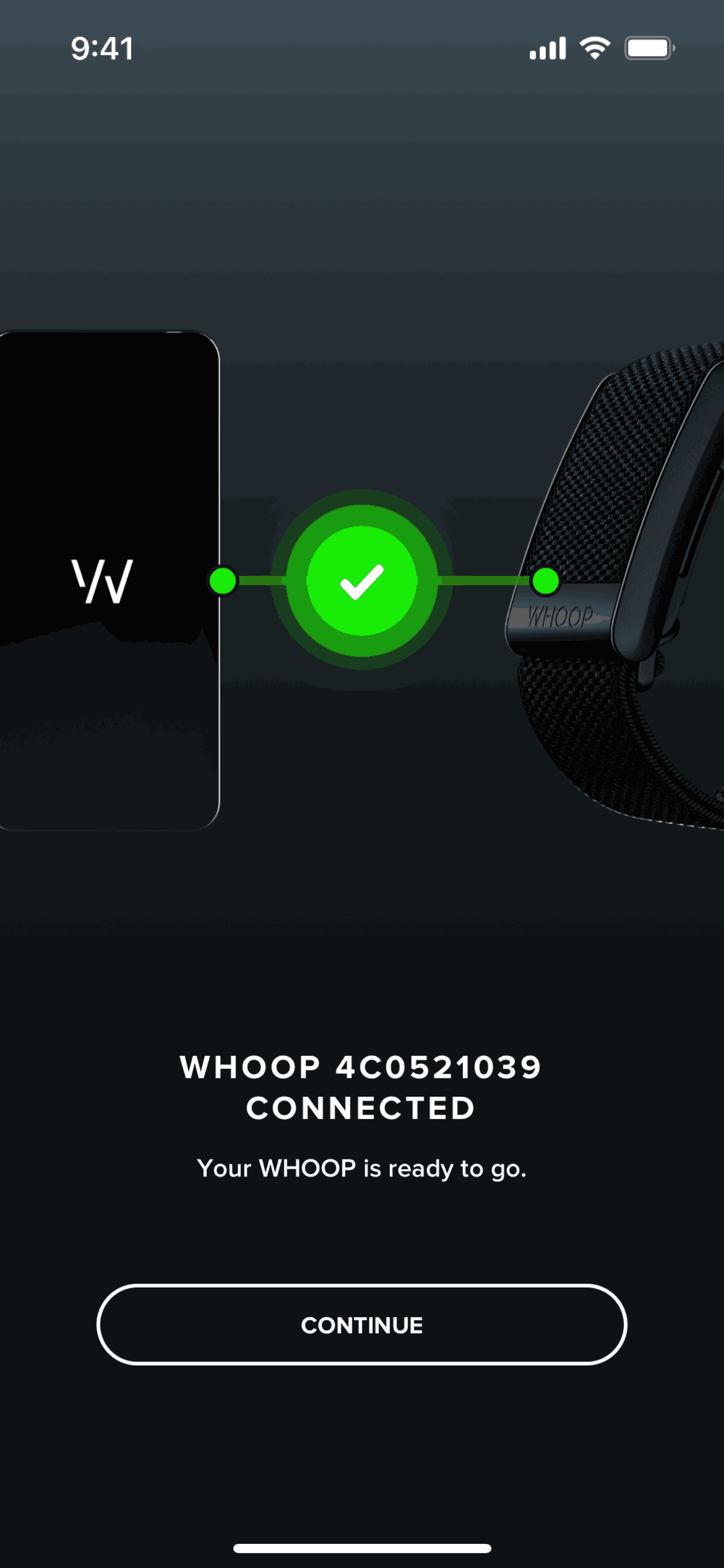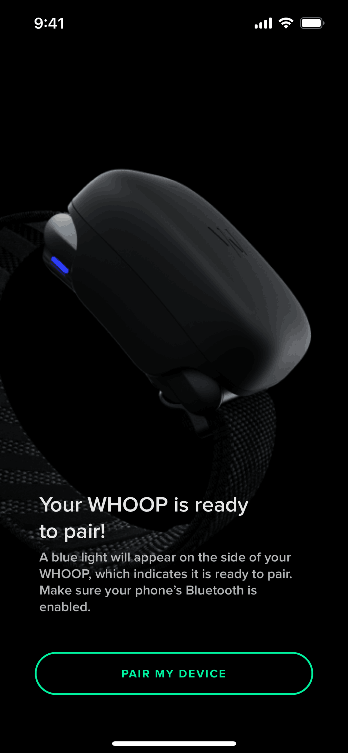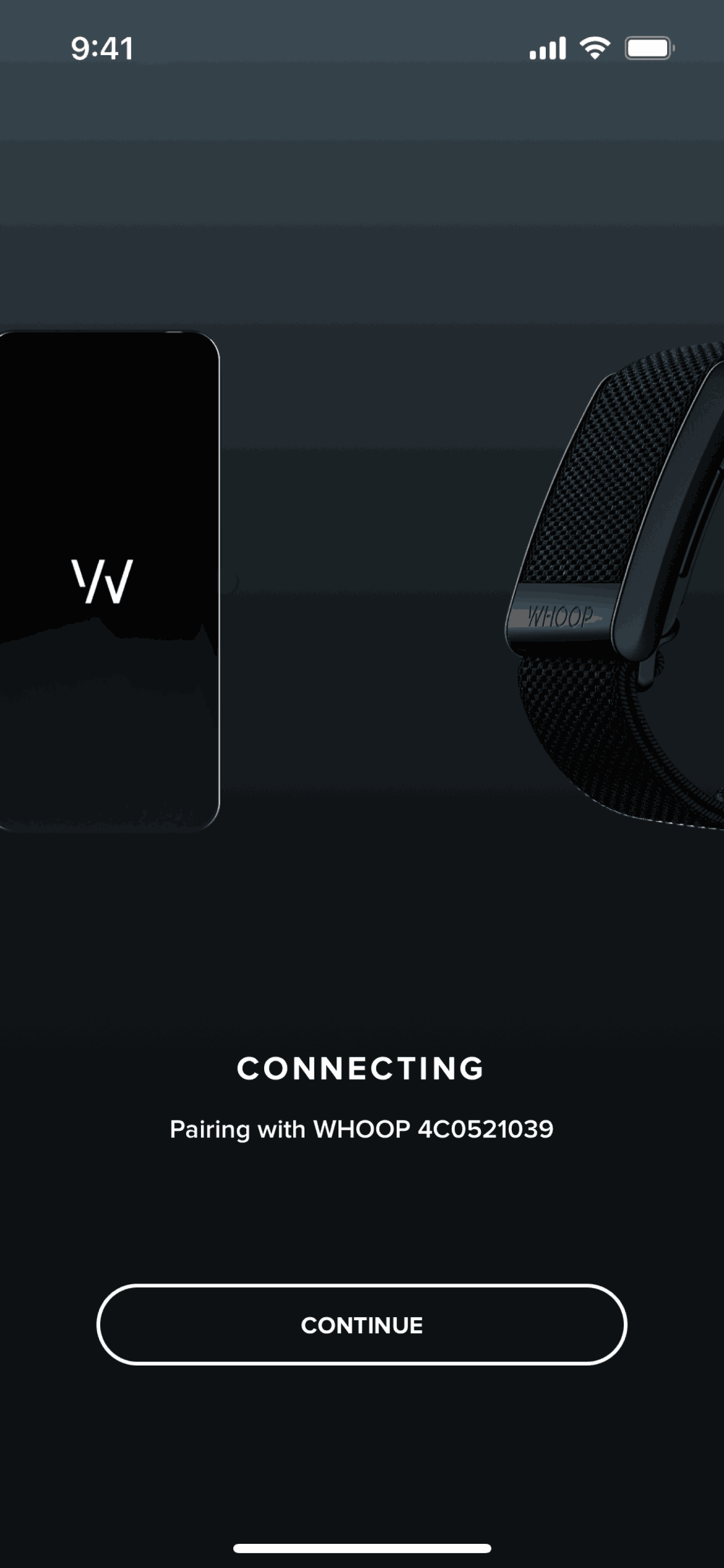 The user logs in and then pairs their Whoop device with the app. The app guides the user through the setup process.