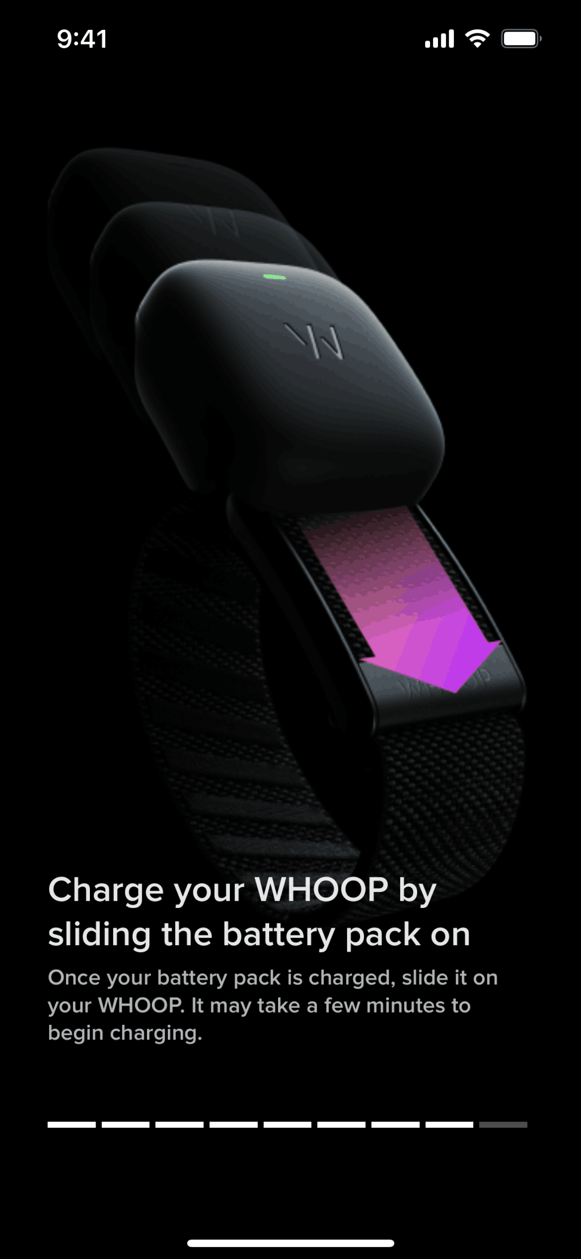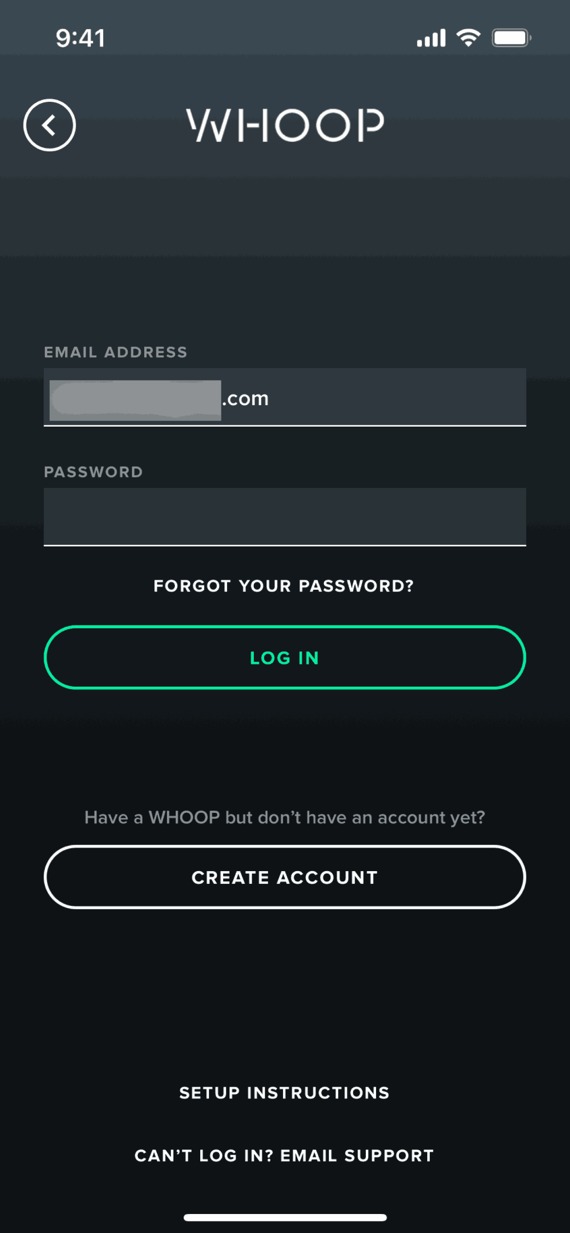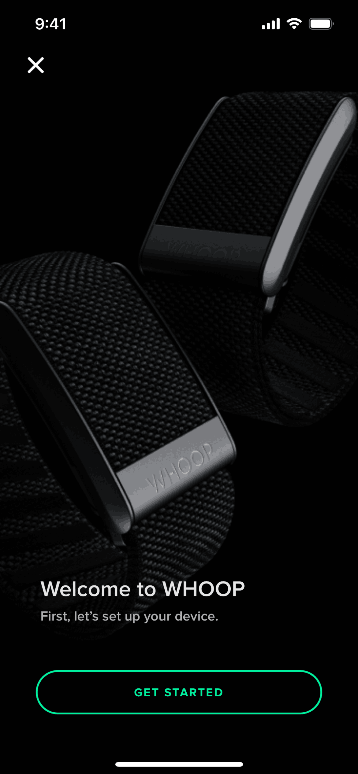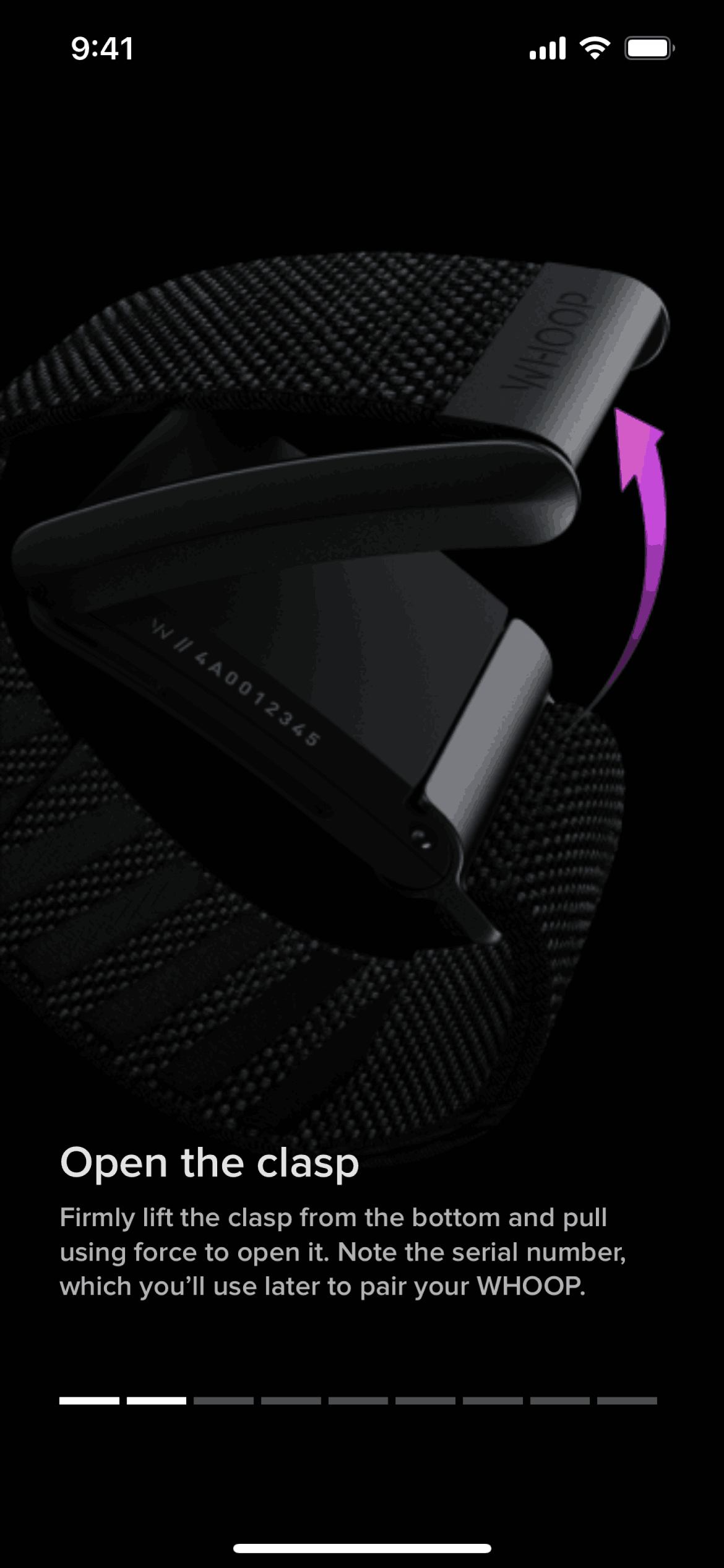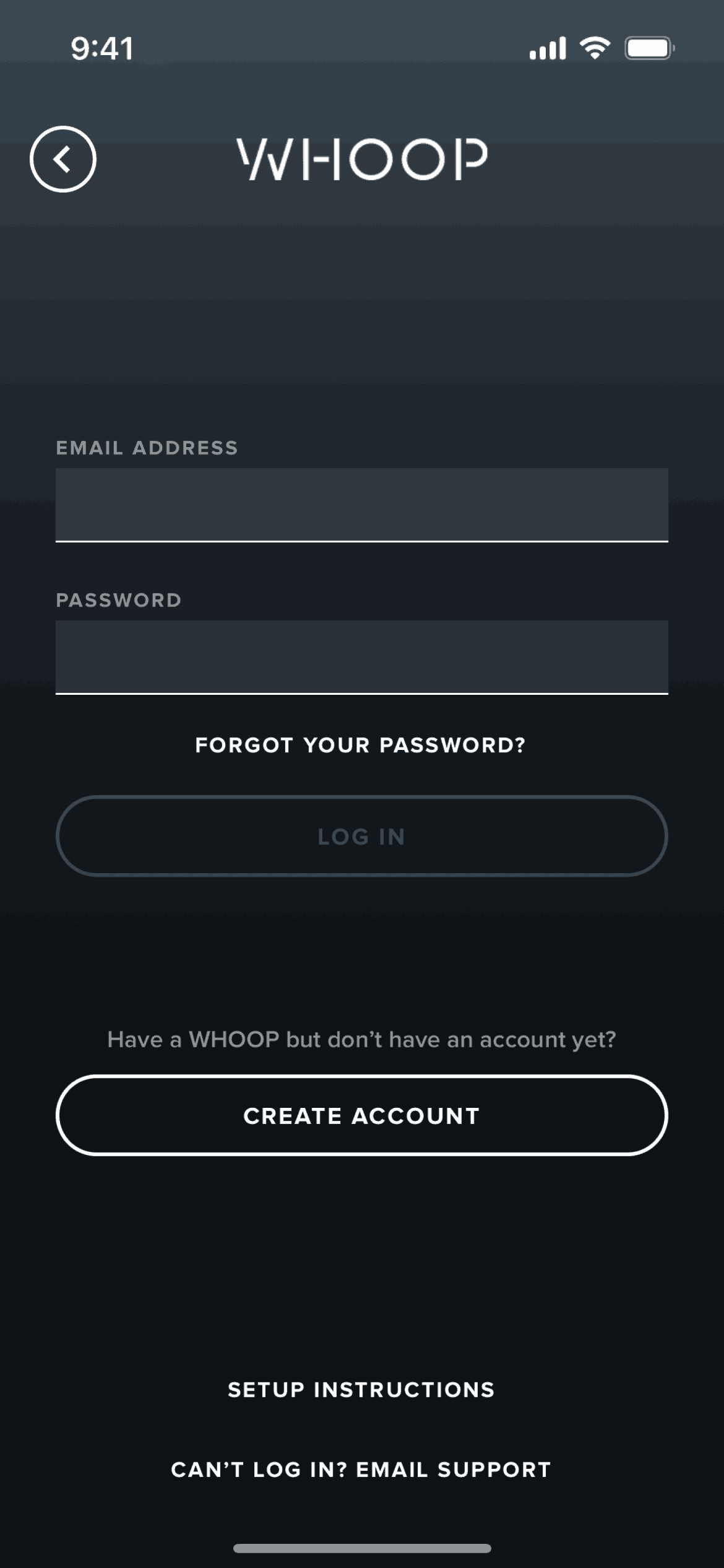 The user logs in and then pairs their Whoop device with the app. The app guides the user through the setup process.
