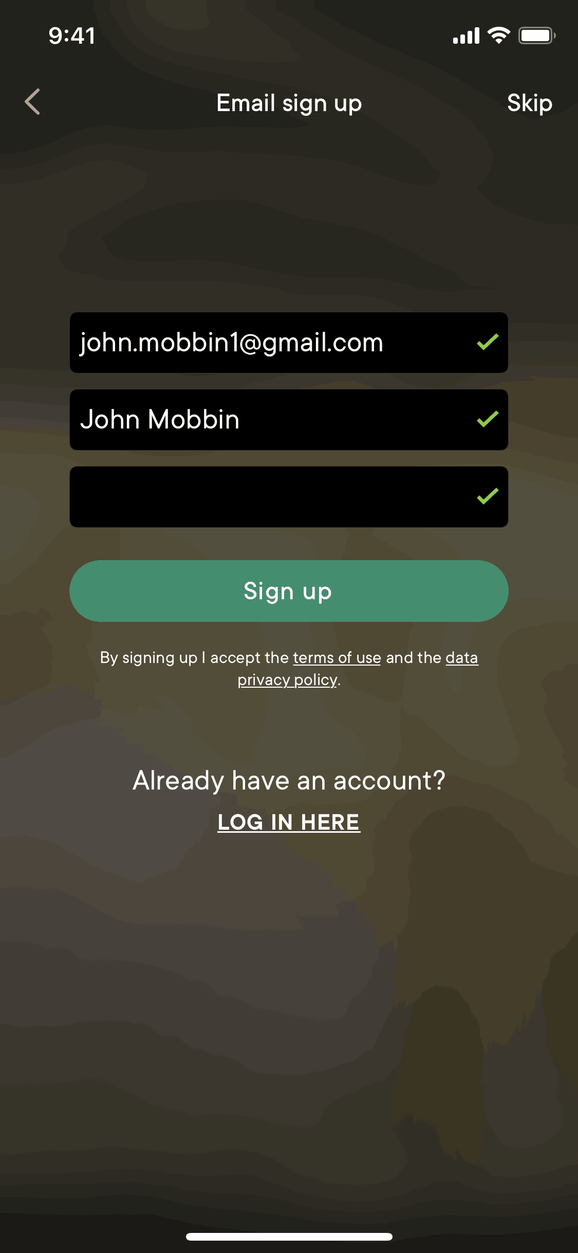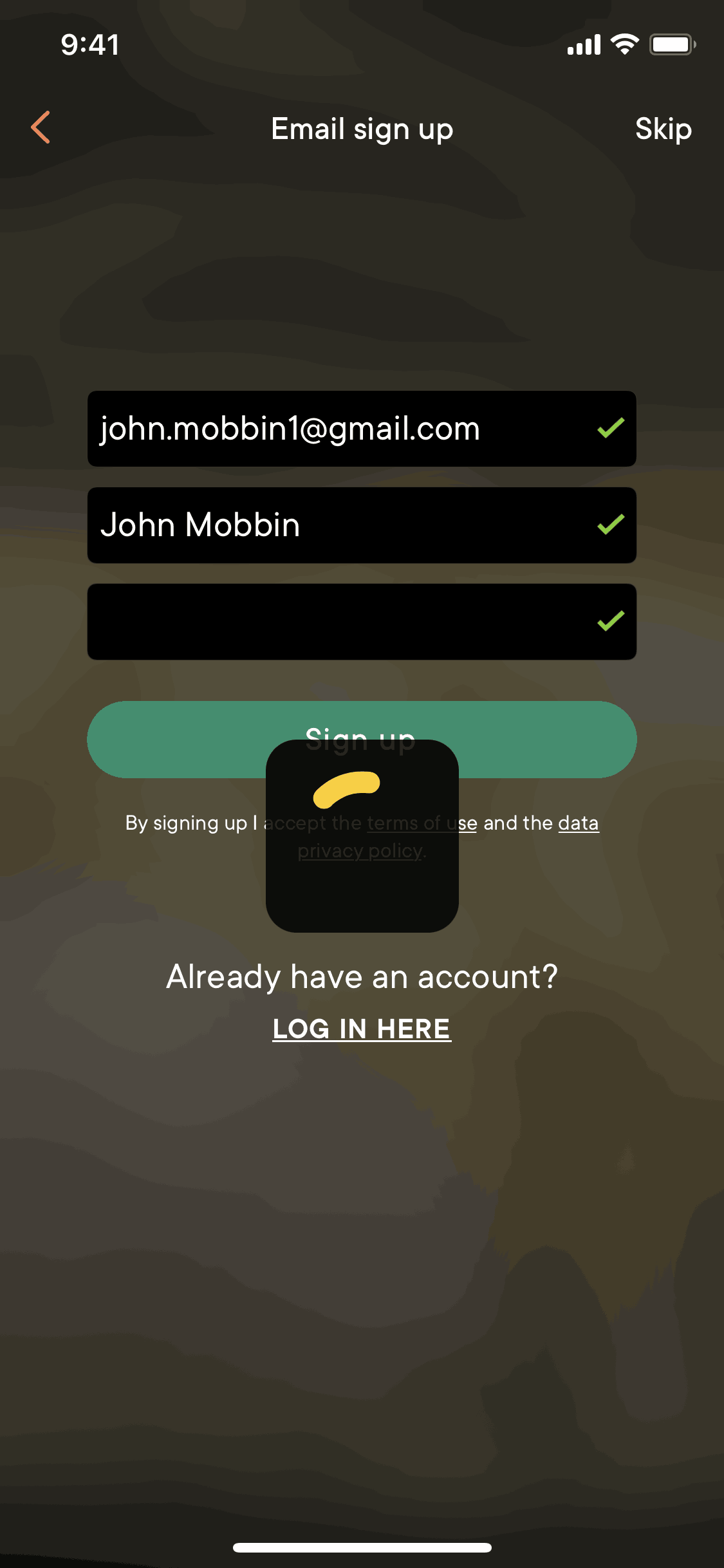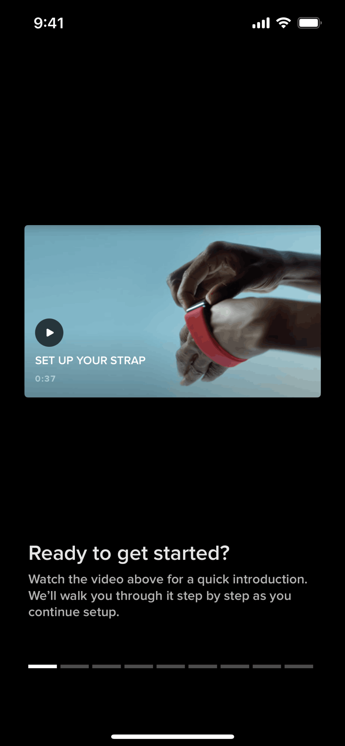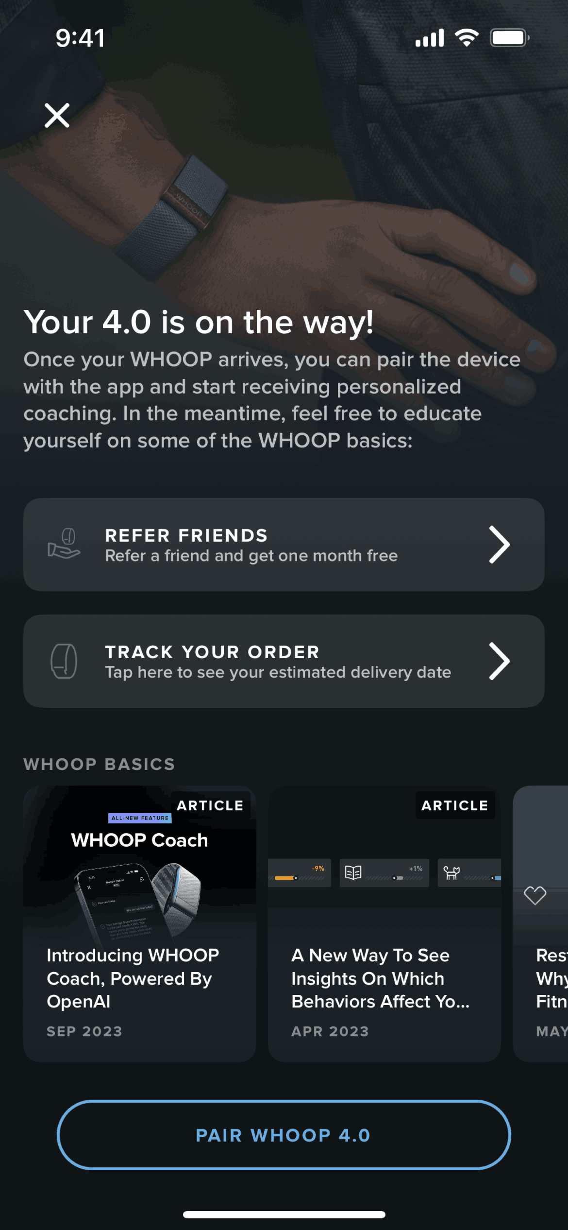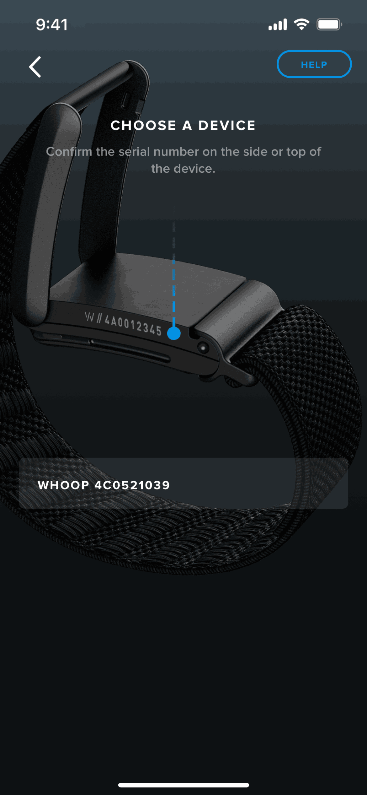 The user logs in and then pairs their Whoop device with the app. The app guides the user through the setup process.