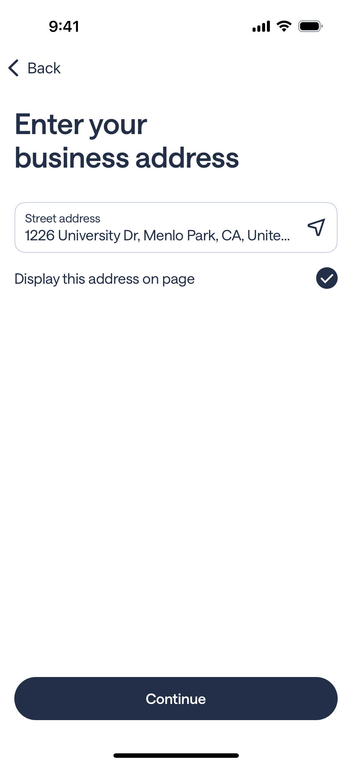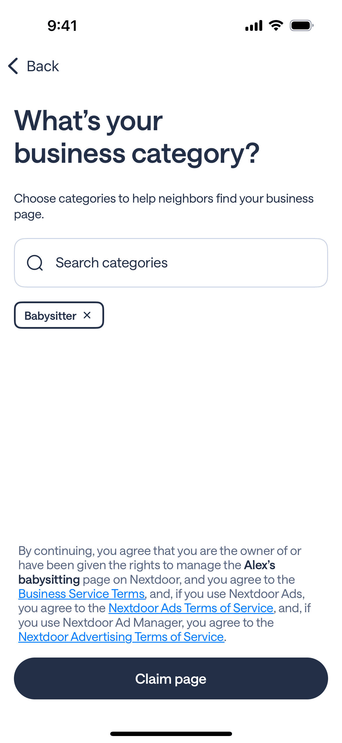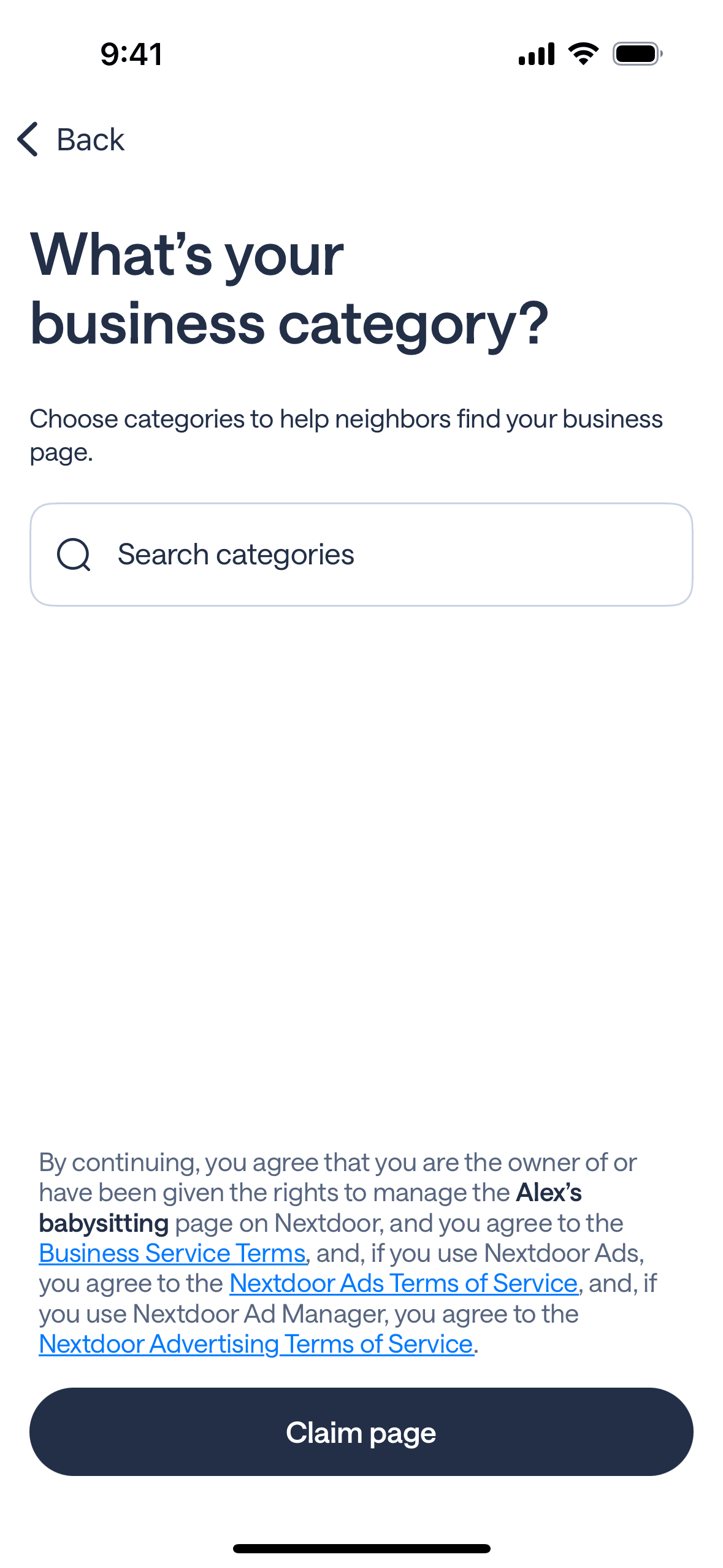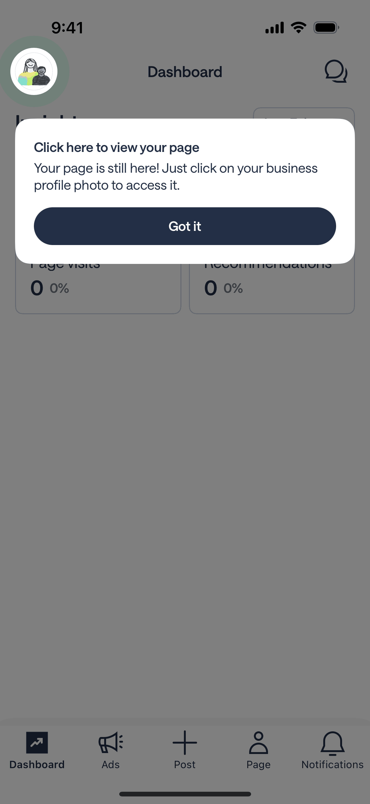 The user flow demonstrates setting up a business page by entering business details and selecting a category. It concludes with viewing the business page dashboard.