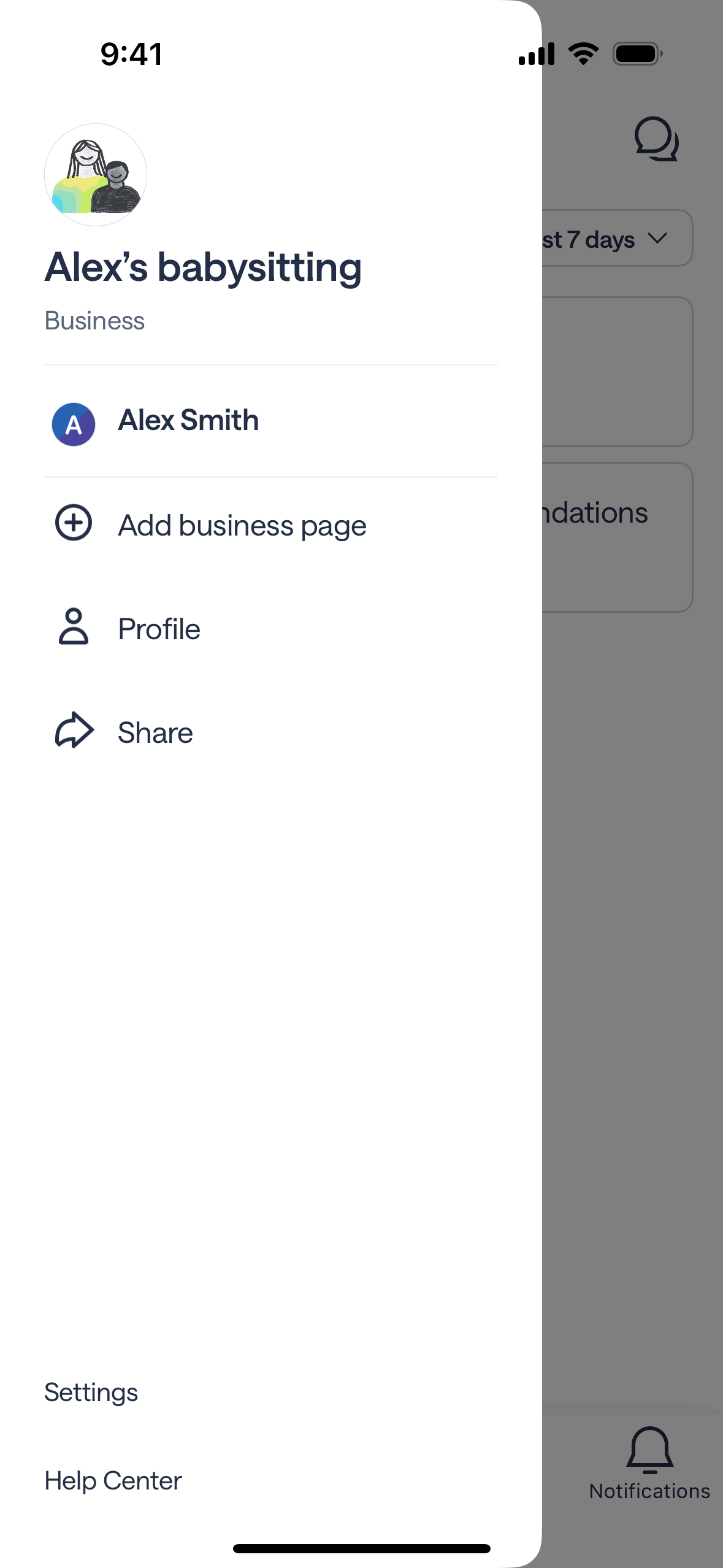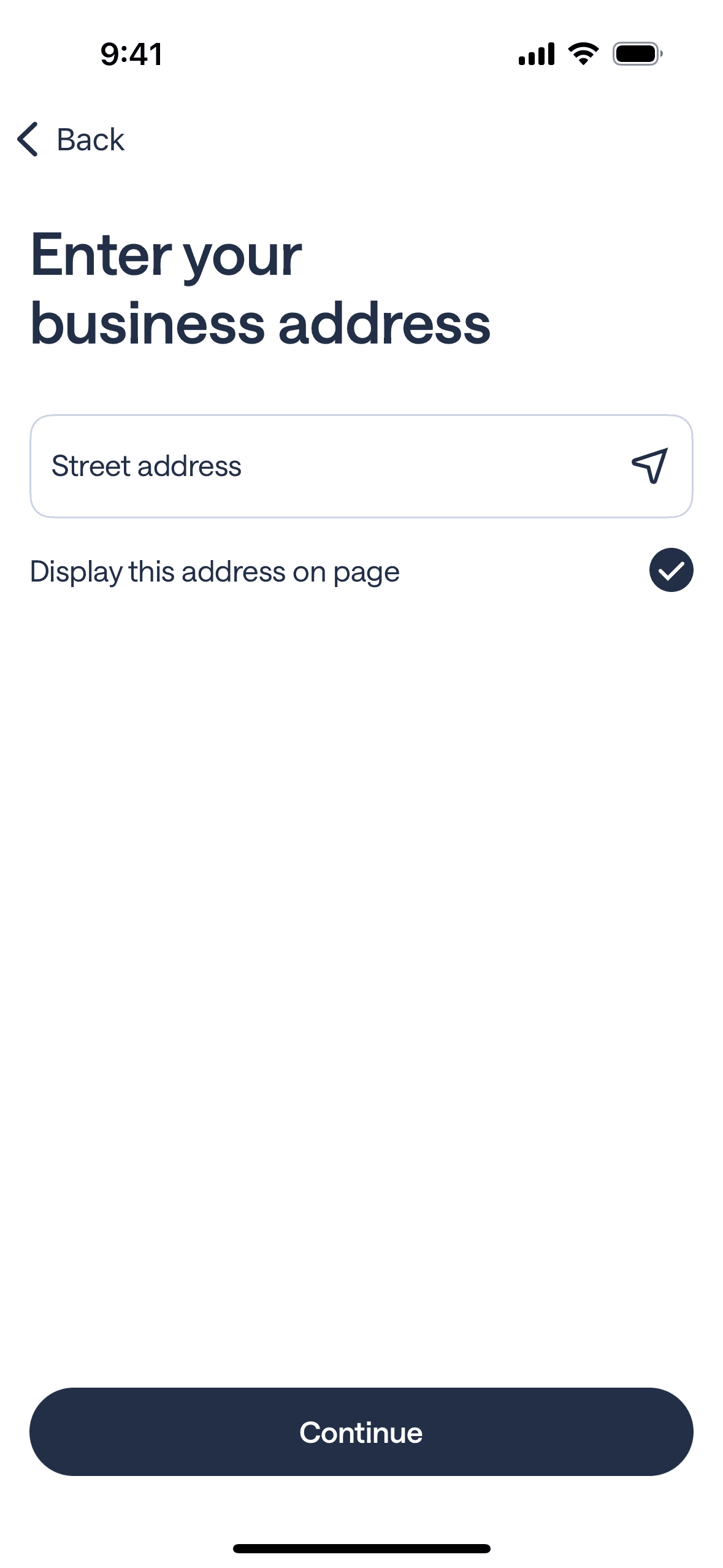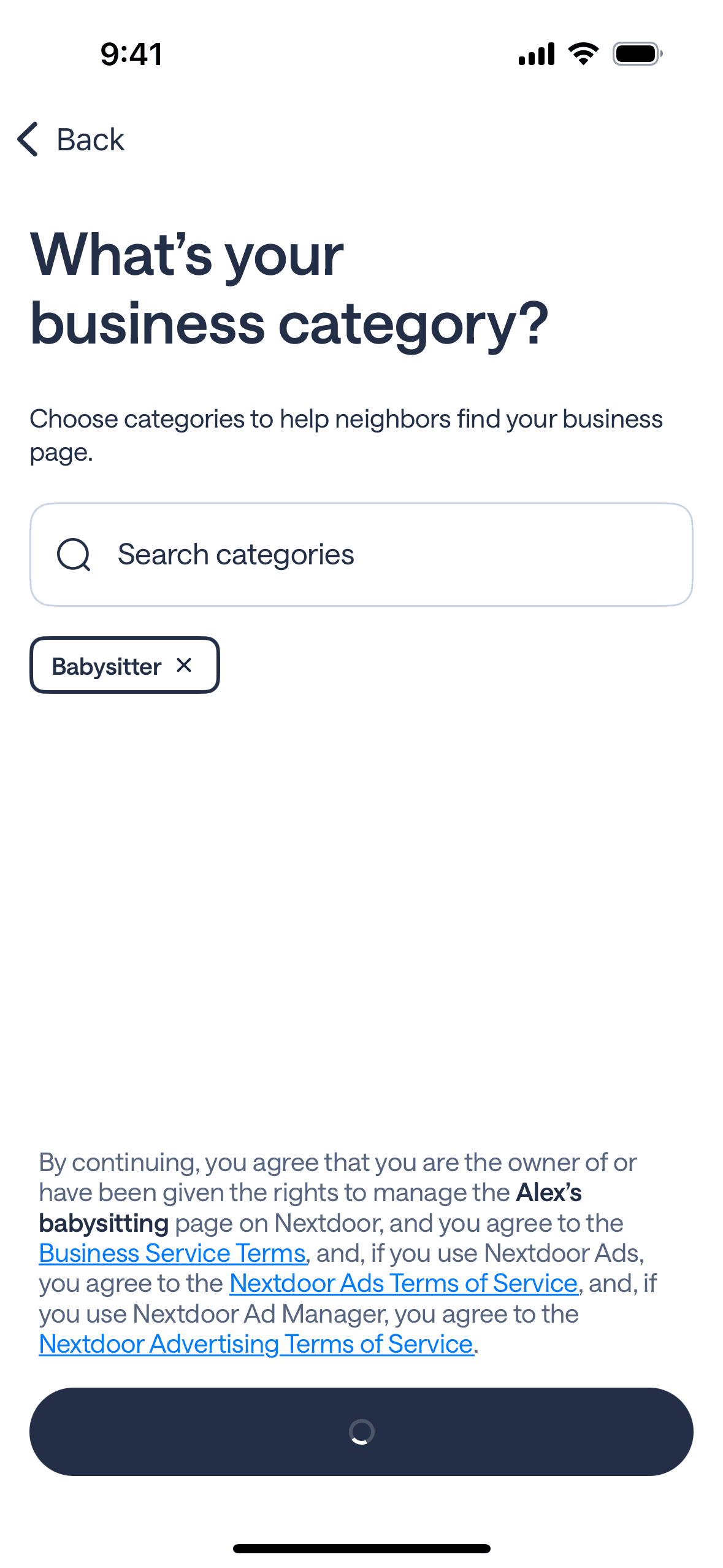The user flow demonstrates setting up a business page by entering business details and selecting a category. It concludes with viewing the business page dashboard.