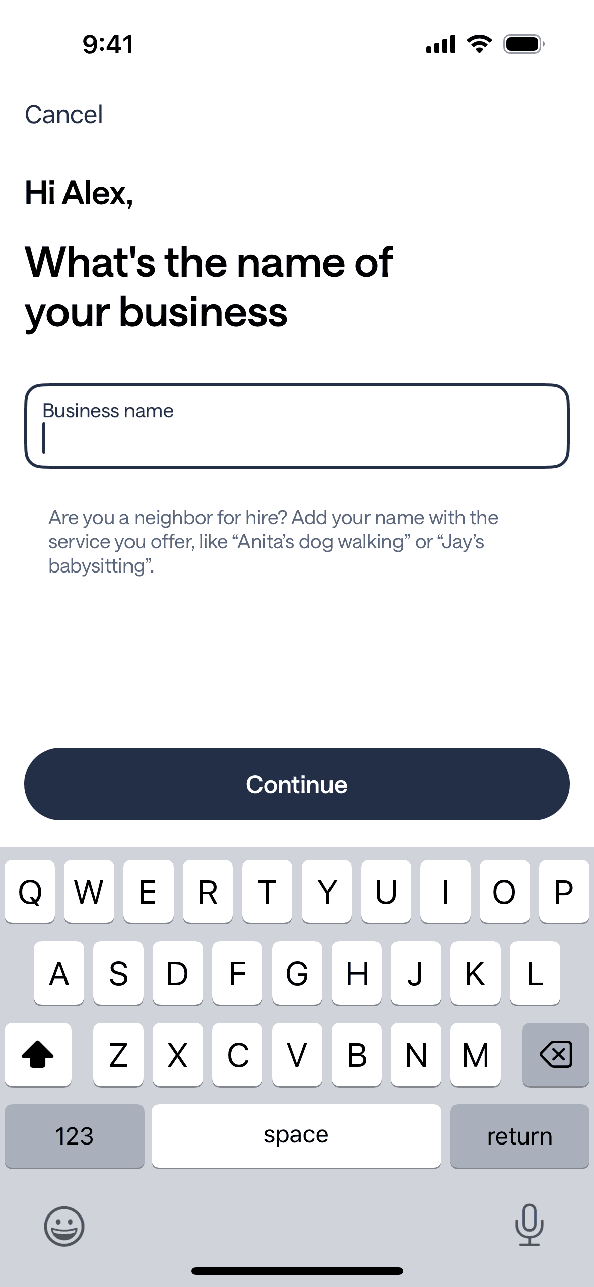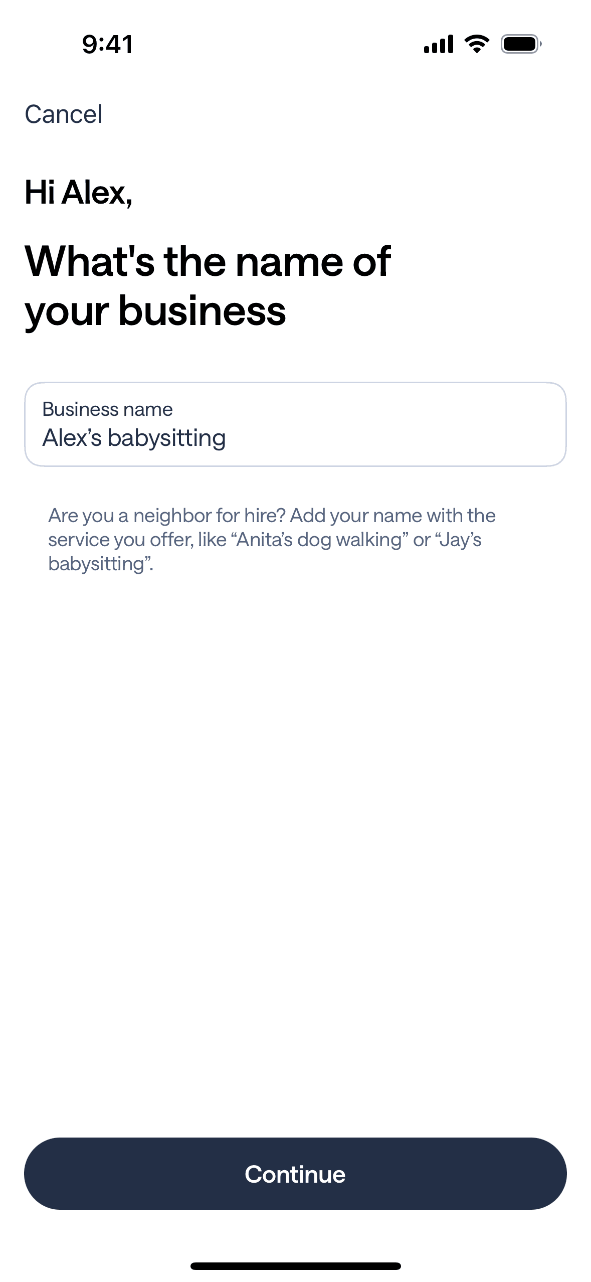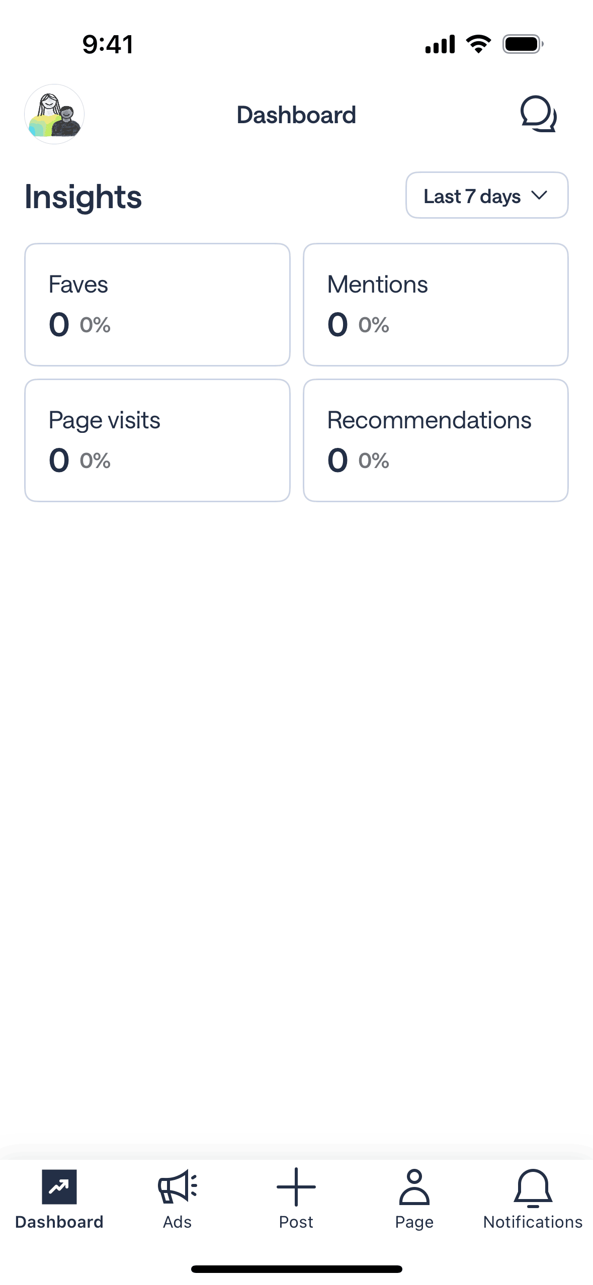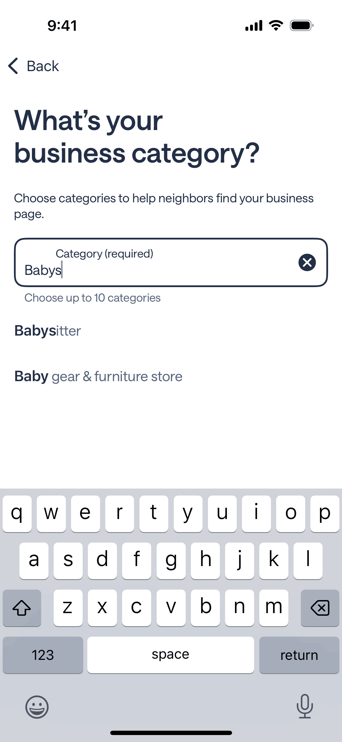 The user flow demonstrates setting up a business page by entering business details and selecting a category. It concludes with viewing the business page dashboard.