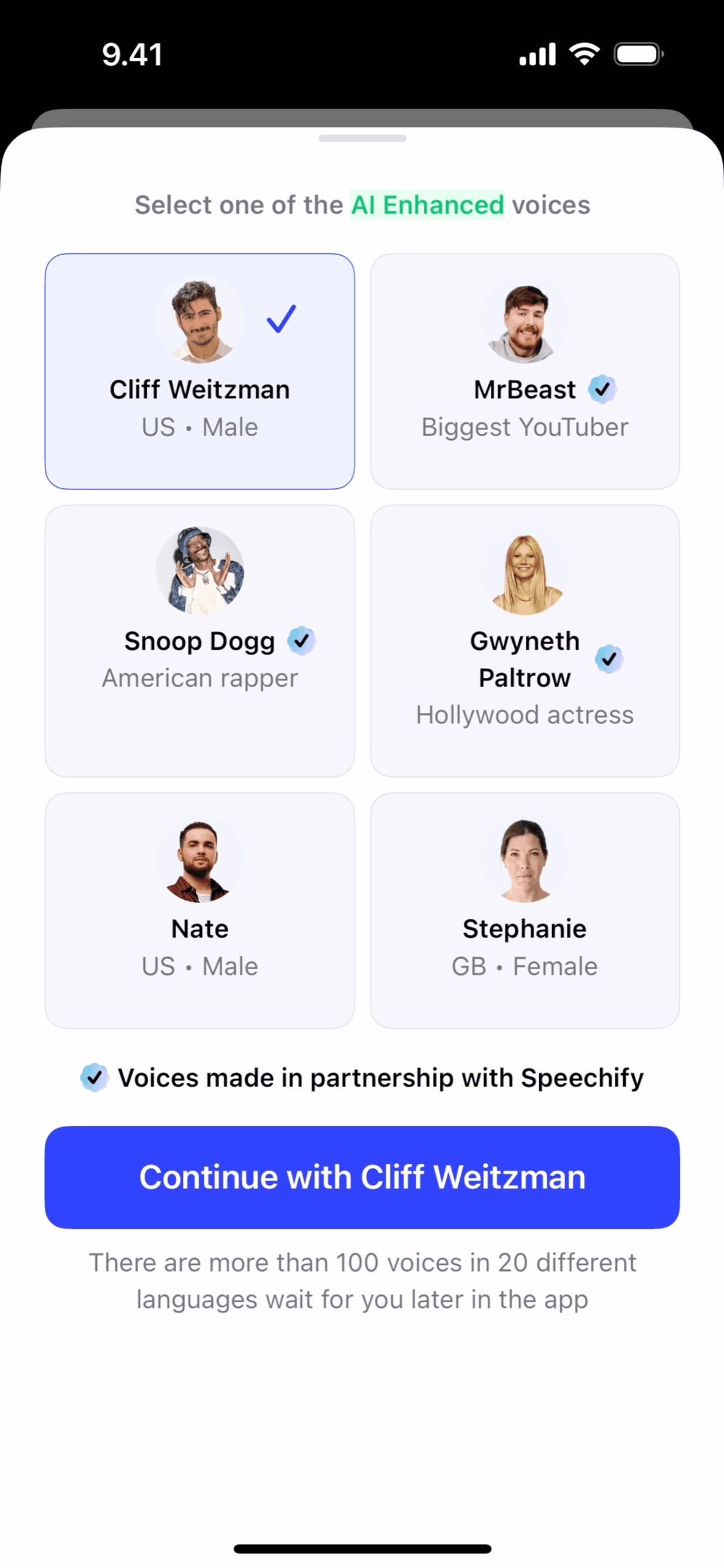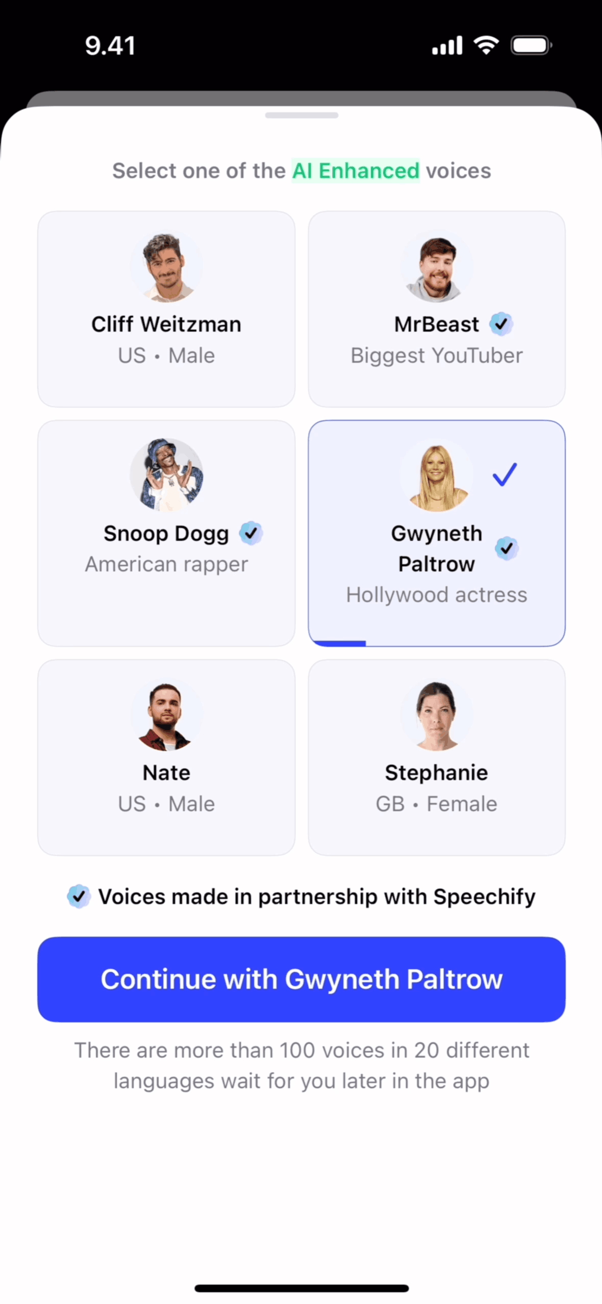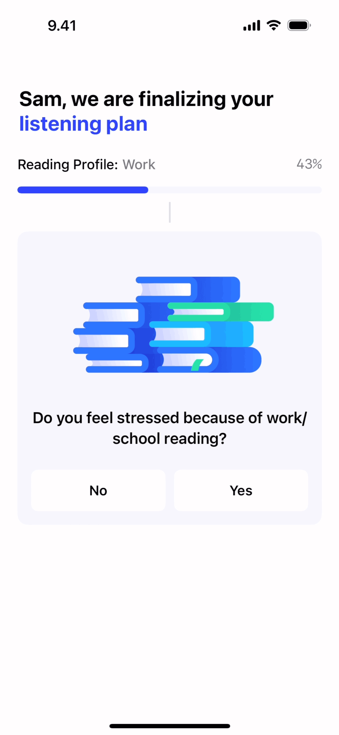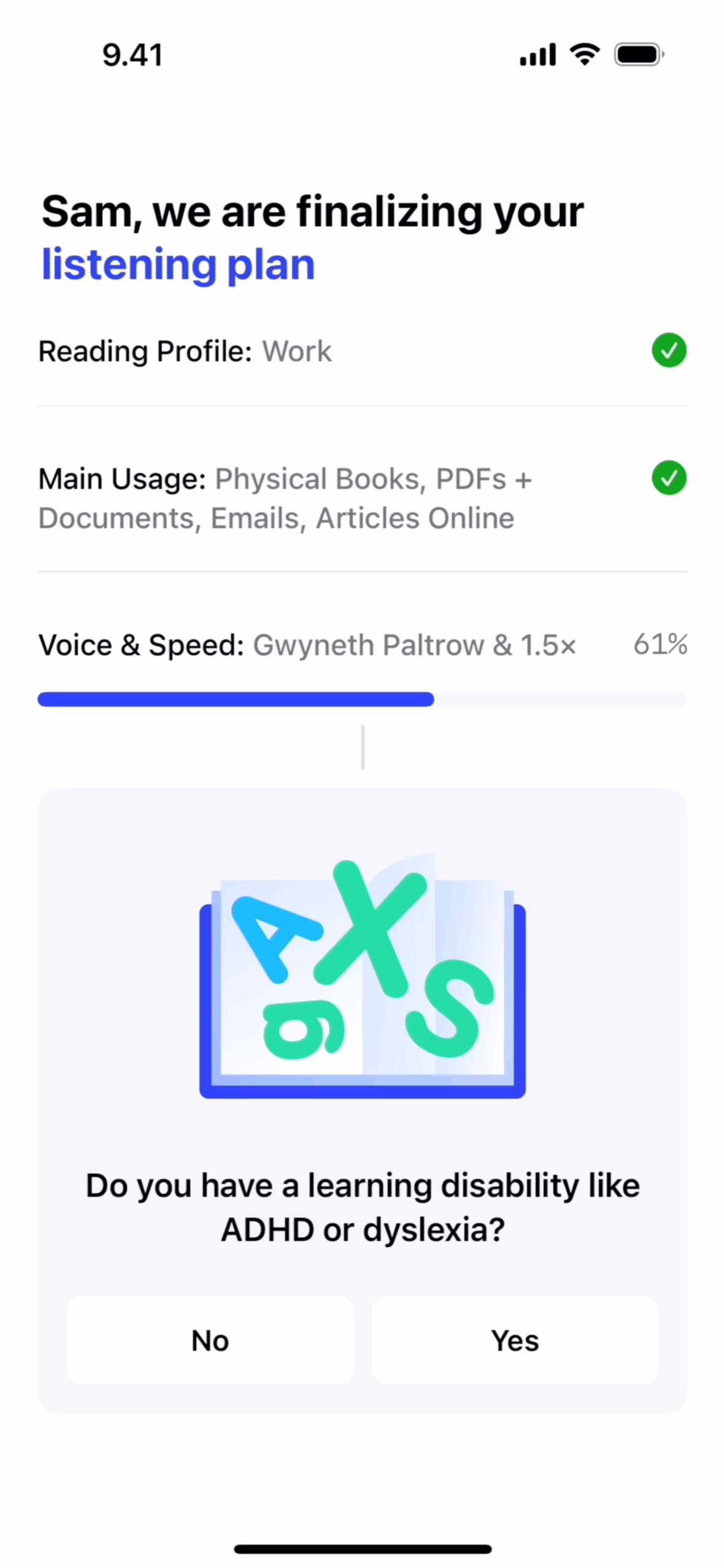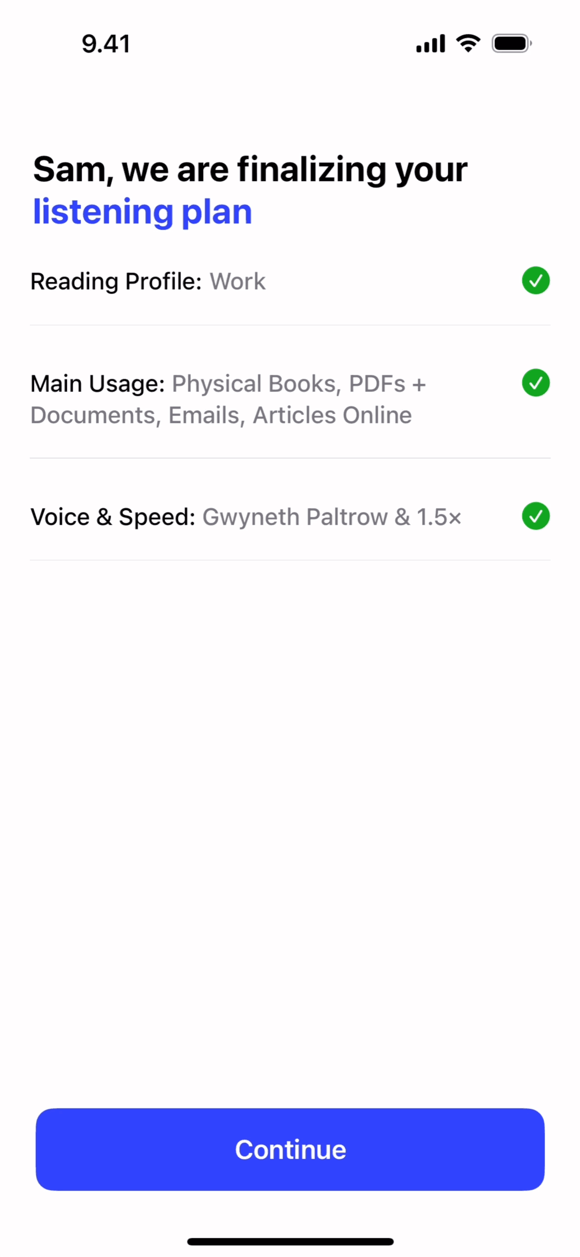 The user customizes their listening experience by selecting a voice and speed. The app then gathers information to finalize a personalized listening plan.