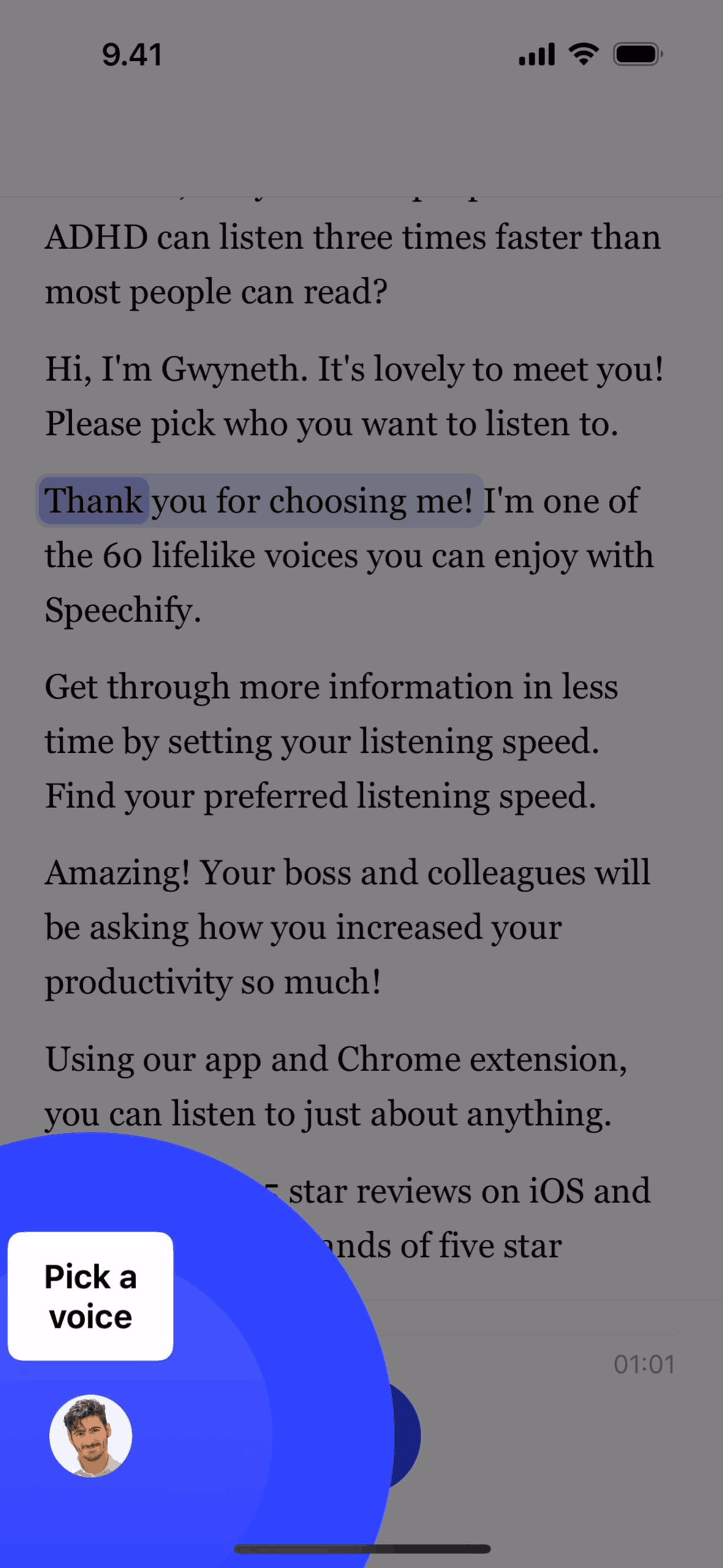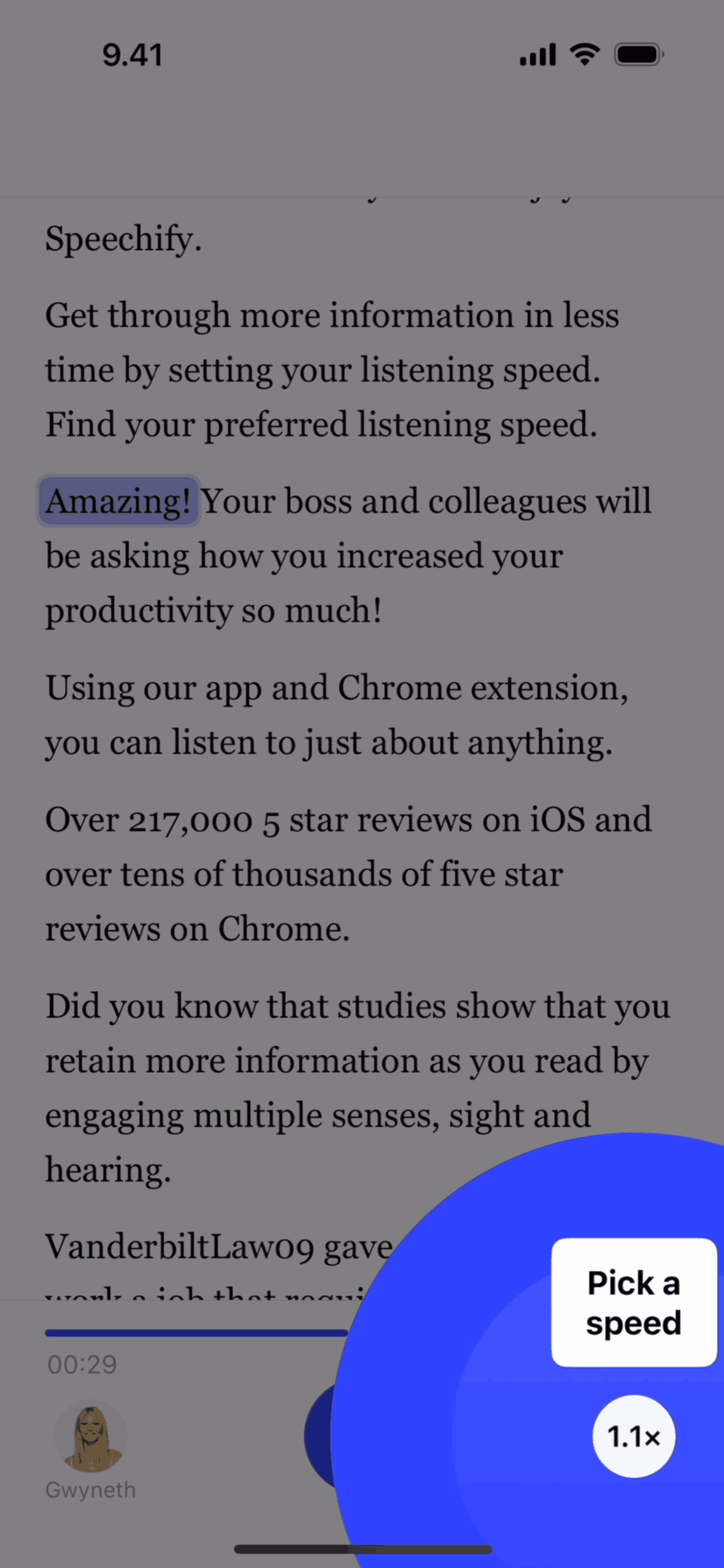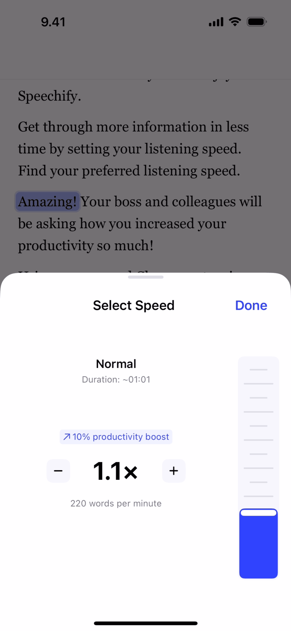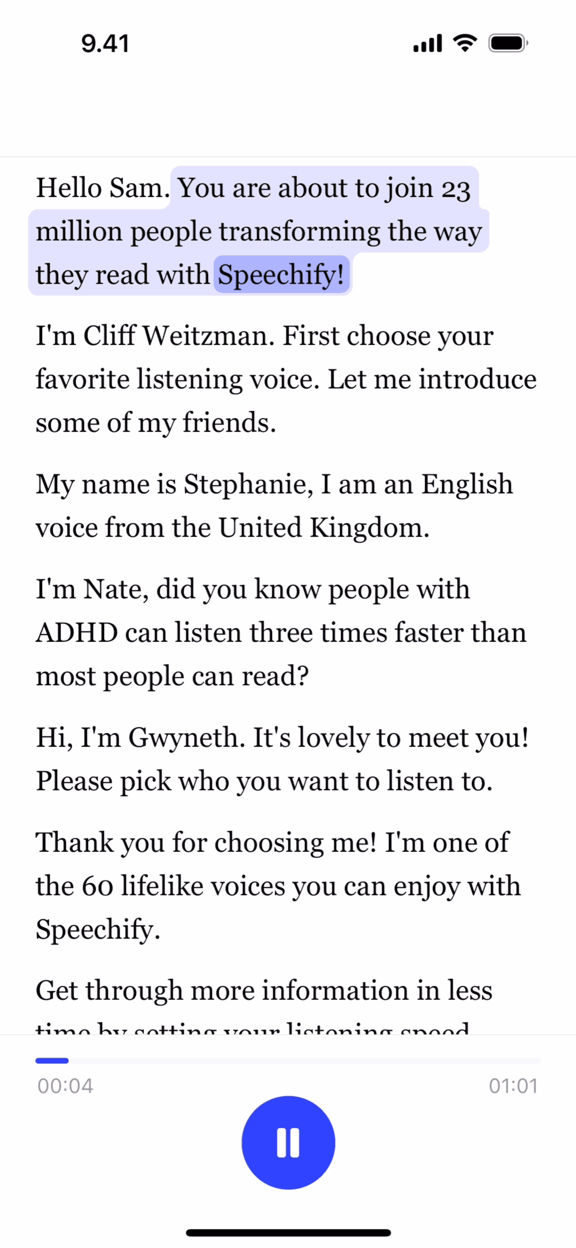 The user customizes their listening experience by selecting a voice and speed. The app then gathers information to finalize a personalized listening plan.