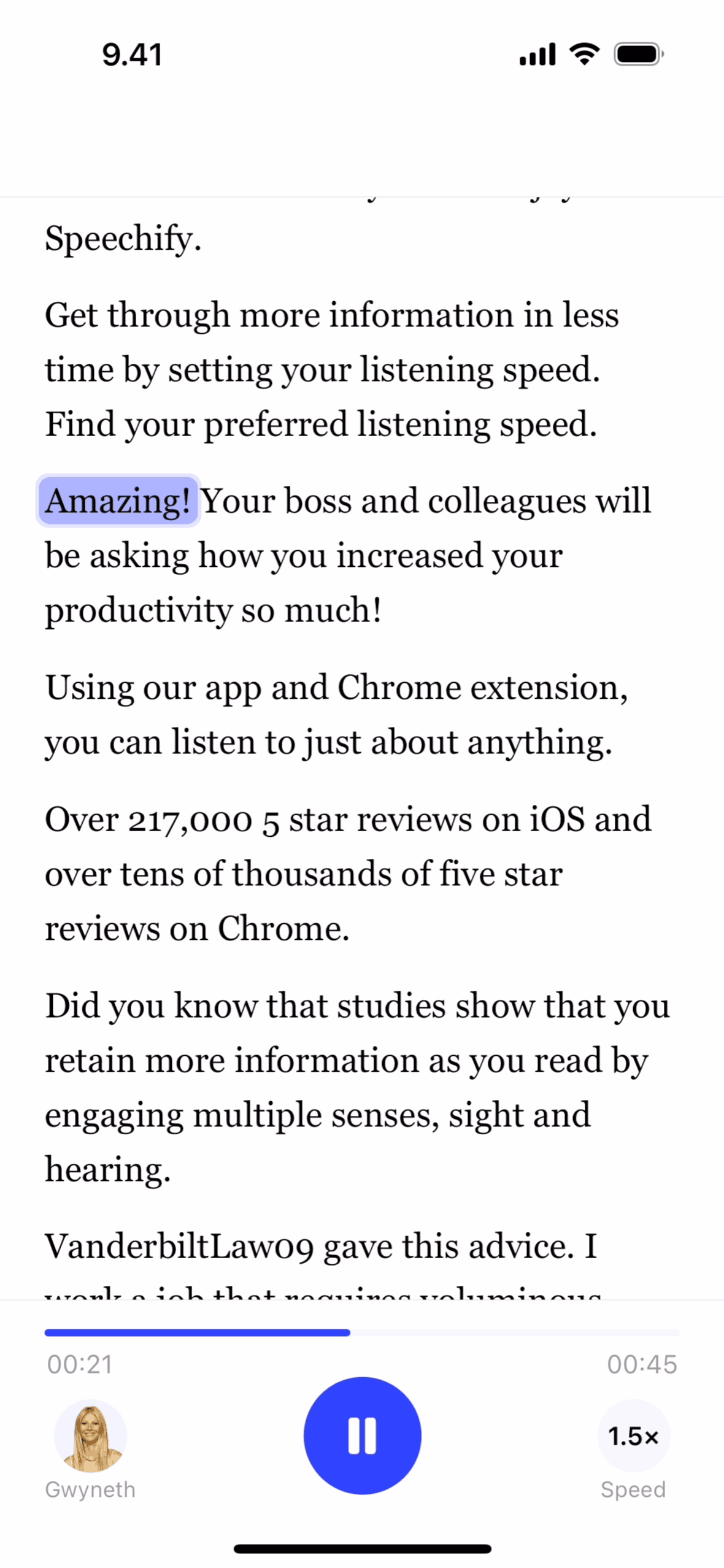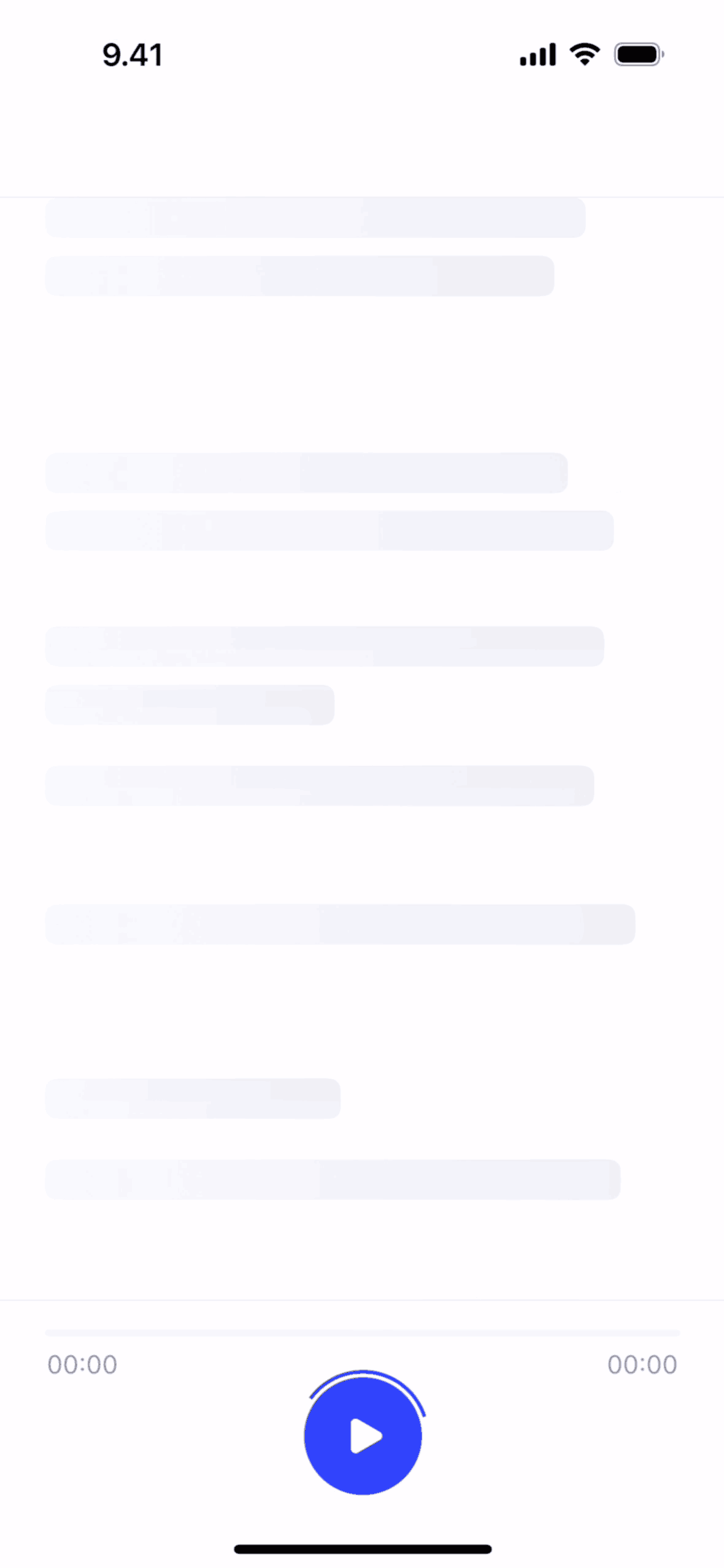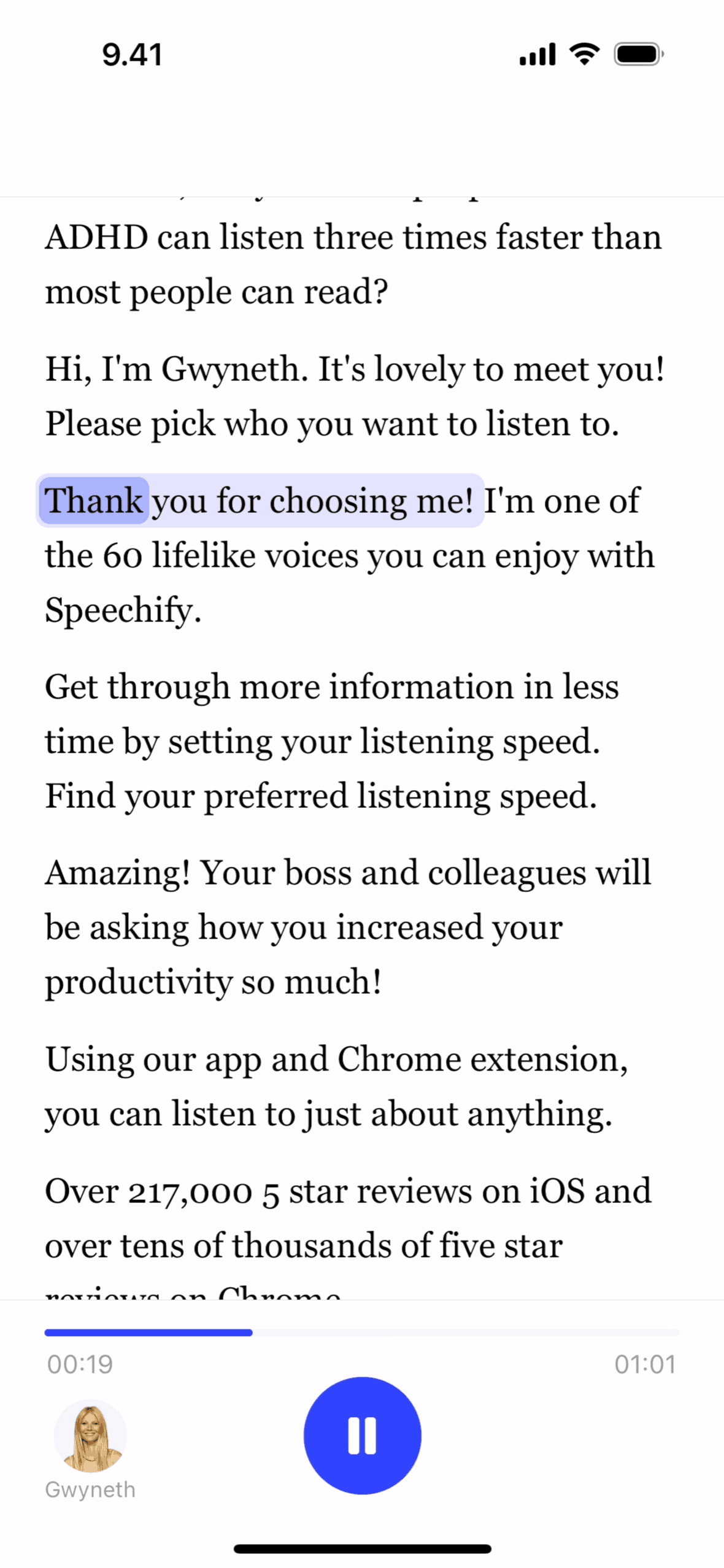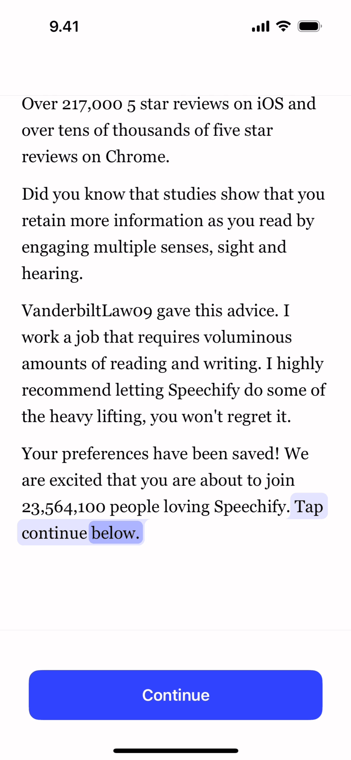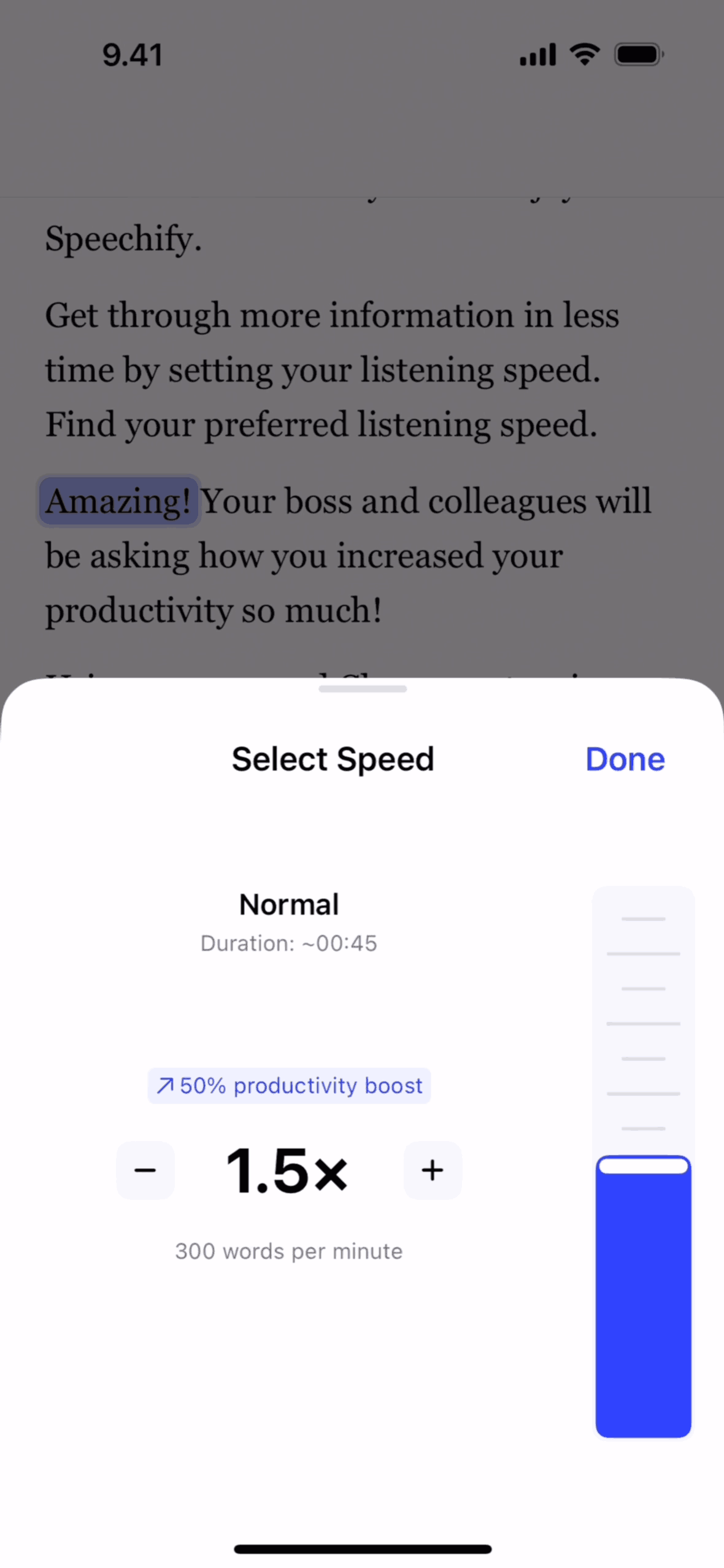 The user customizes their listening experience by selecting a voice and speed. The app then gathers information to finalize a personalized listening plan.