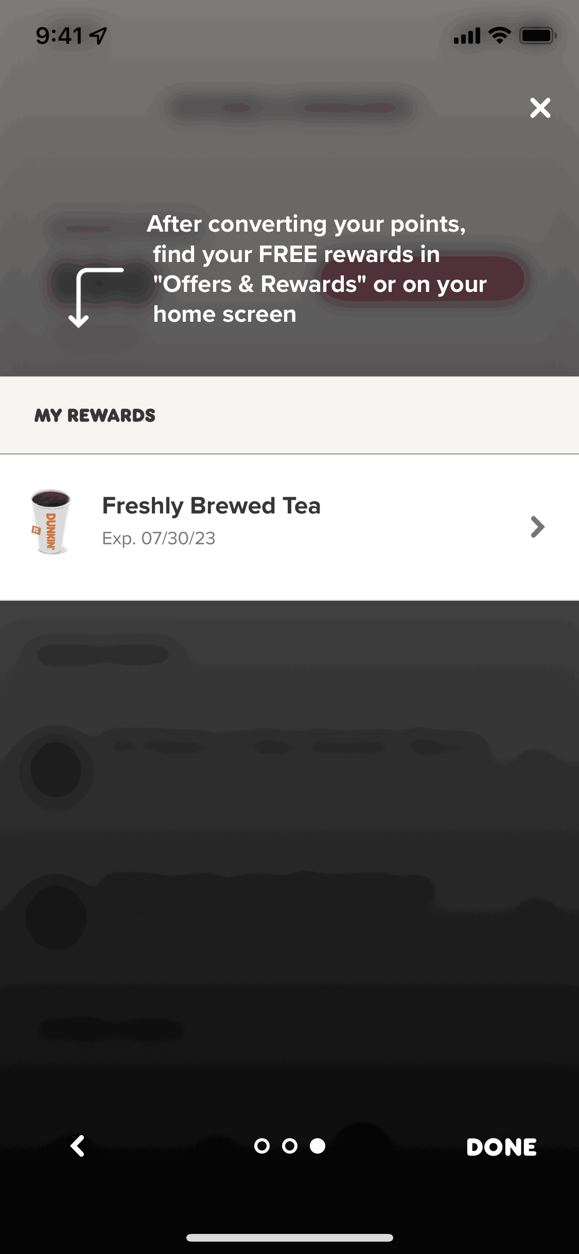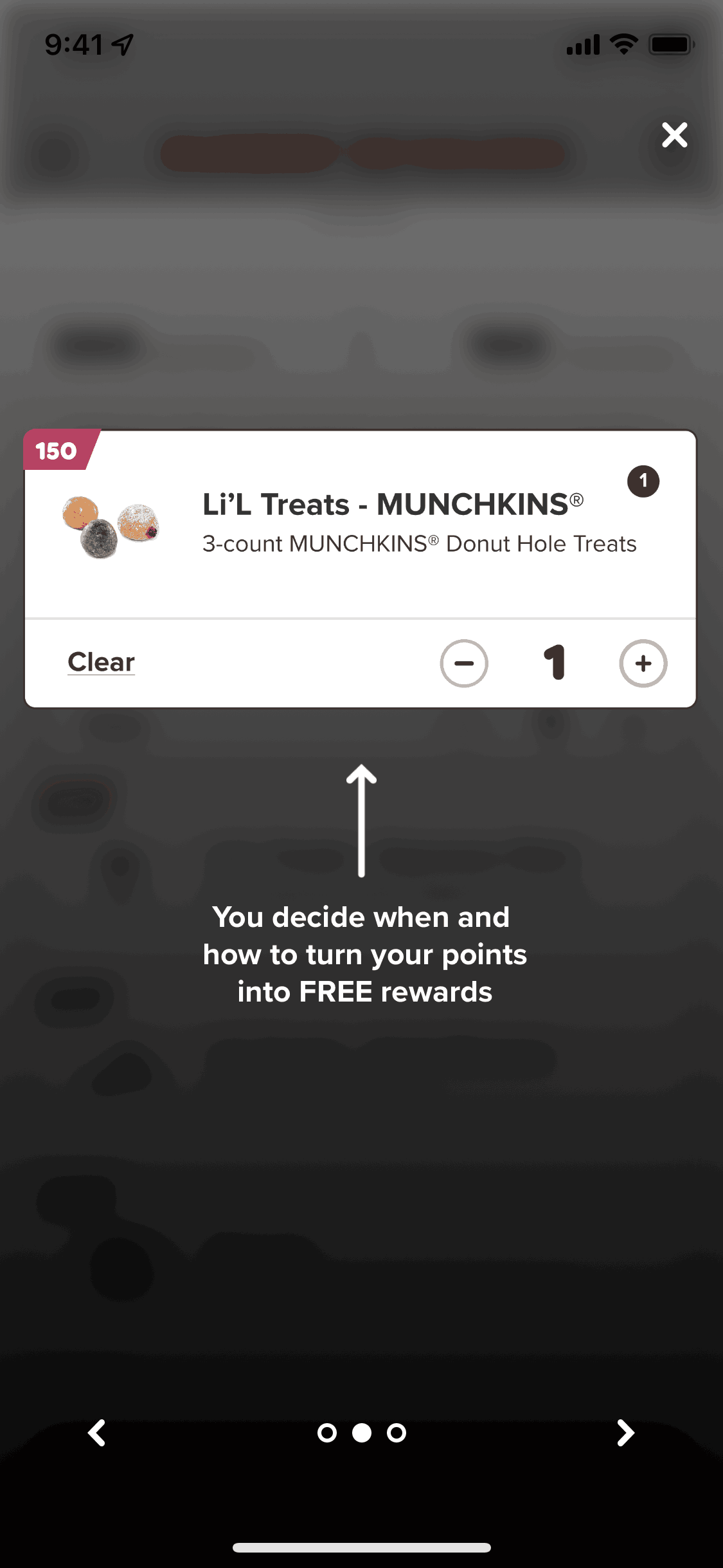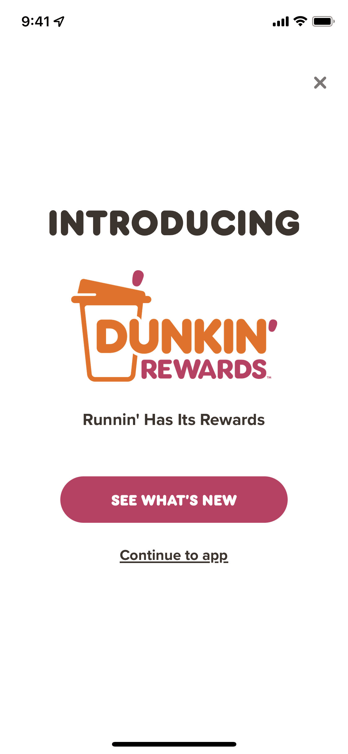 The user flow showcases a tour of the Dunkin' Rewards program. It guides the user from introduction to reward selection and viewing available rewards.
