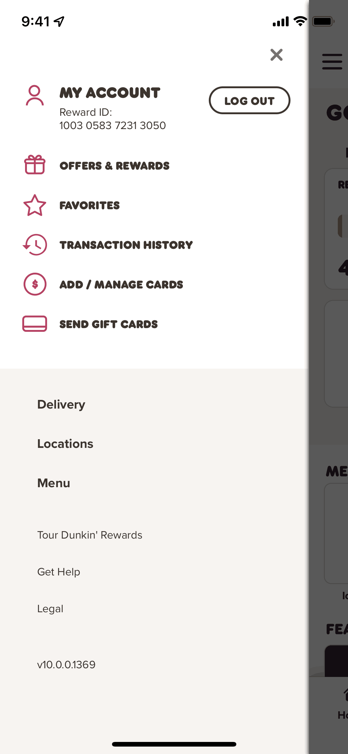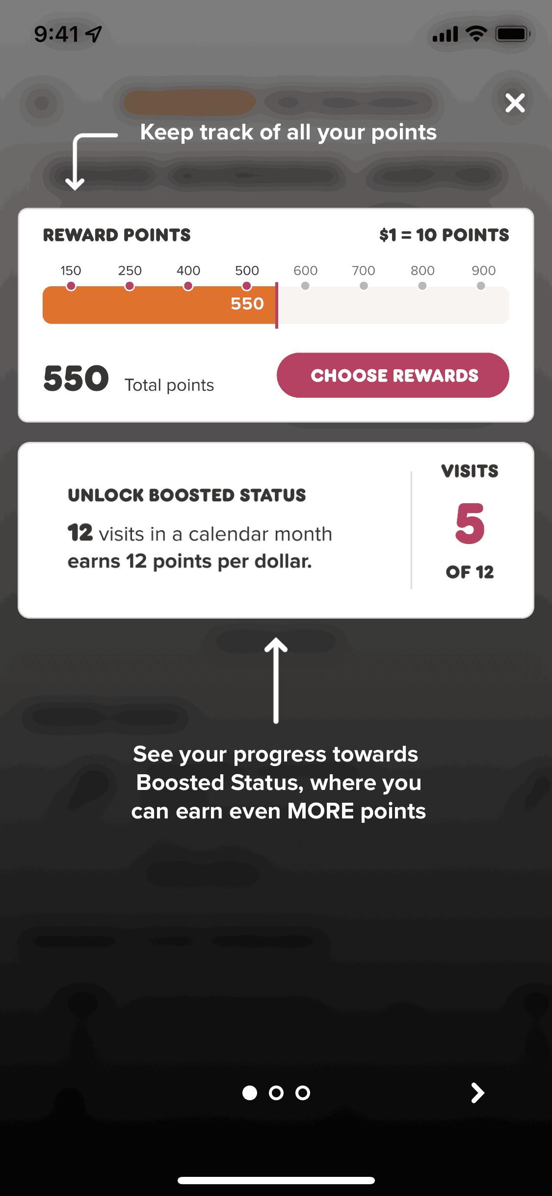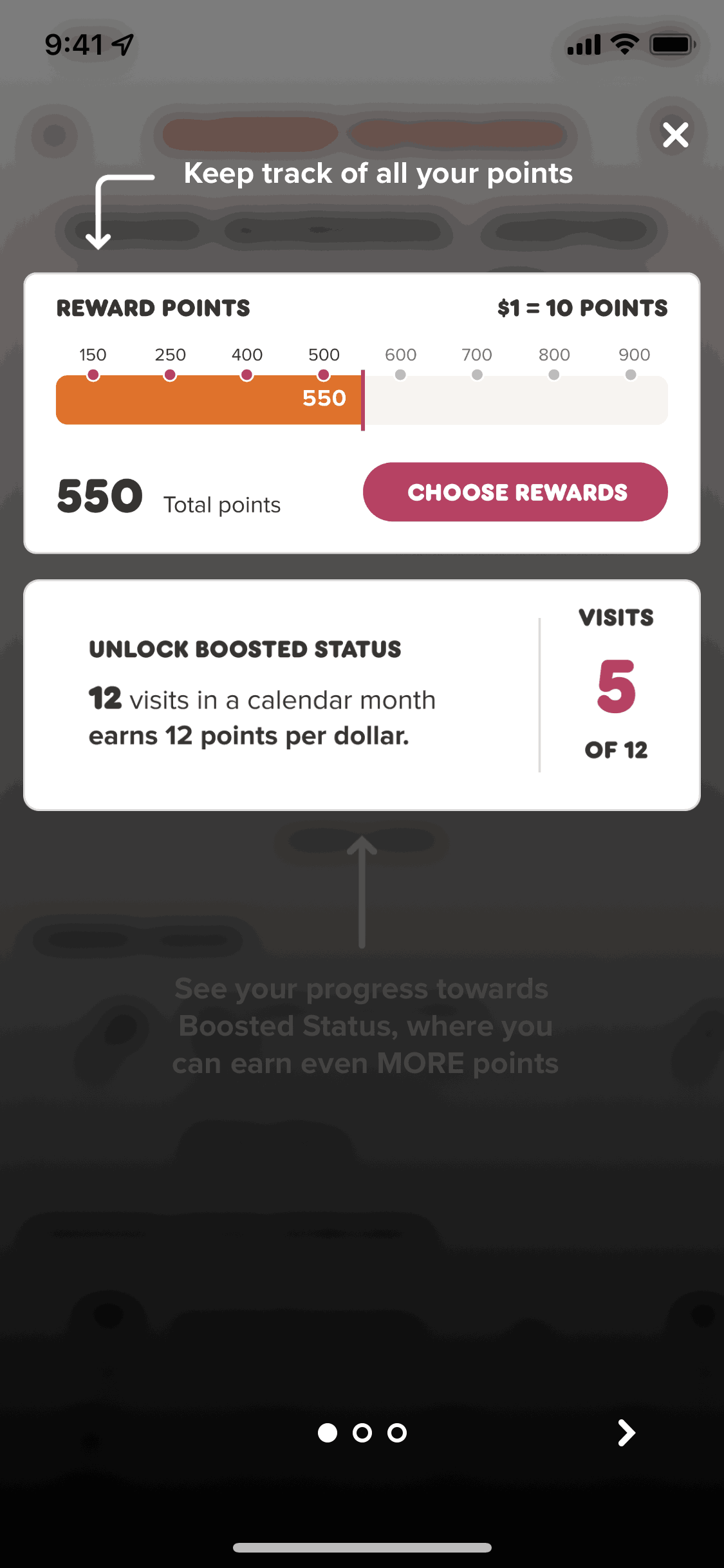 The user flow showcases a tour of the Dunkin' Rewards program. It guides the user from introduction to reward selection and viewing available rewards.