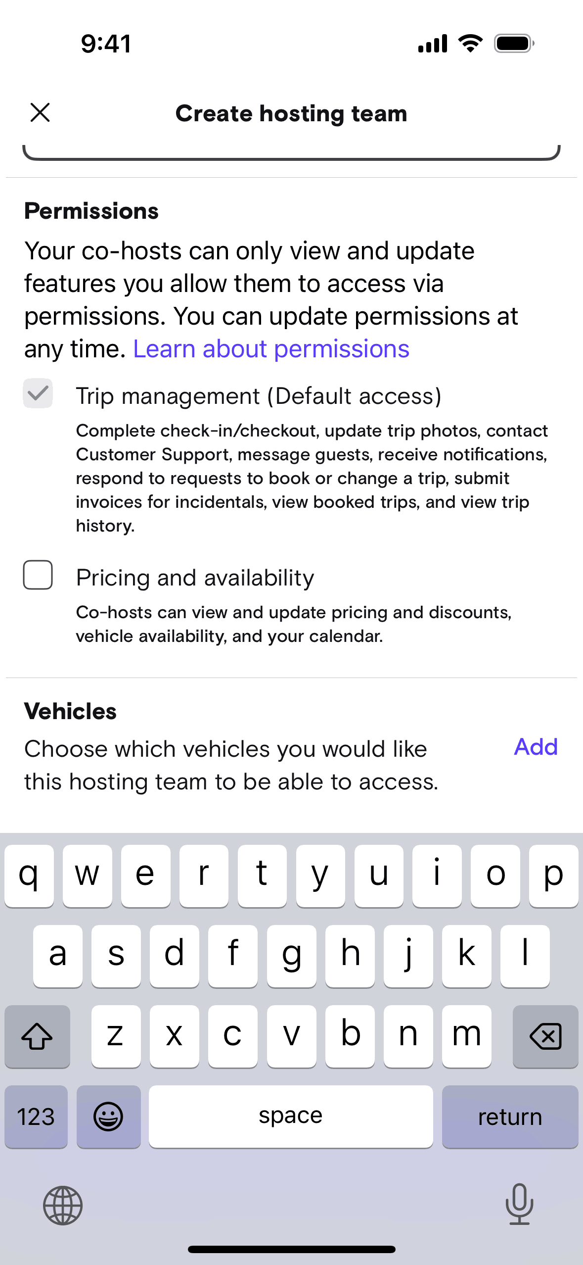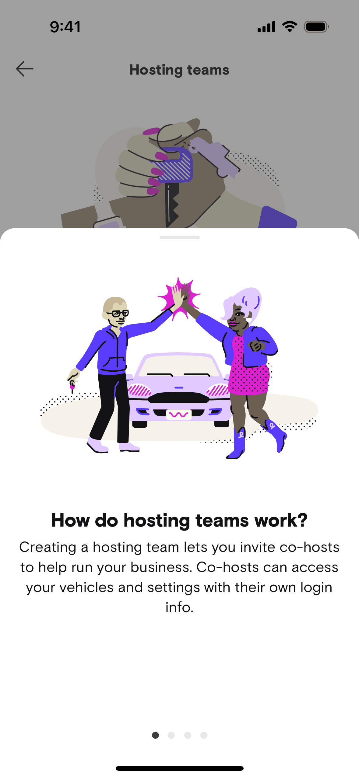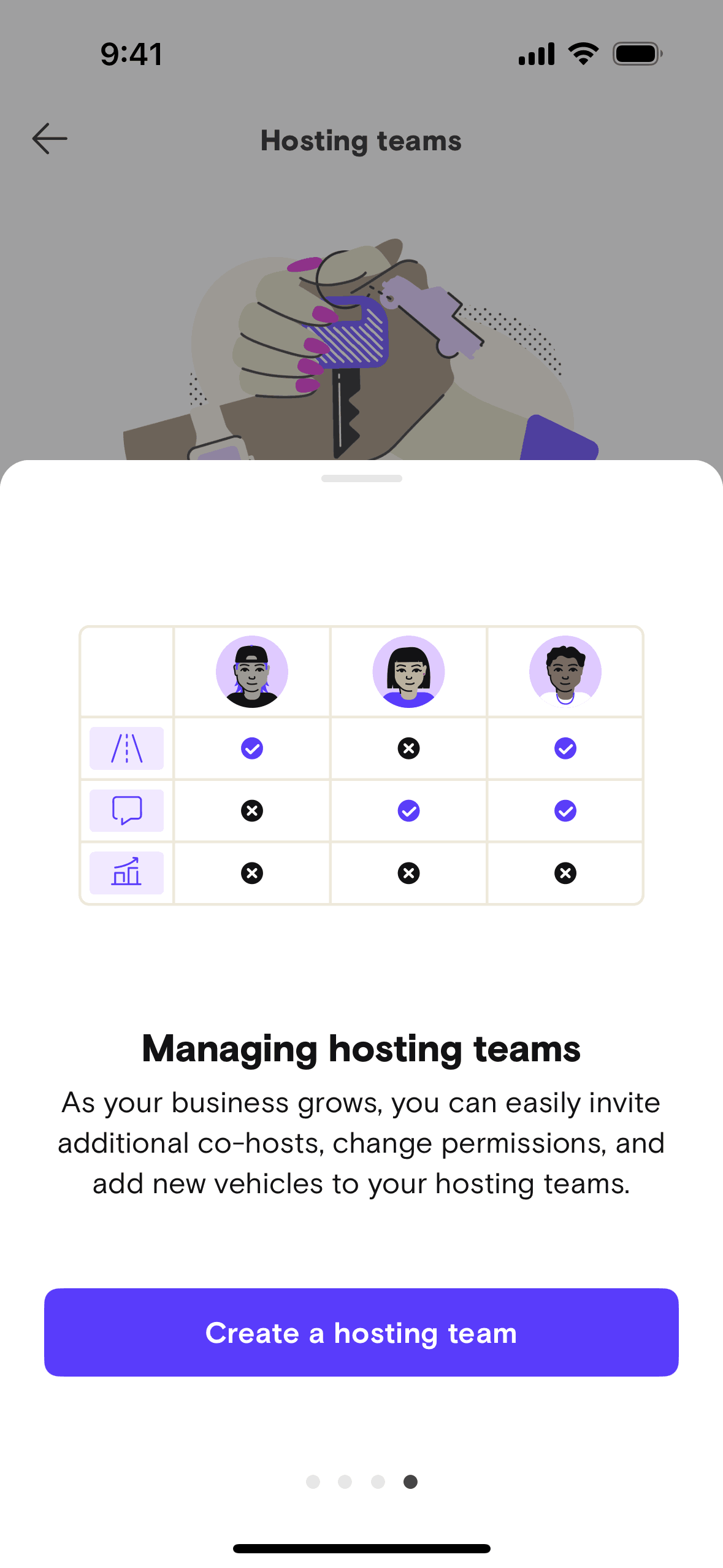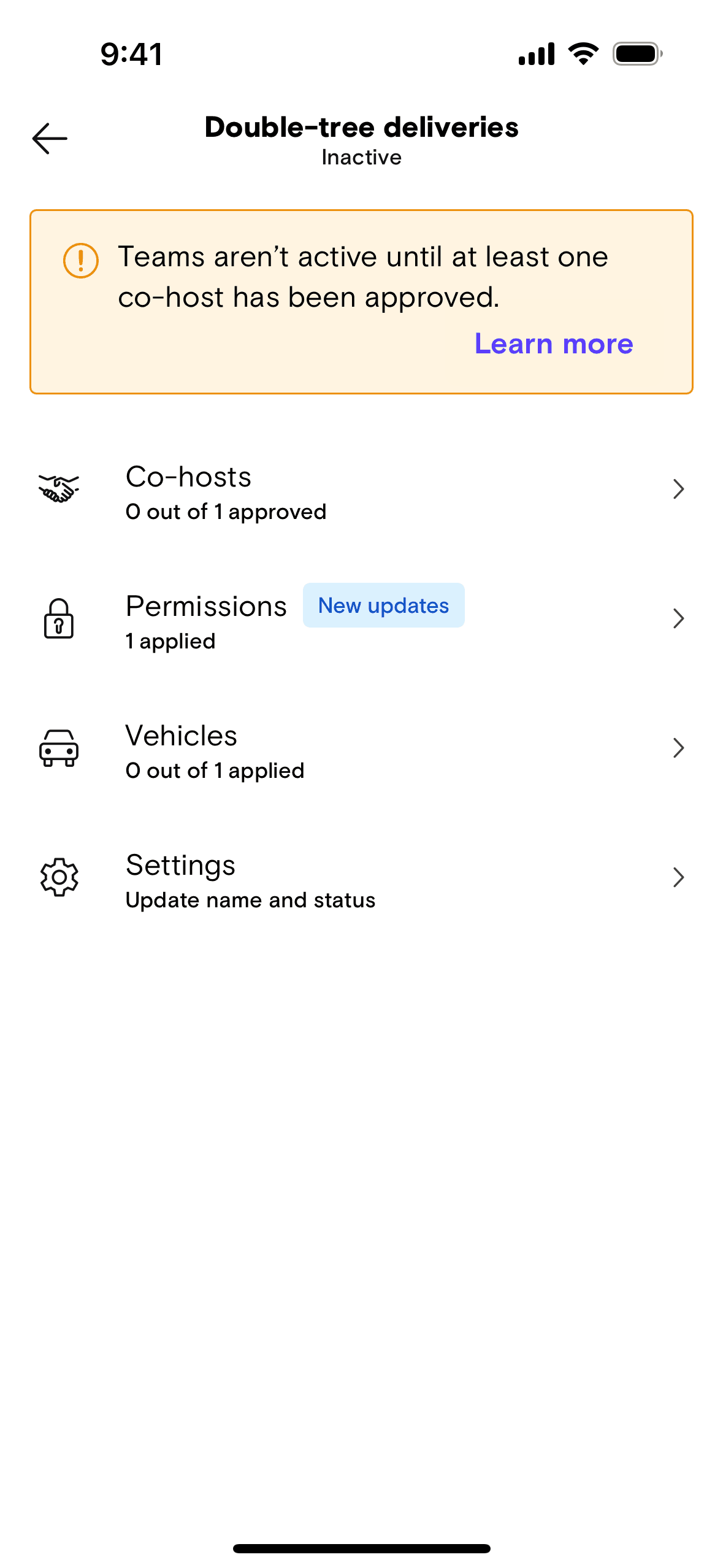 The user creates a new hosting team by providing team details, selecting vehicles, and adding a co-host. The team is initially inactive until the co-host is approved.