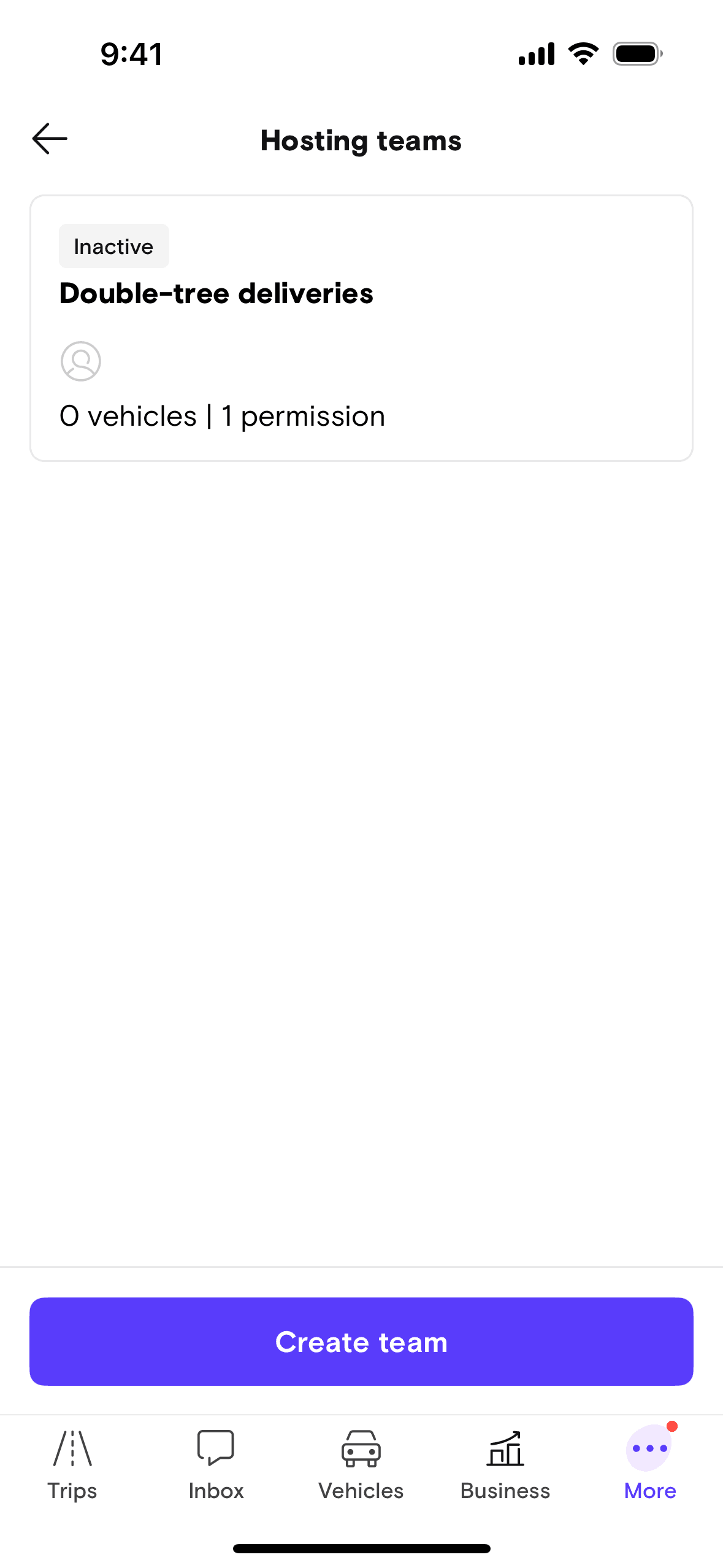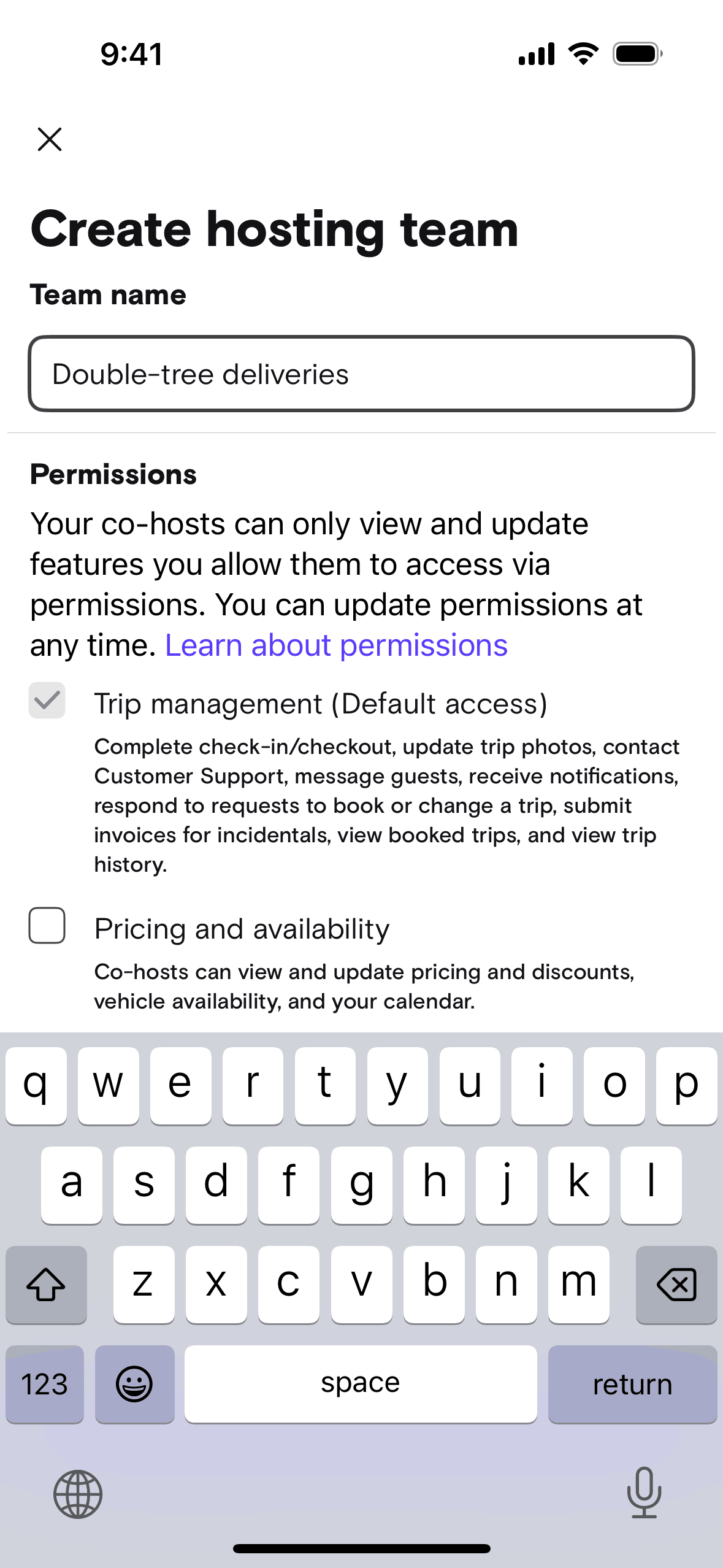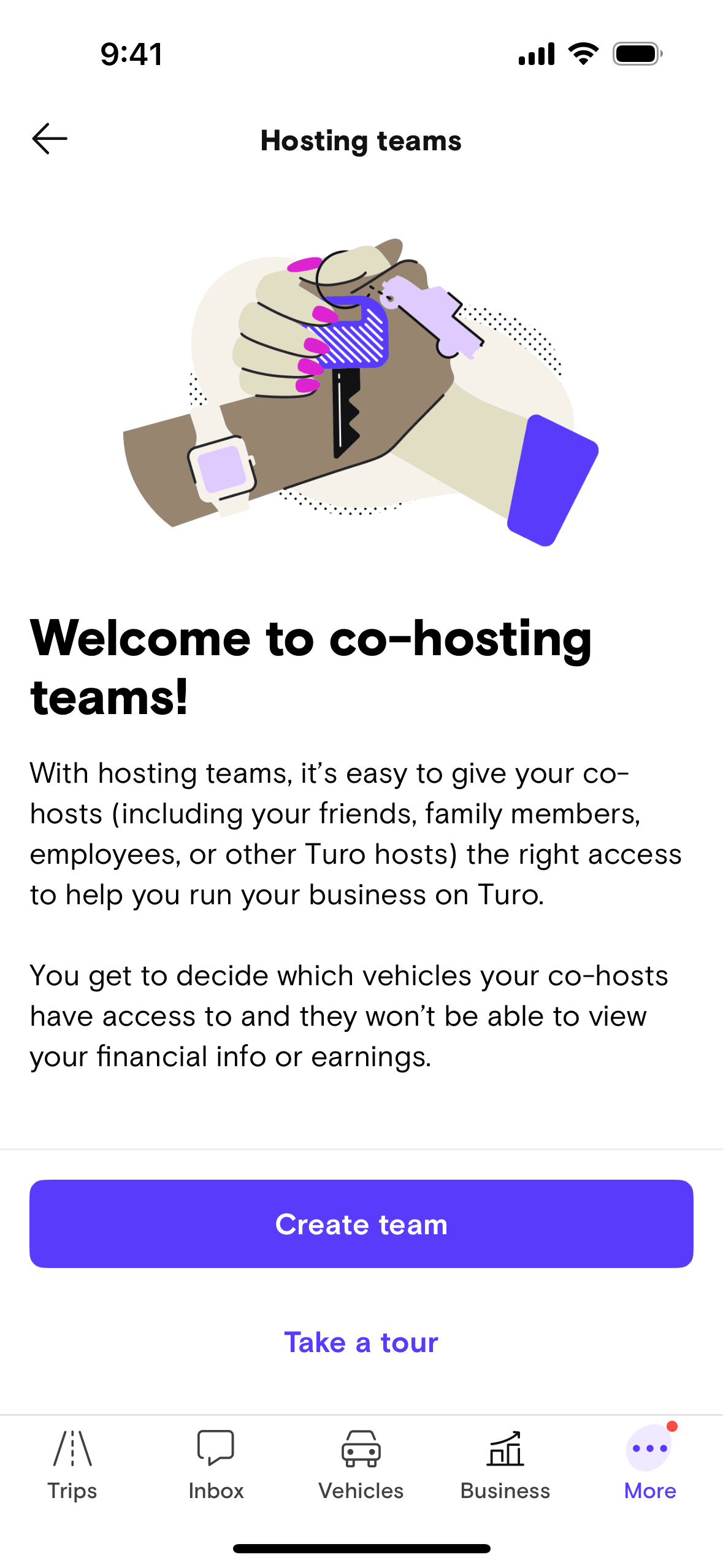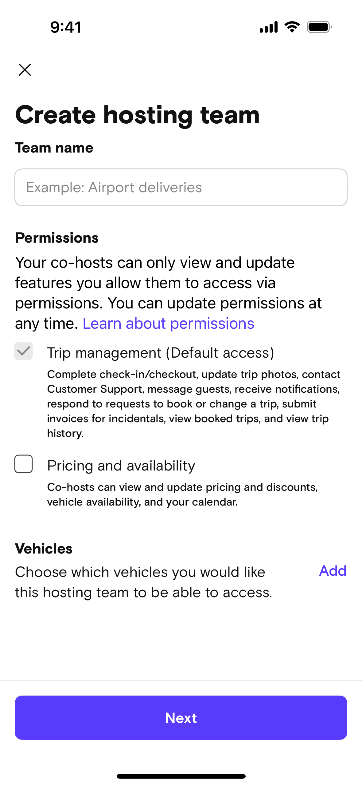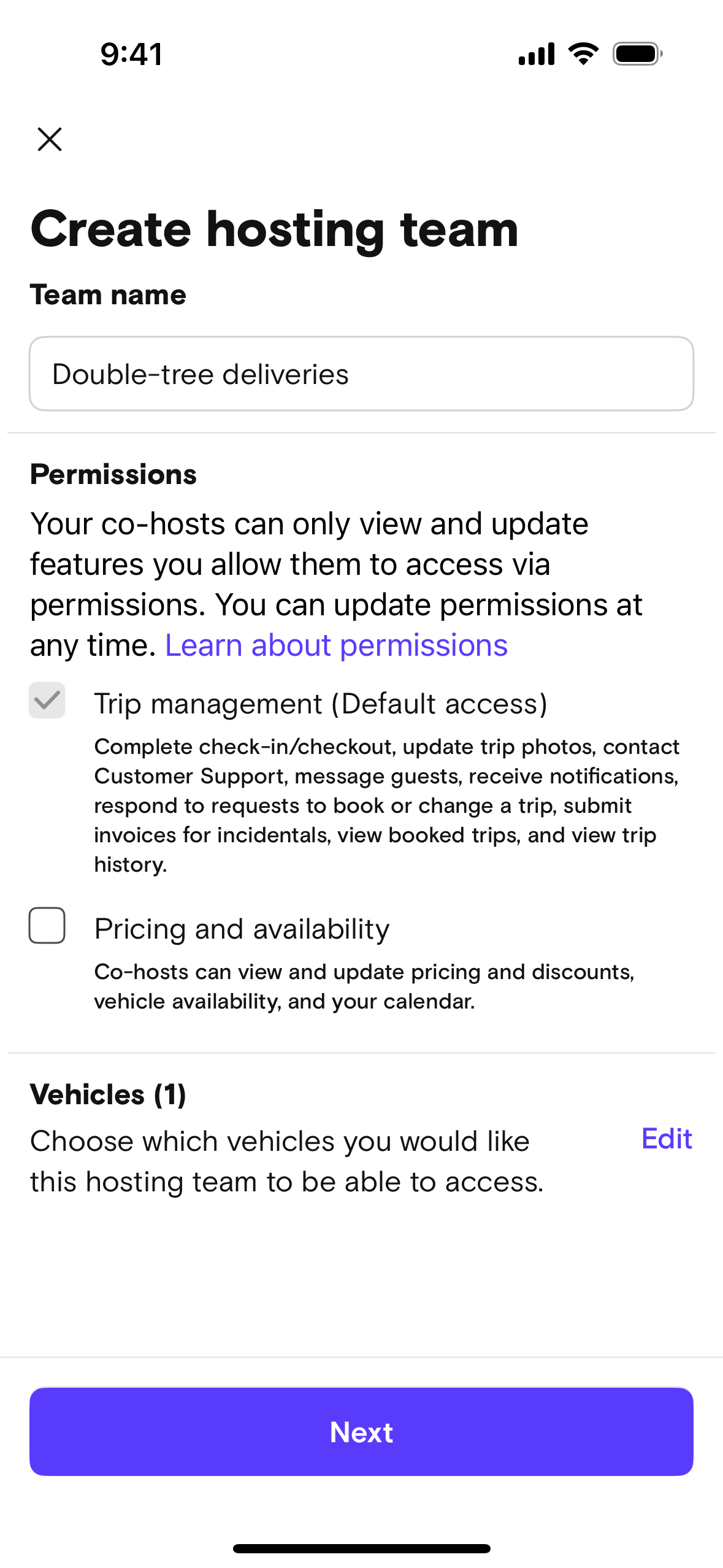 The user creates a new hosting team by providing team details, selecting vehicles, and adding a co-host. The team is initially inactive until the co-host is approved.