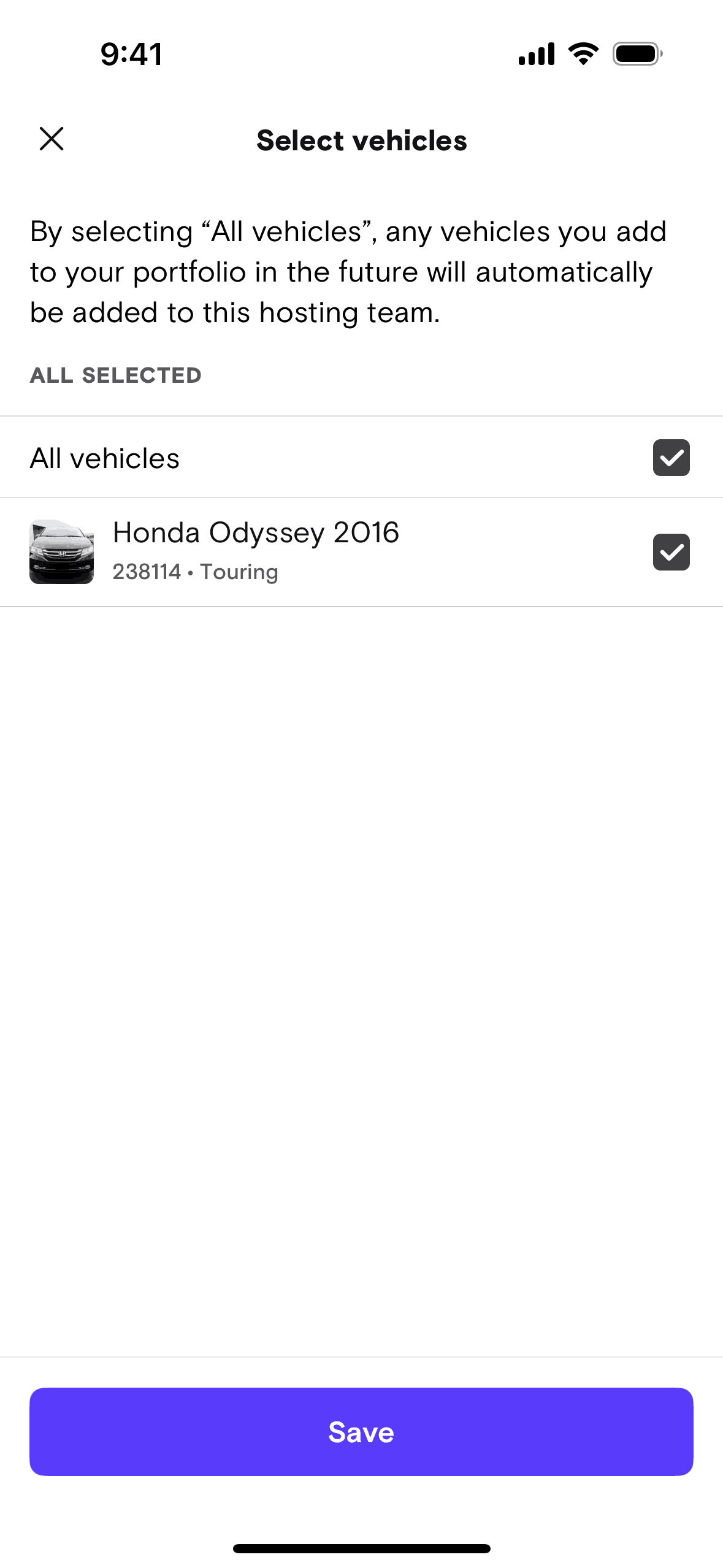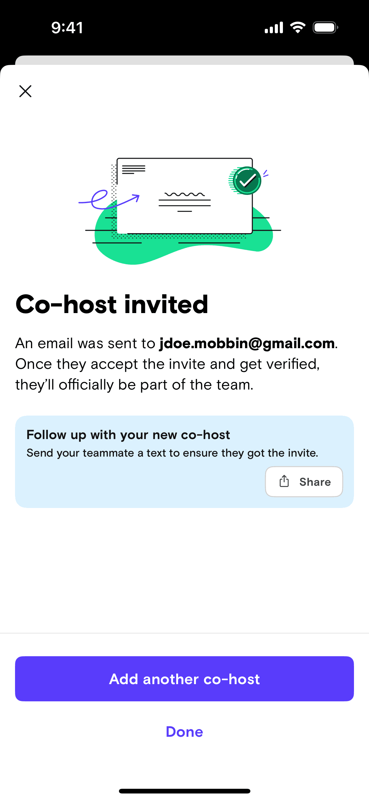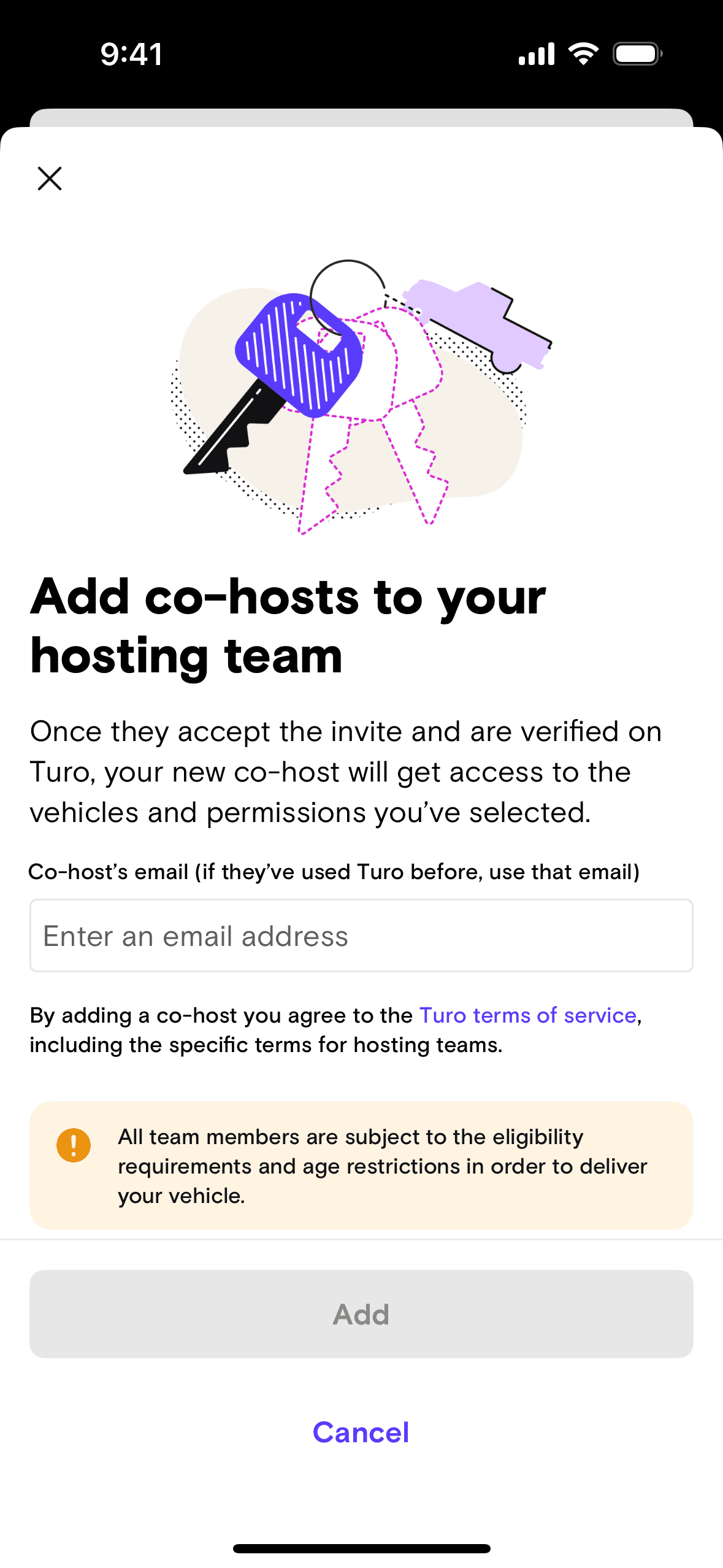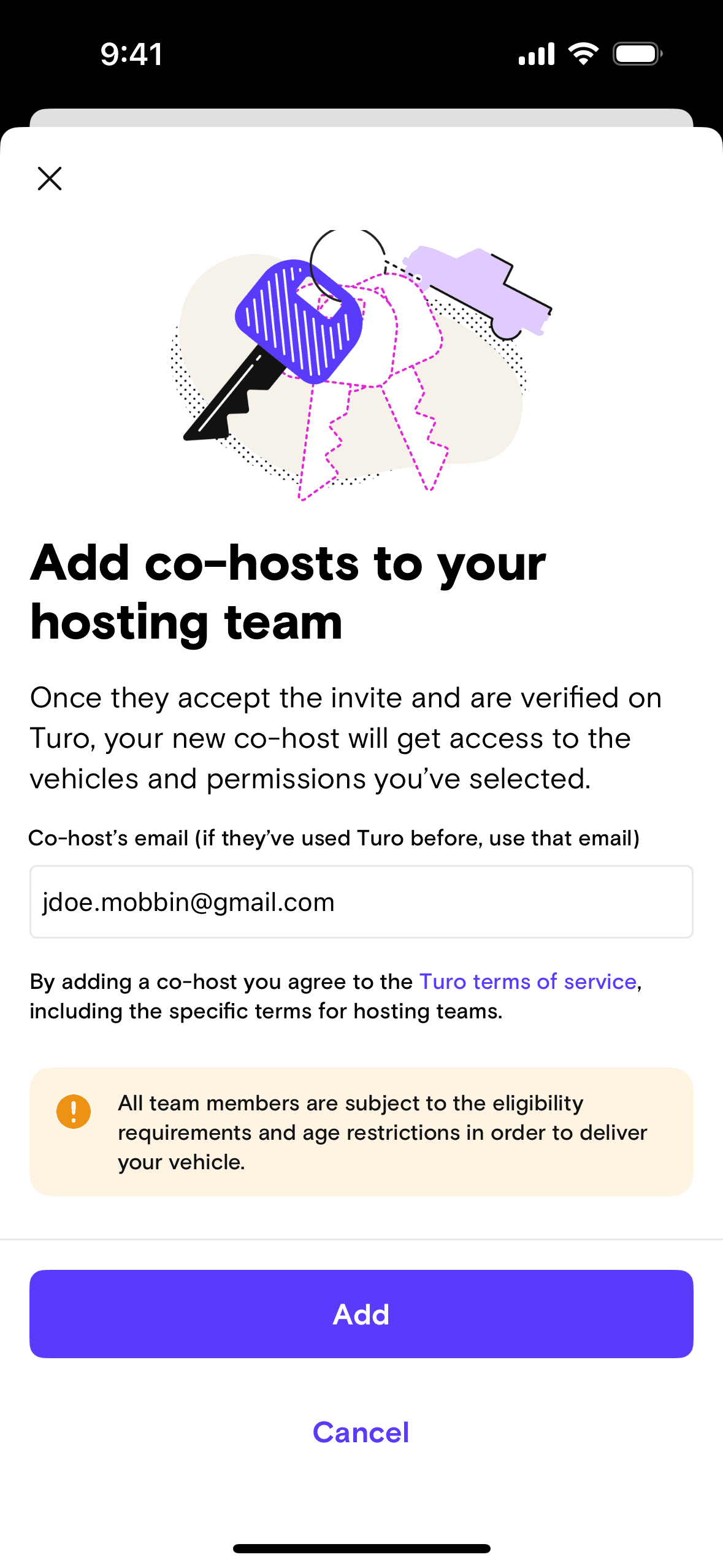 The user creates a new hosting team by providing team details, selecting vehicles, and adding a co-host. The team is initially inactive until the co-host is approved.