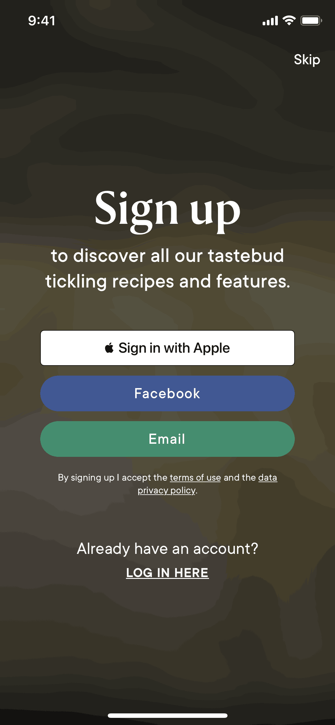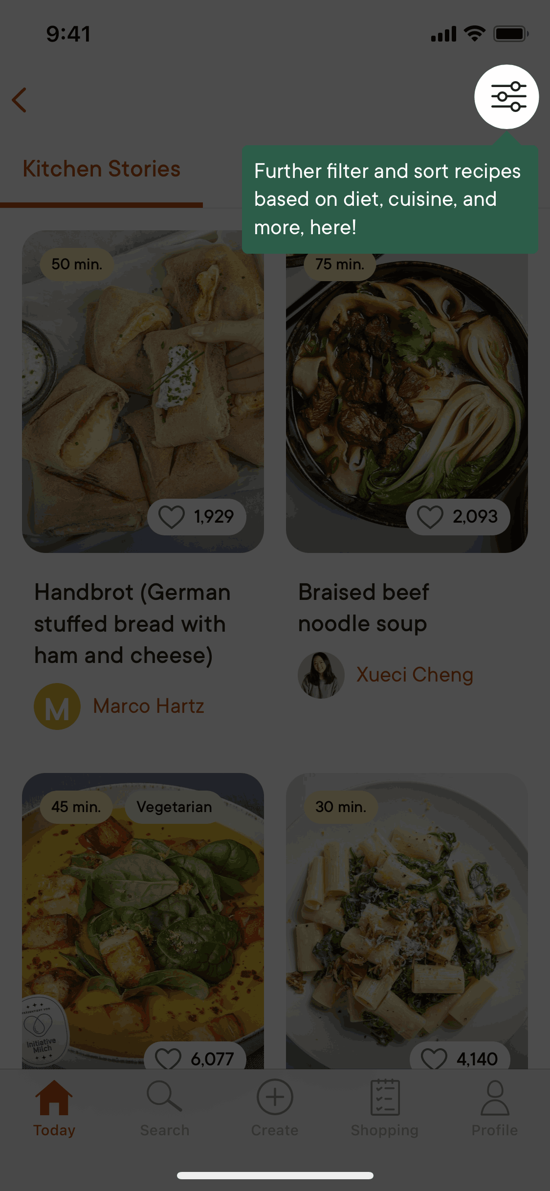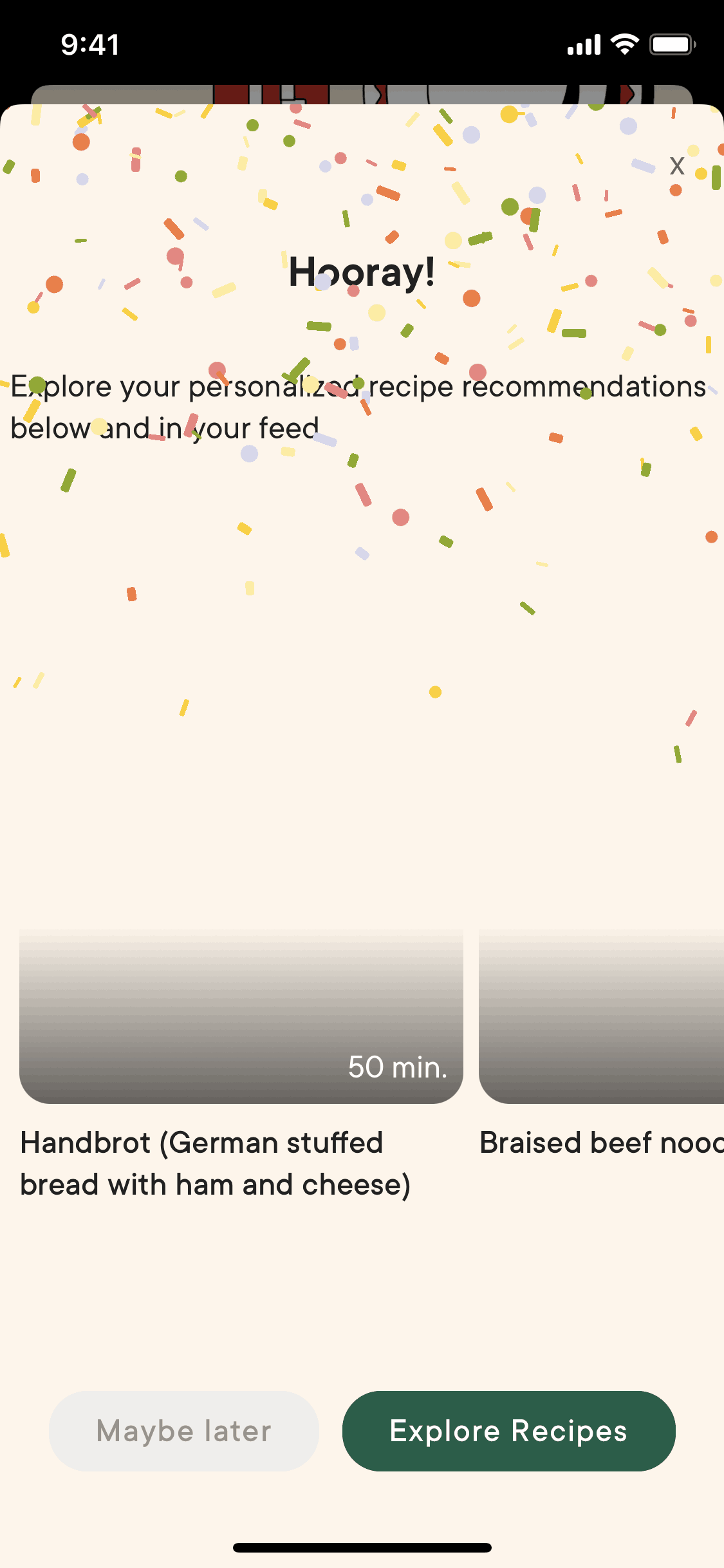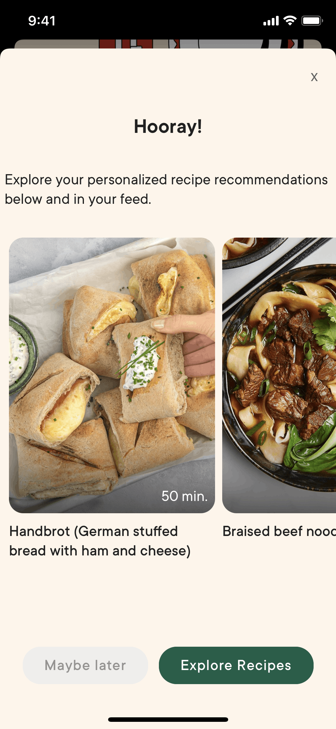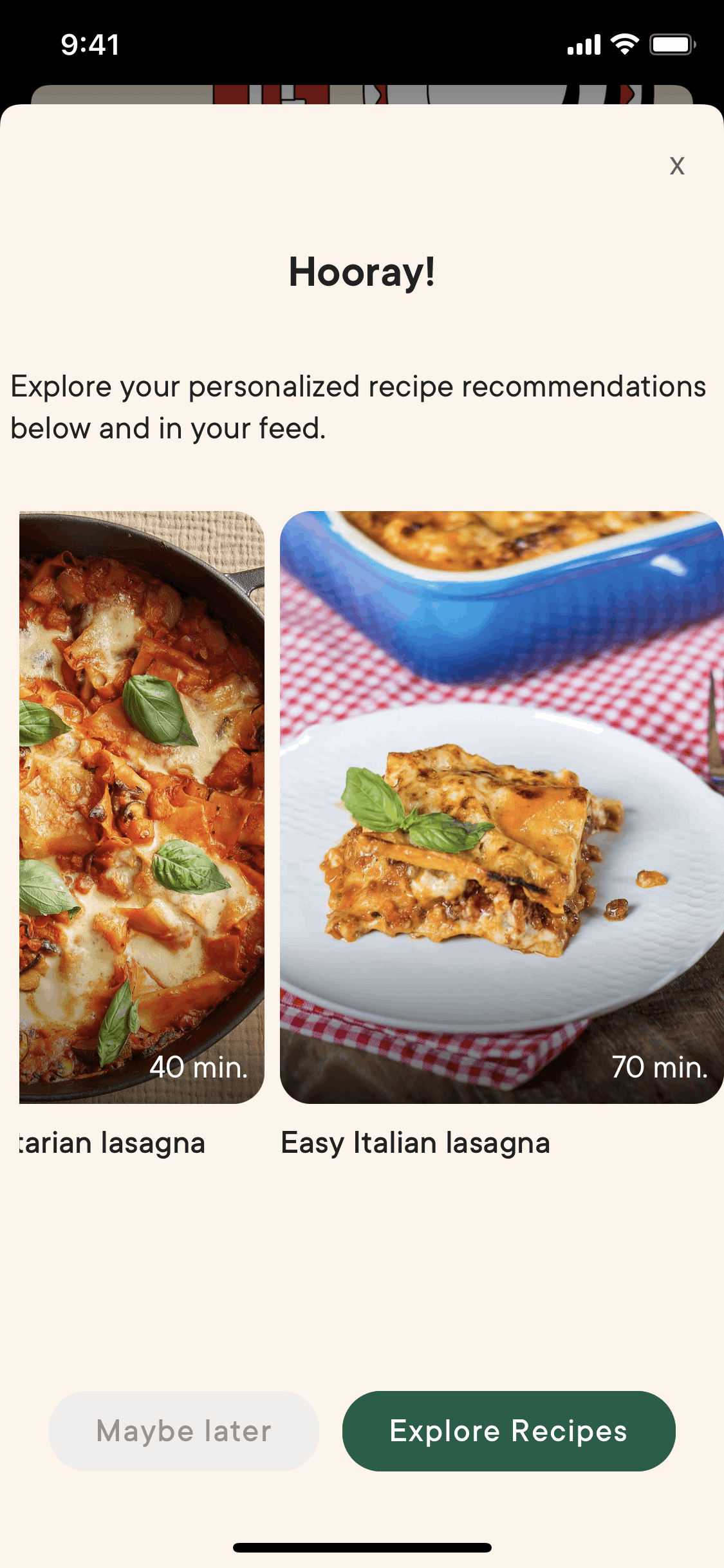 The user onboards, creates an account, personalizes preferences, and views recipe recommendations. They are then directed to the main recipe feed.