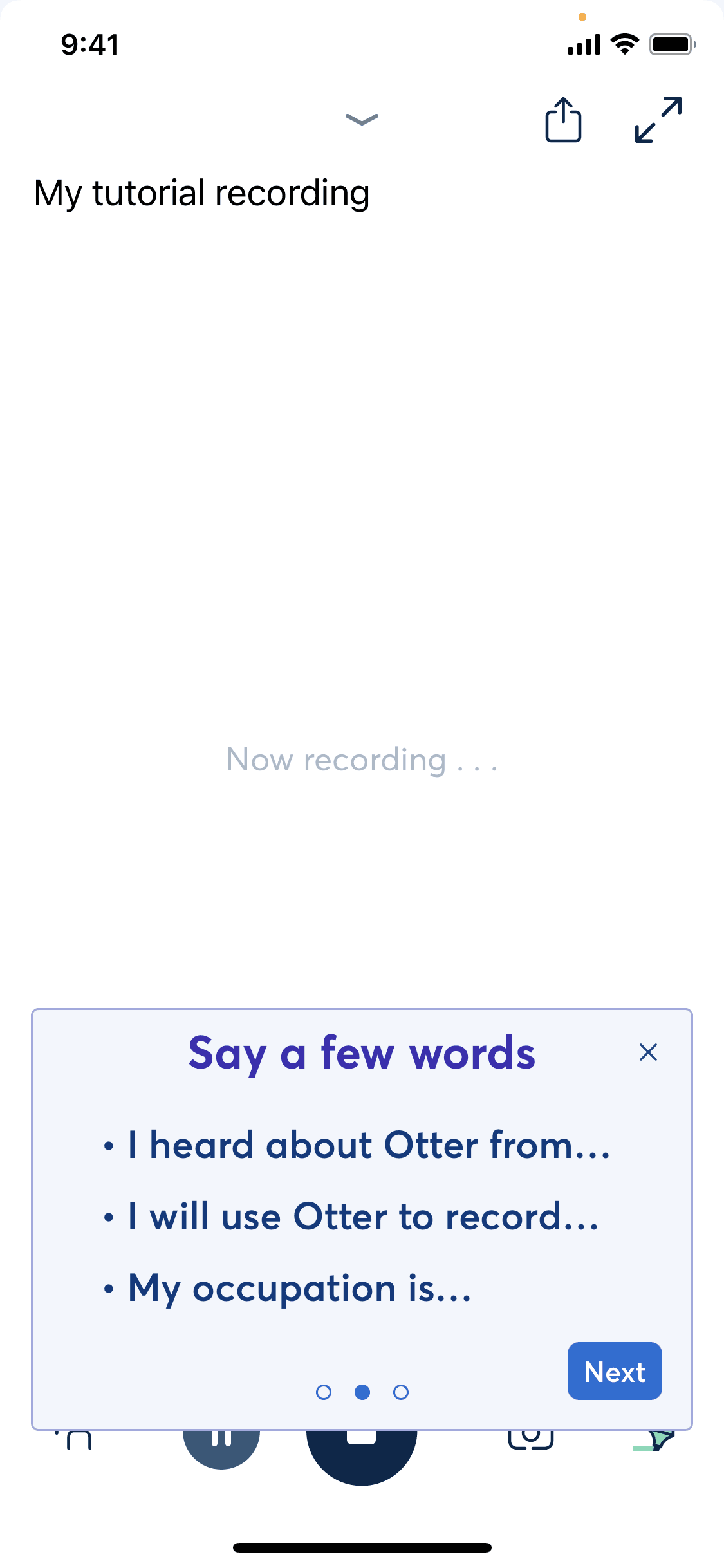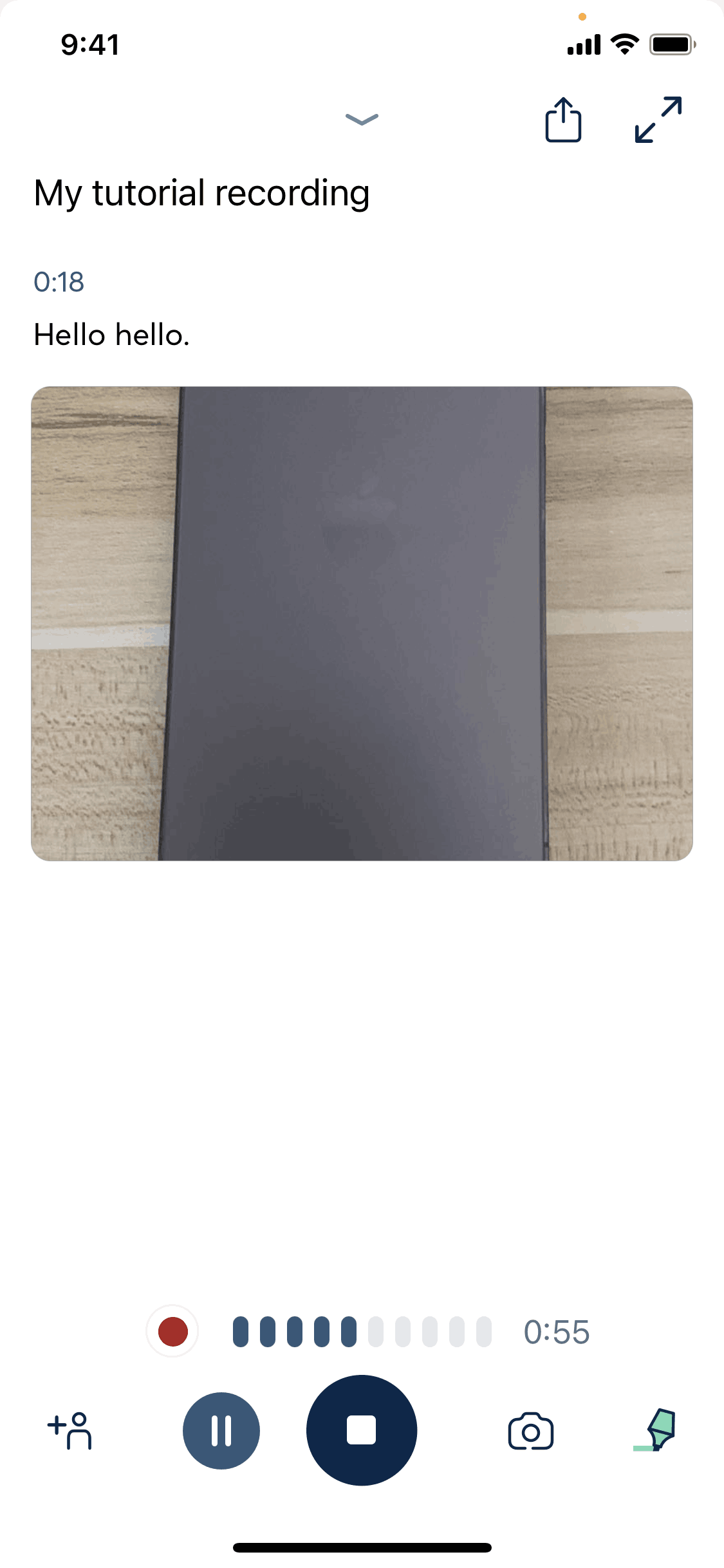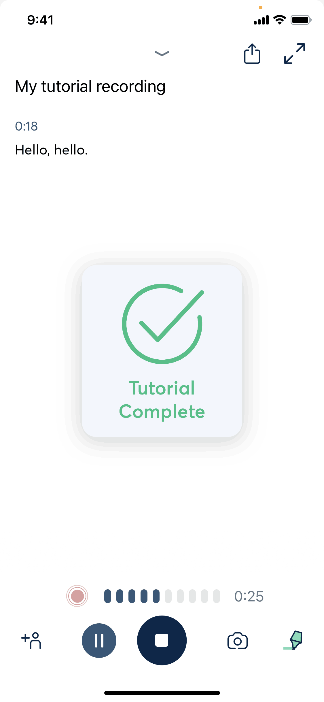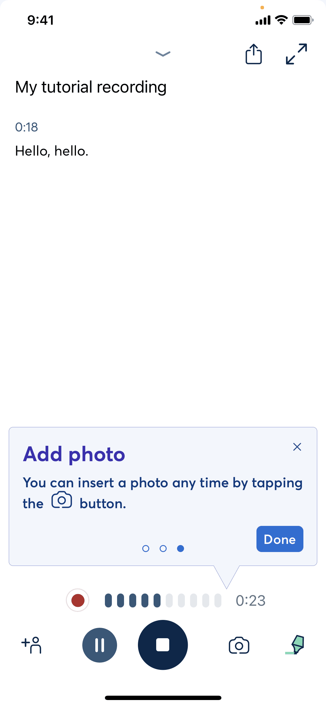 The user is guided through a recording tutorial, learning how to record audio and add a photo. The recording is then saved and processed.