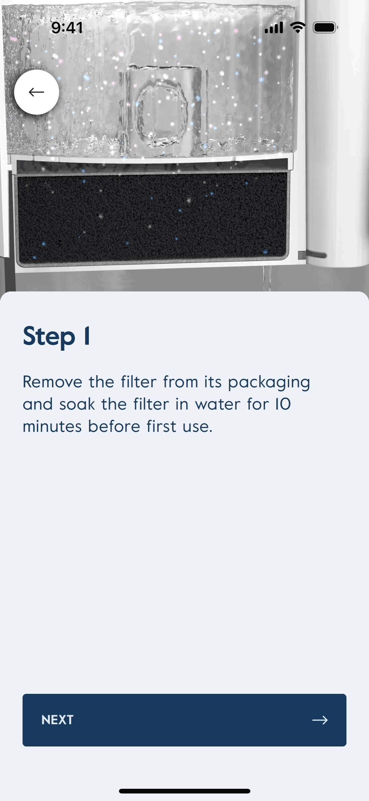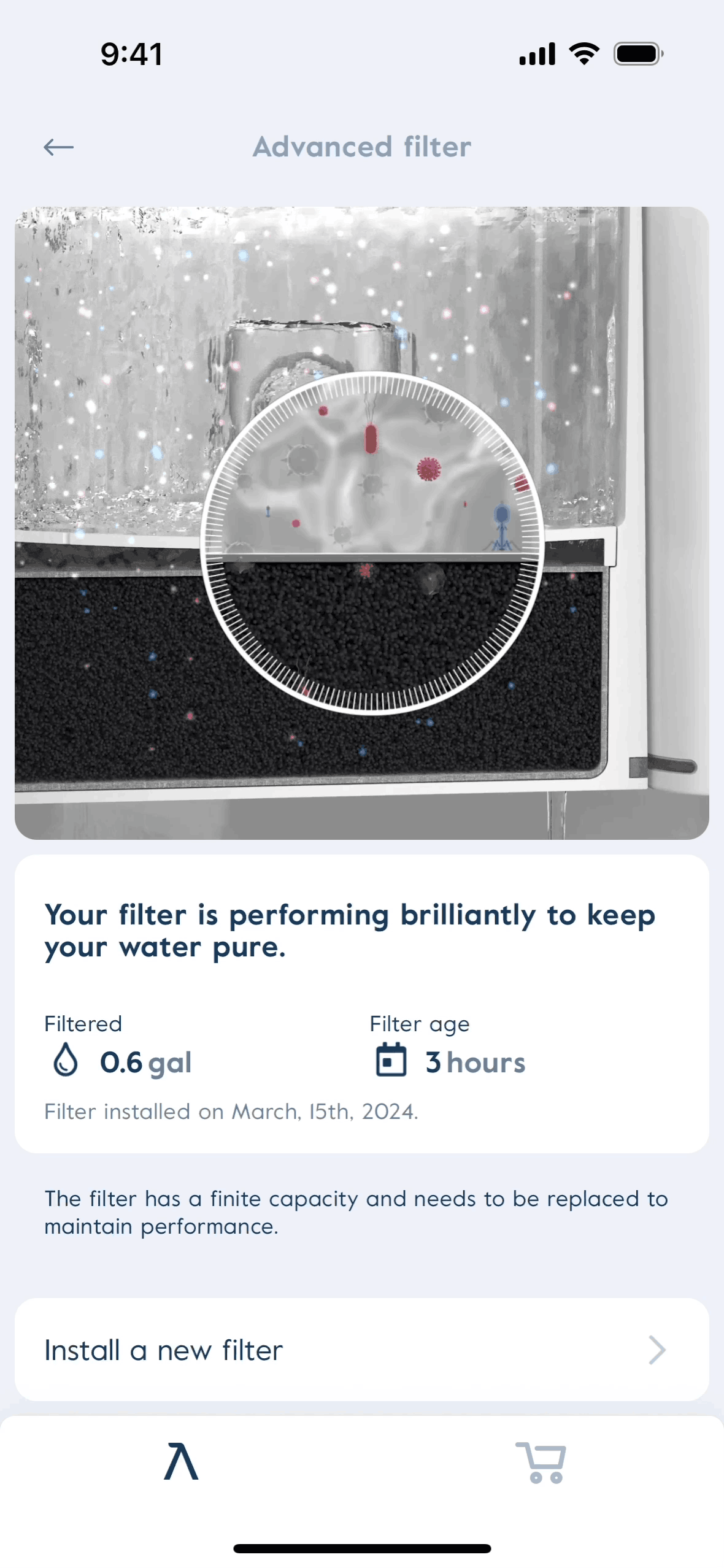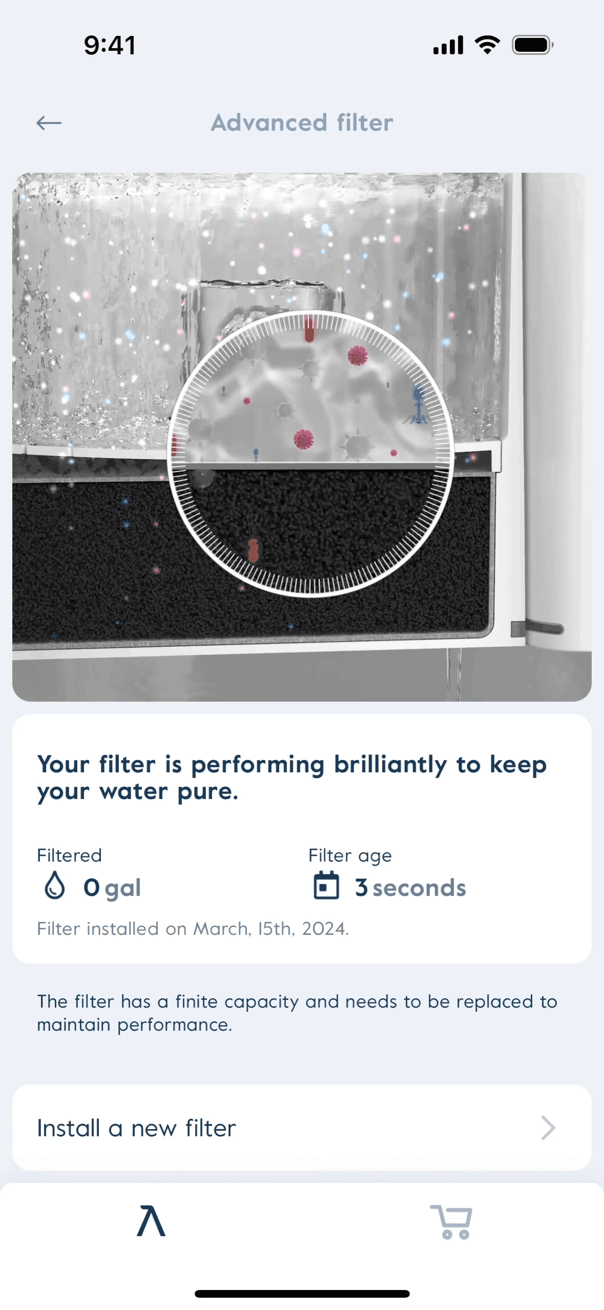 The user flow demonstrates installing a new water filter, starting from the dashboard, navigating through installation steps, and ending with updated filter details.